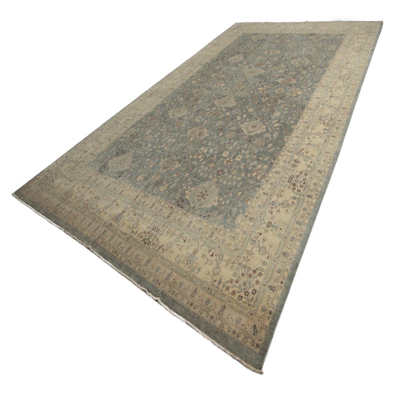 A large 10x14 rectangular Ziegler Persian rug featuring a detailed ivory border and a light blue field with intricate floral and medallion patterns.