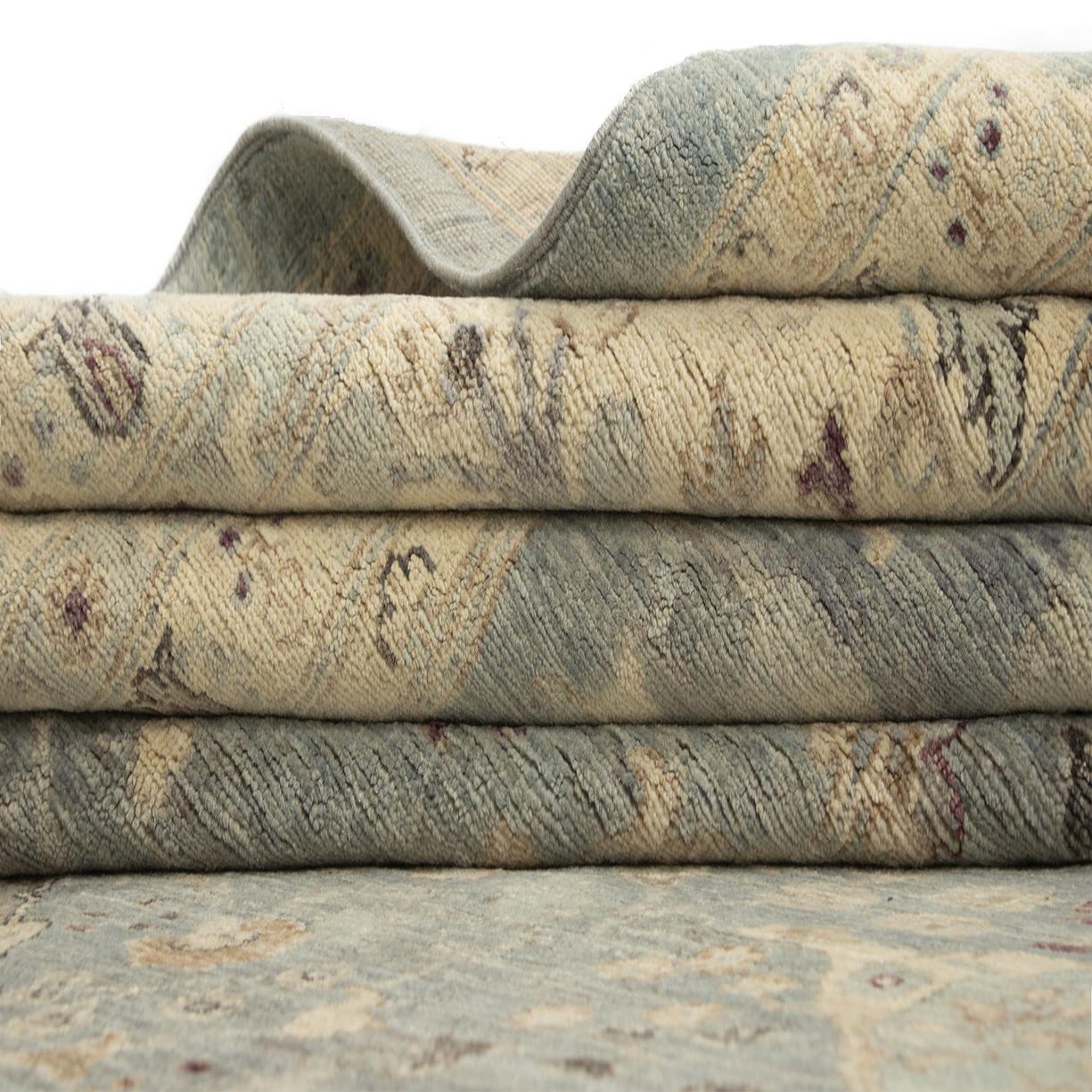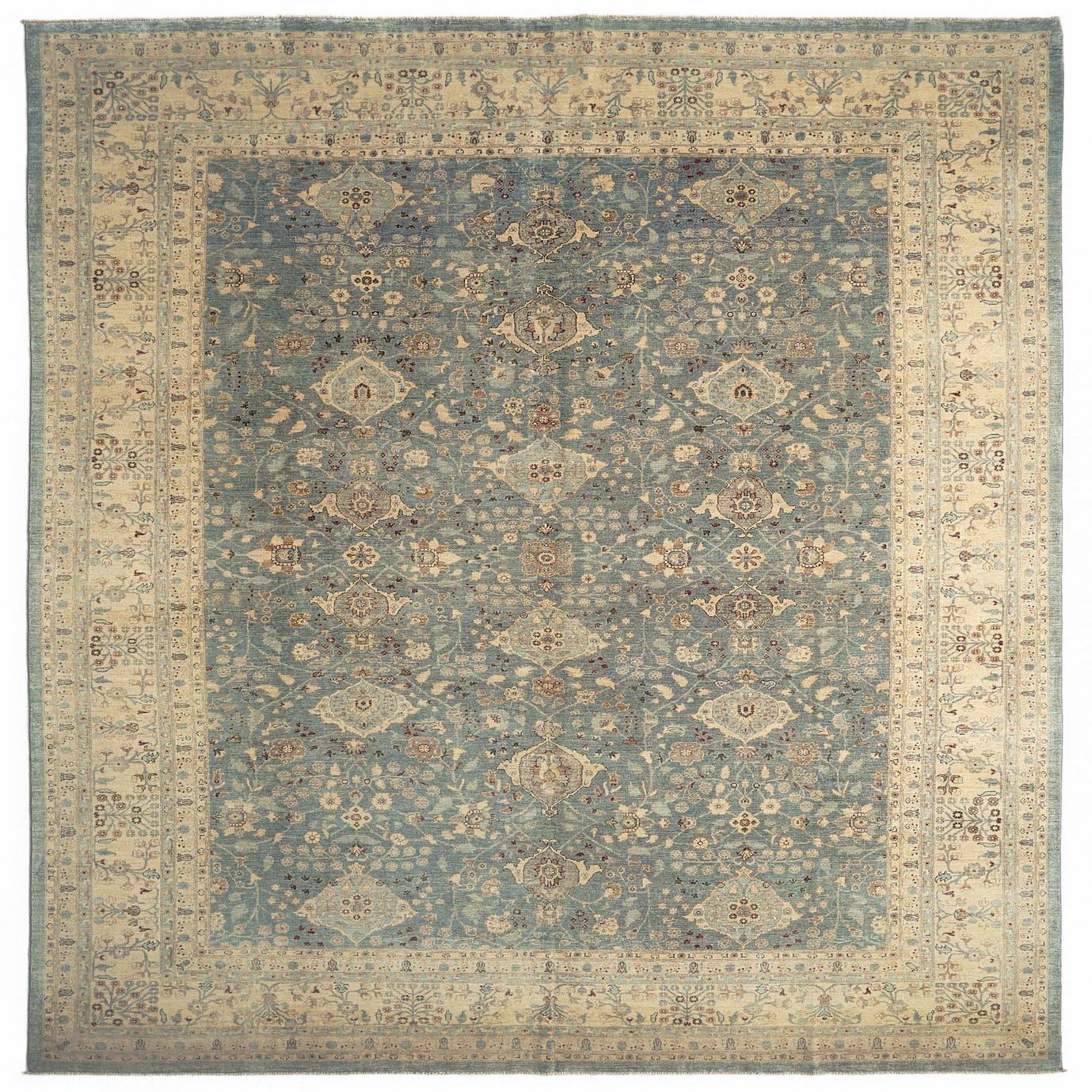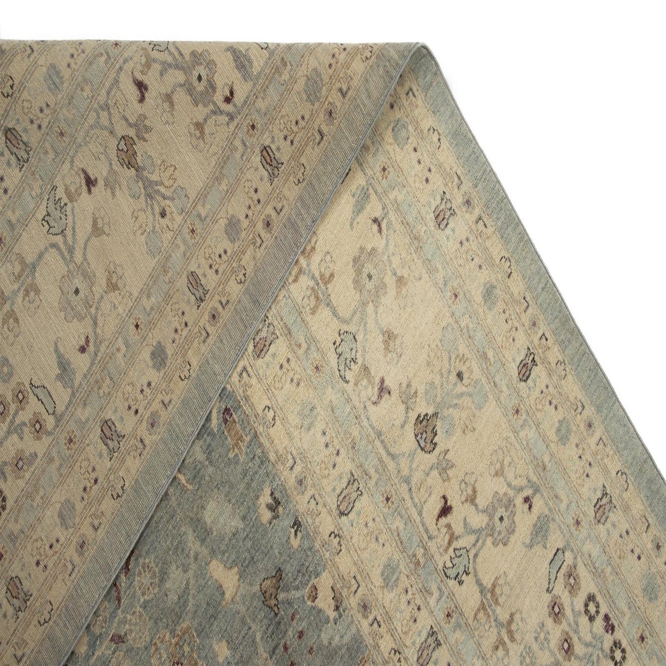 Handmade of 100% wool, the rug has a warm, natural woolen texture that feels plush underfoot while maintaining a low, even pile that keeps the design crisp. Place it beneath a living-room seating group to anchor sofas and a coffee table, under a dining table to ground a formal setting, or layered in a bedroom to introduce quiet pattern and warmth. The neutral cream and soft blue palette pairs easily with natural wood furniture, linen upholstery and both traditional and transitional interiors.