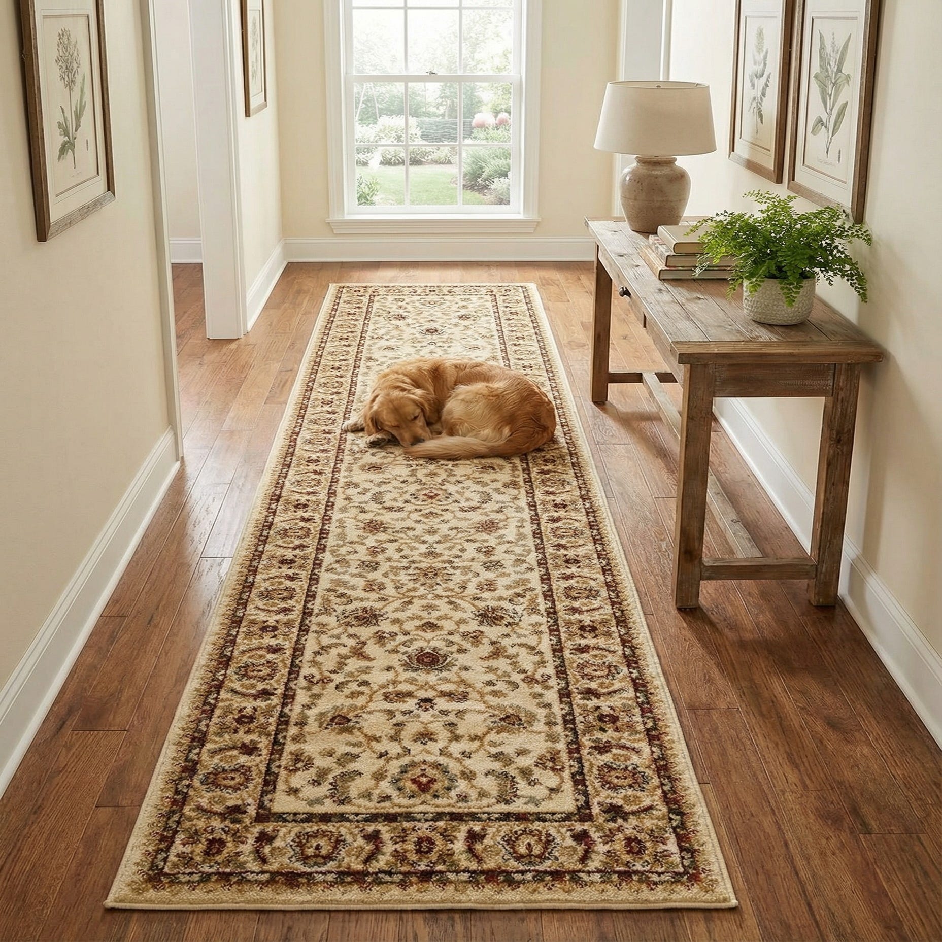 Primary color is Cream. Colors in this rug include: Cream, Brown, Green, Light Blue, Red, Rust Red, Tan.