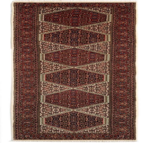 Primary color is Cream. Colors in this rug include: Cream, Cream, Red, Black, Brown, Green, Pink.