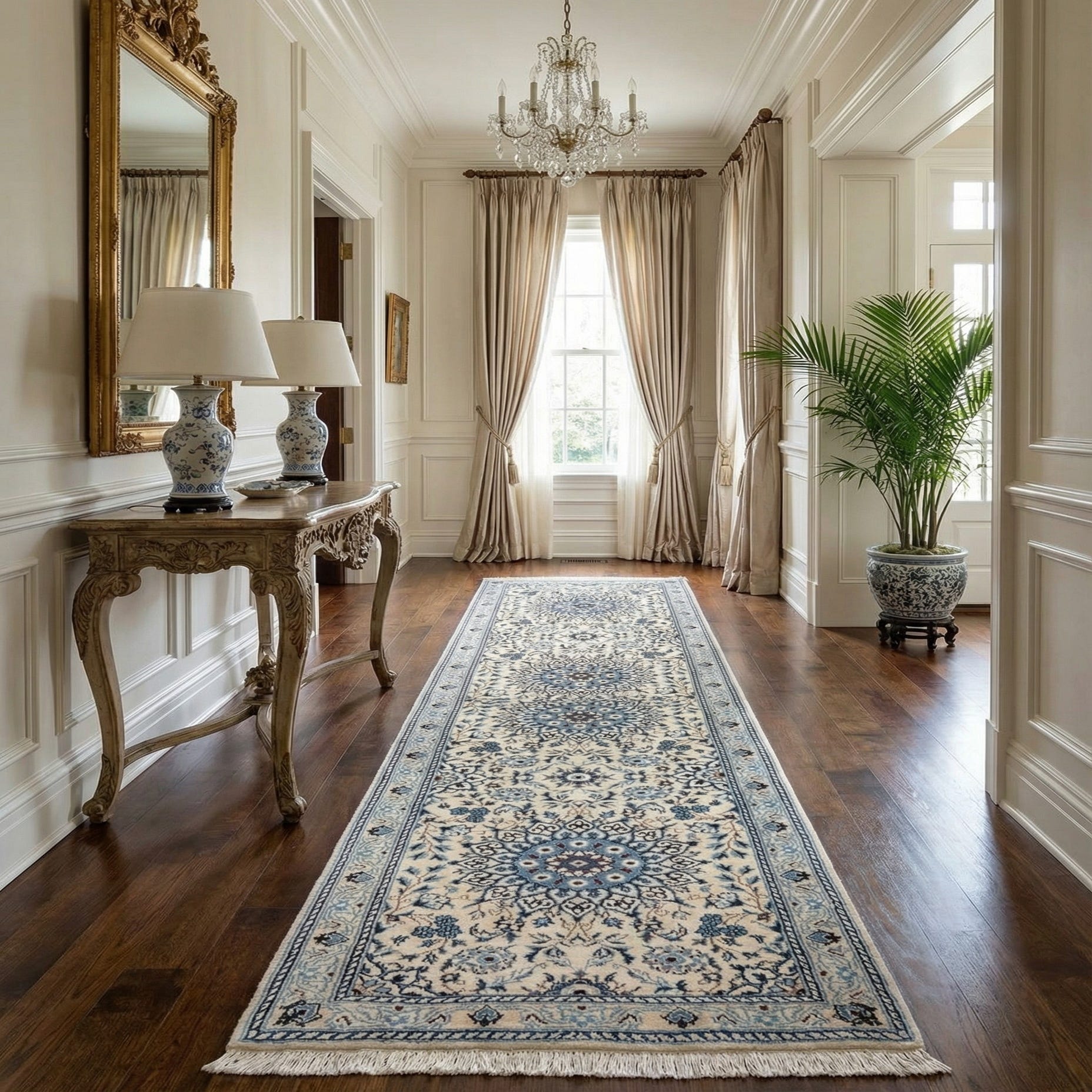 A 12 ft handmade wool runner rug in ivory and blue with an intricate Persian floral pattern, ideal for hallways.