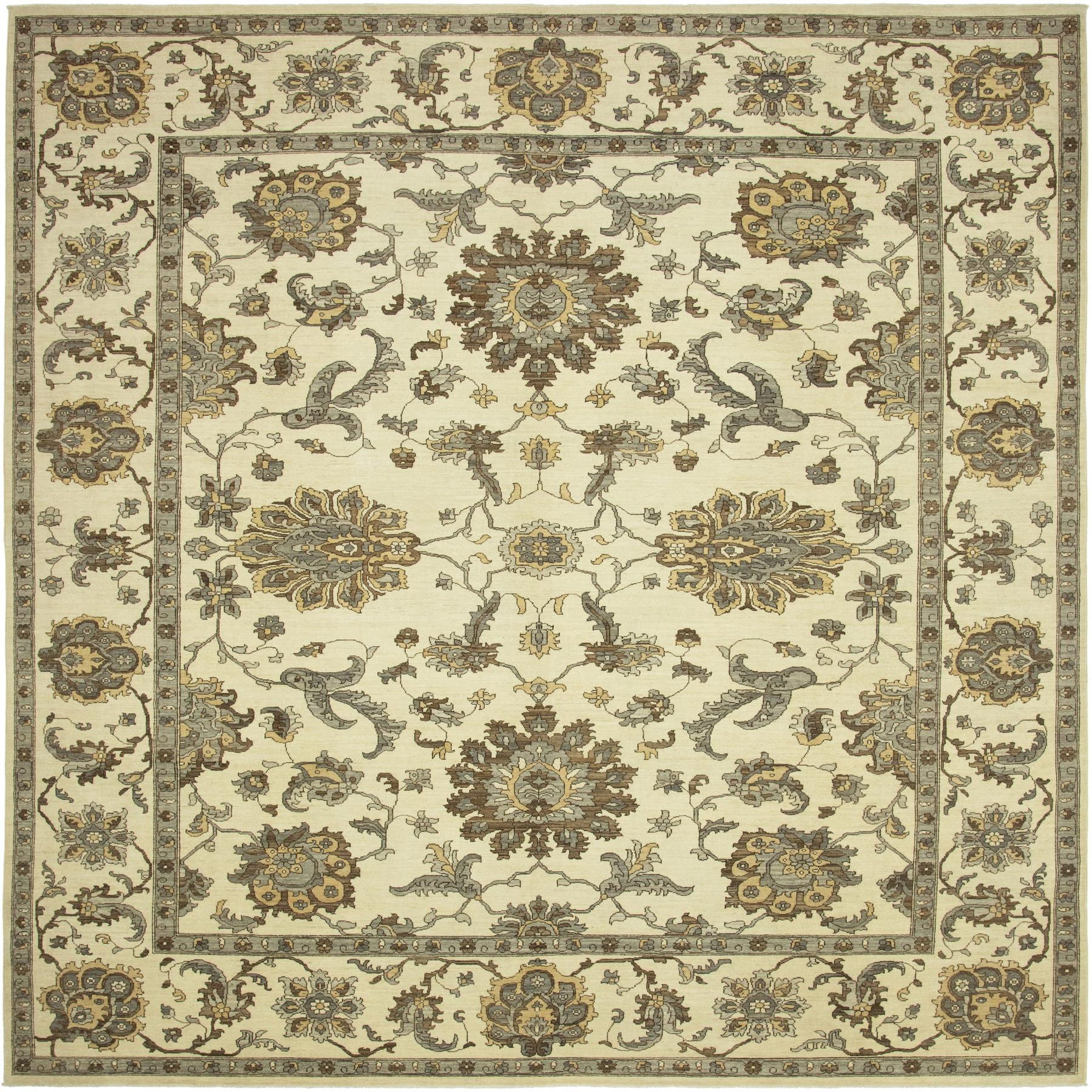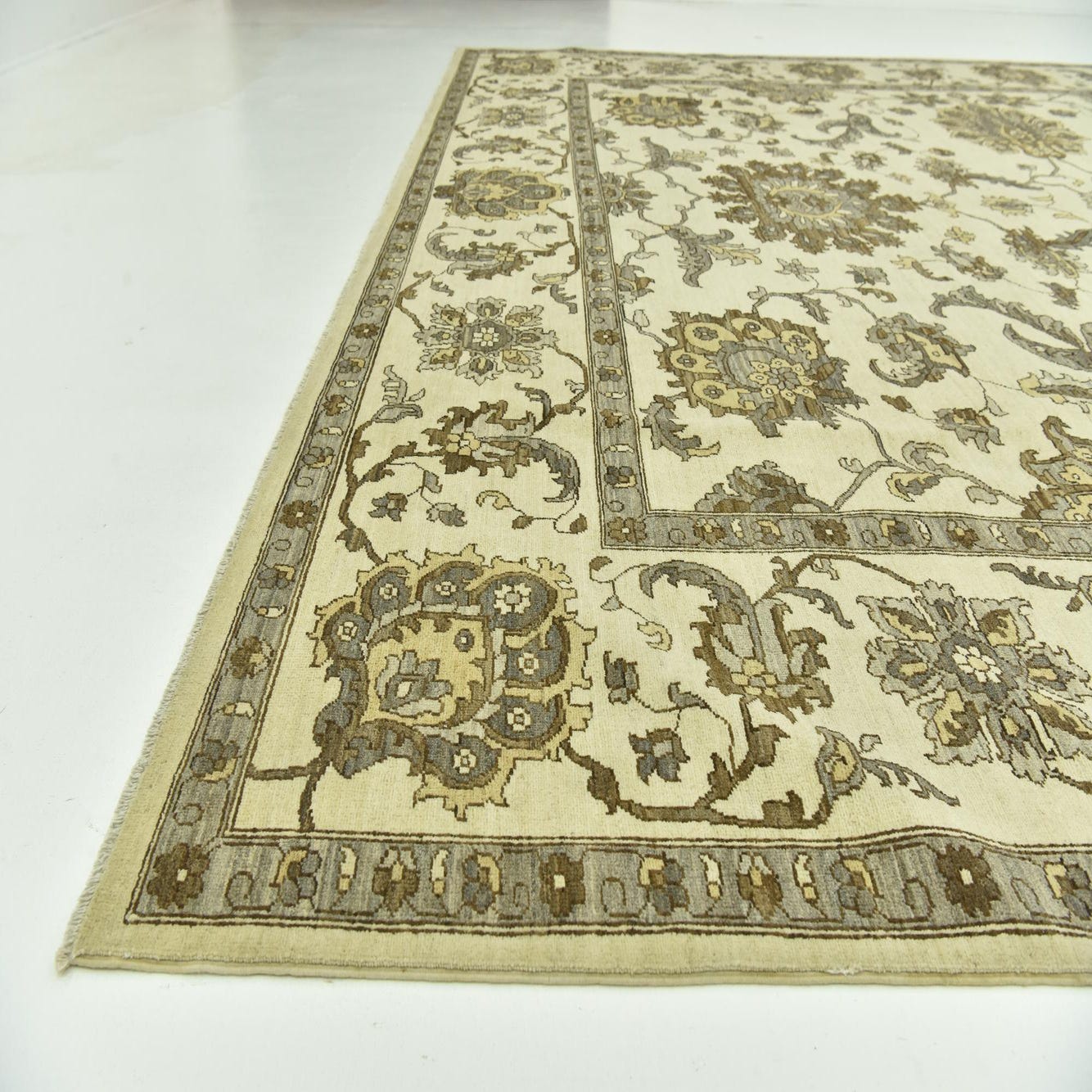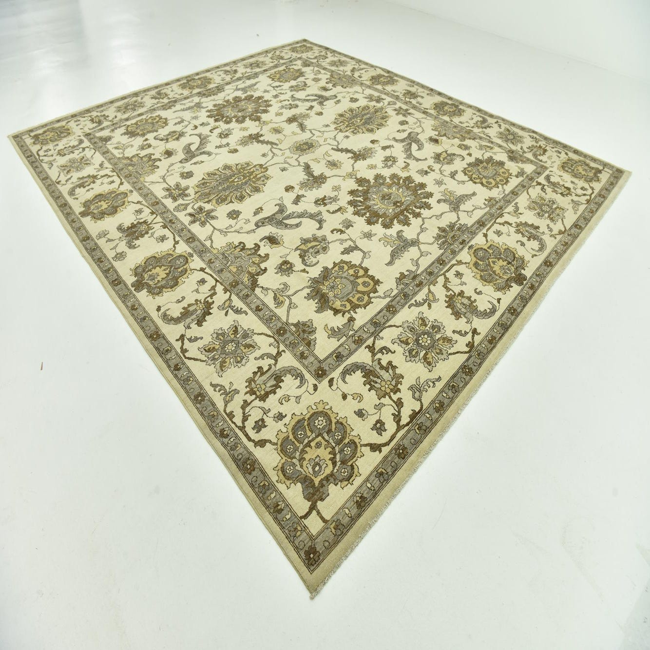 A 12x15 rectangular ivory and cream wool rug with a traditional botanical and floral pattern, featuring brown and grey accents.