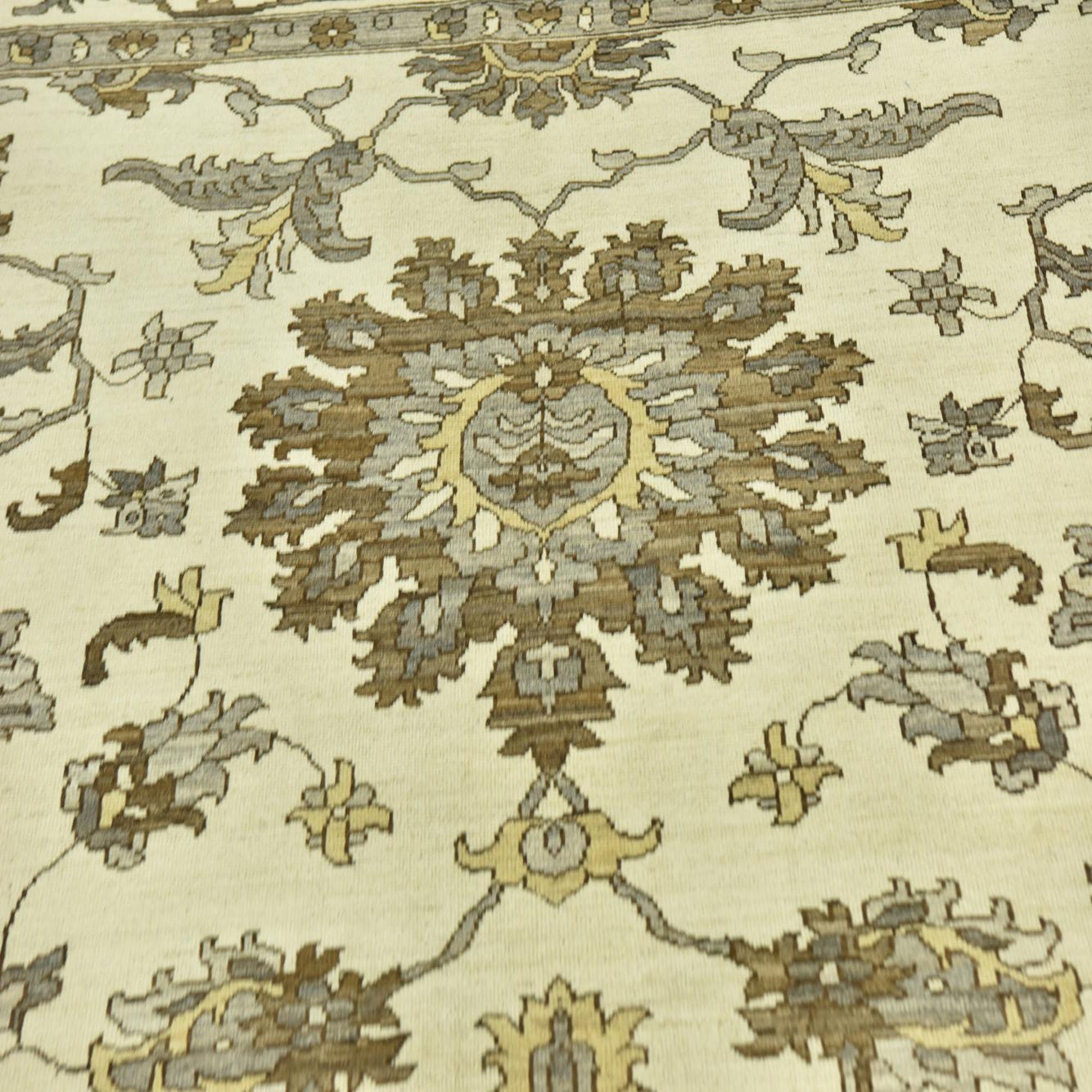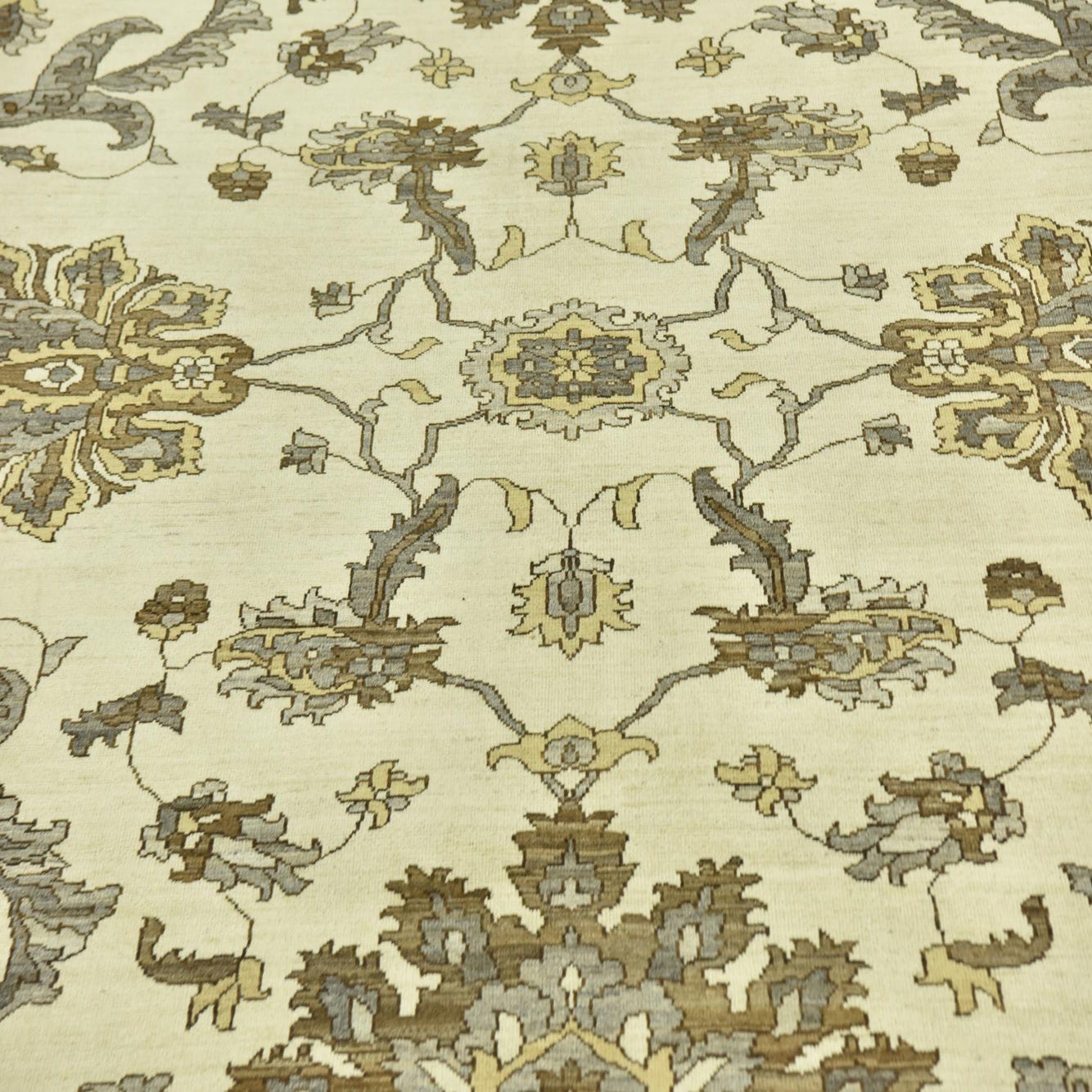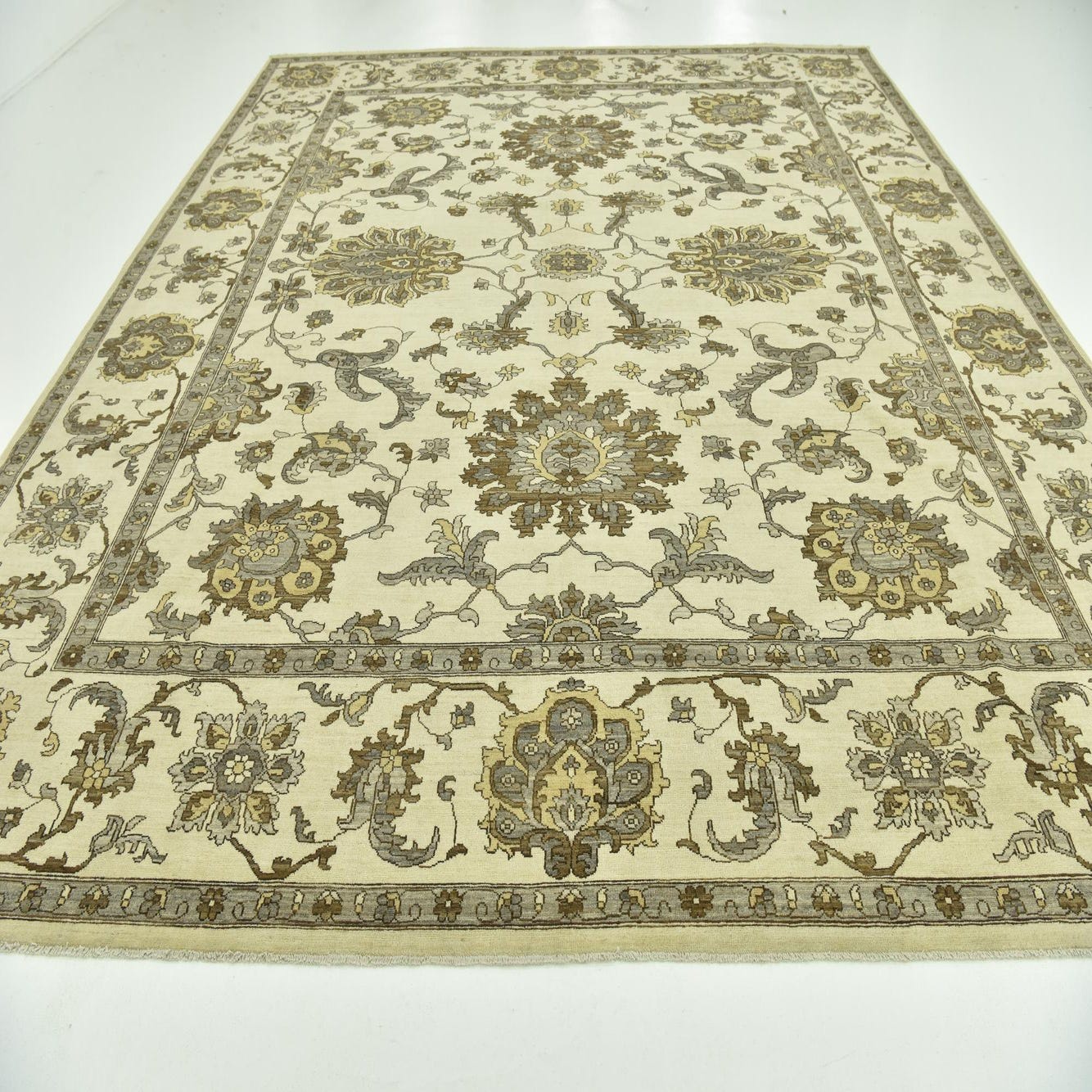 A 12x15 rectangular ivory and cream wool rug with a traditional botanical and floral pattern, featuring brown and grey accents.