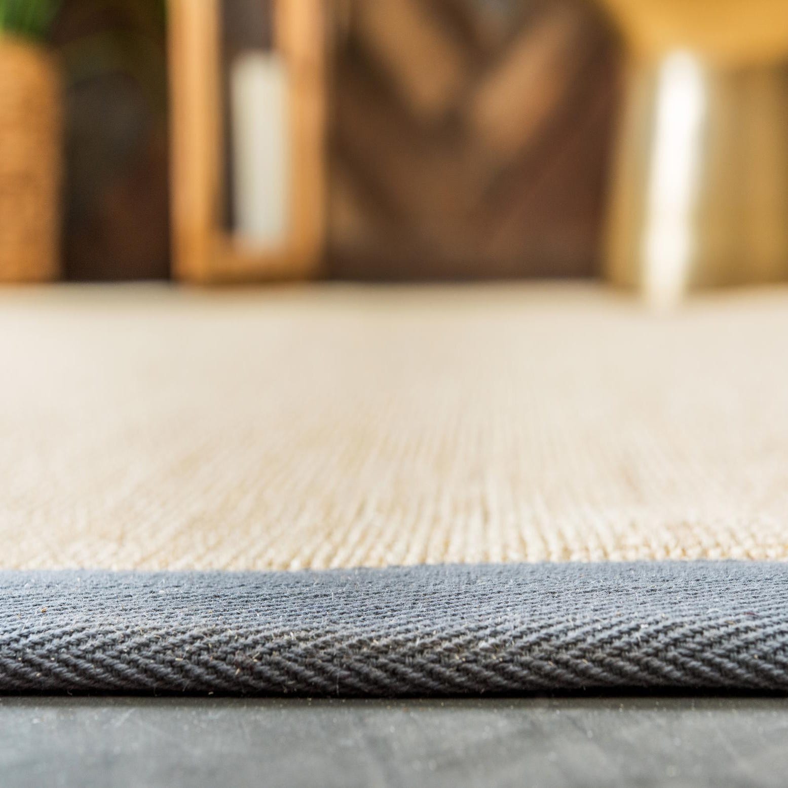 100% Natural Sisal. Handcrafted with a 2" cotton twill border and meticulously finished with non-slip backing.