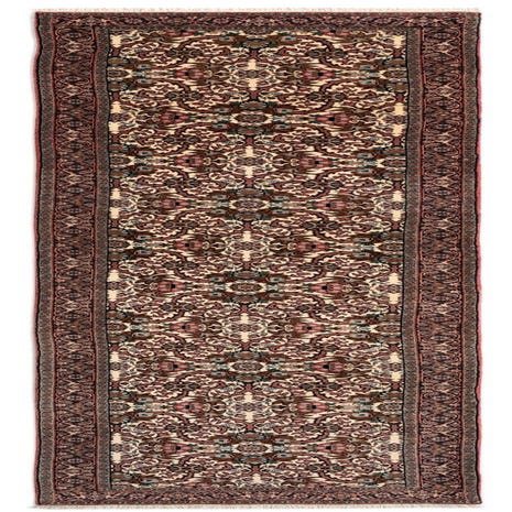 The defined border frames the ornate central motif, articulating a sense of structure and tradition. The woolen fibers grant both warmth and durability, suited to high-traffic areas such as hallways and living spaces. The rich colors and detailed patterns would serve well in interiors that embrace classic, traditional, or even eclectic styles. The rug's robust palette and design would pair effectively with both rich wooden furniture pieces and more subdued decor elements, allowing for flexible integration into existing design schemes.