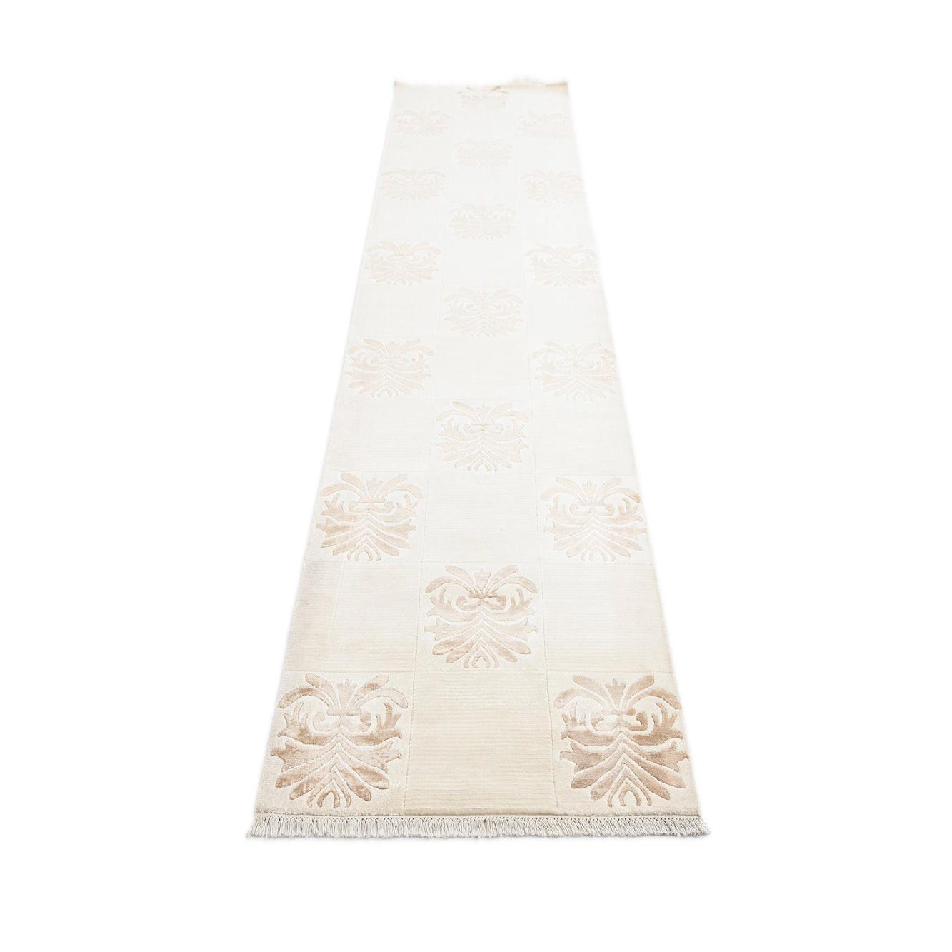 A 13 ft ivory runner rug with a modern Persian pattern of alternating cream damask motifs and striped squares, ideal for a hallway.