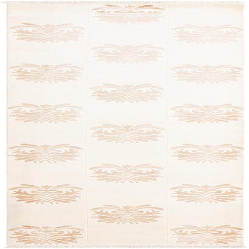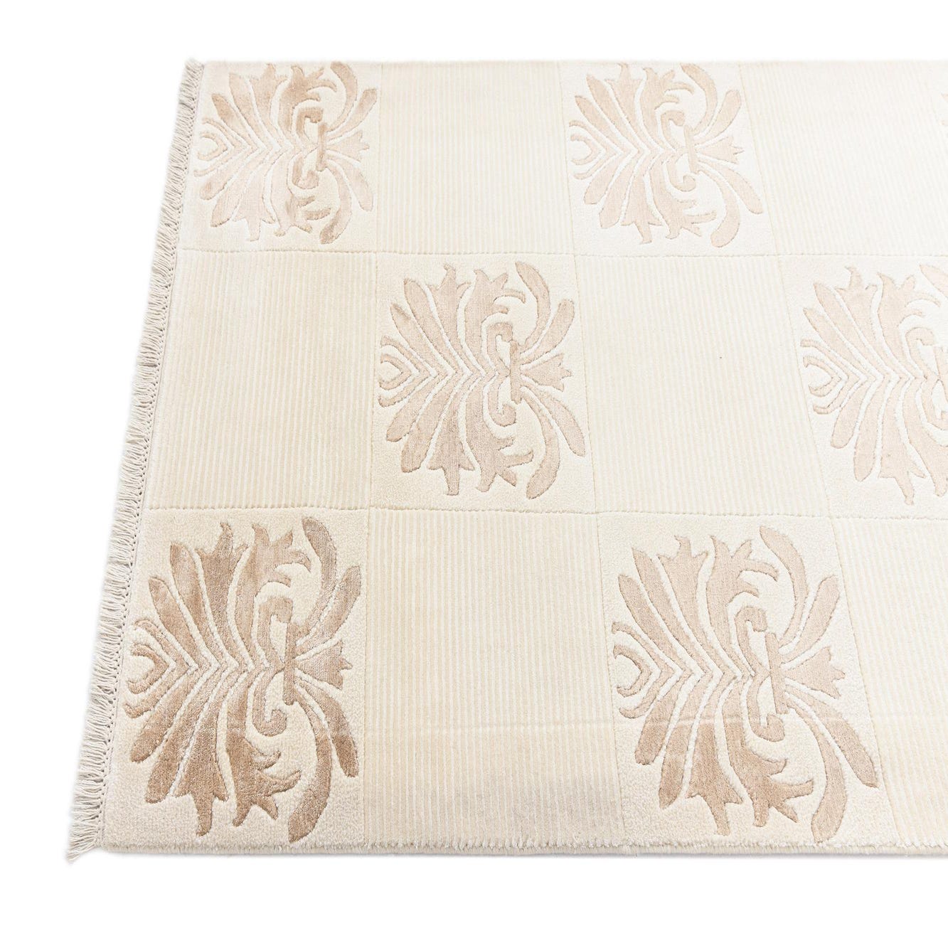 Cream forms a calm, airy ground for a repeating stylized medallion motif in warm beige, set within subtle square blocks that create a measured, checkerboard rhythm. The design is hand made of wool and cotton: short, dense wool pile defines each ornamental motif while the cotton flat-weave background offers a smooth, slightly ribbed contrast. Light fringe at the ends and the soft low pile give the runner a tailored, tactile quality that invites touch.