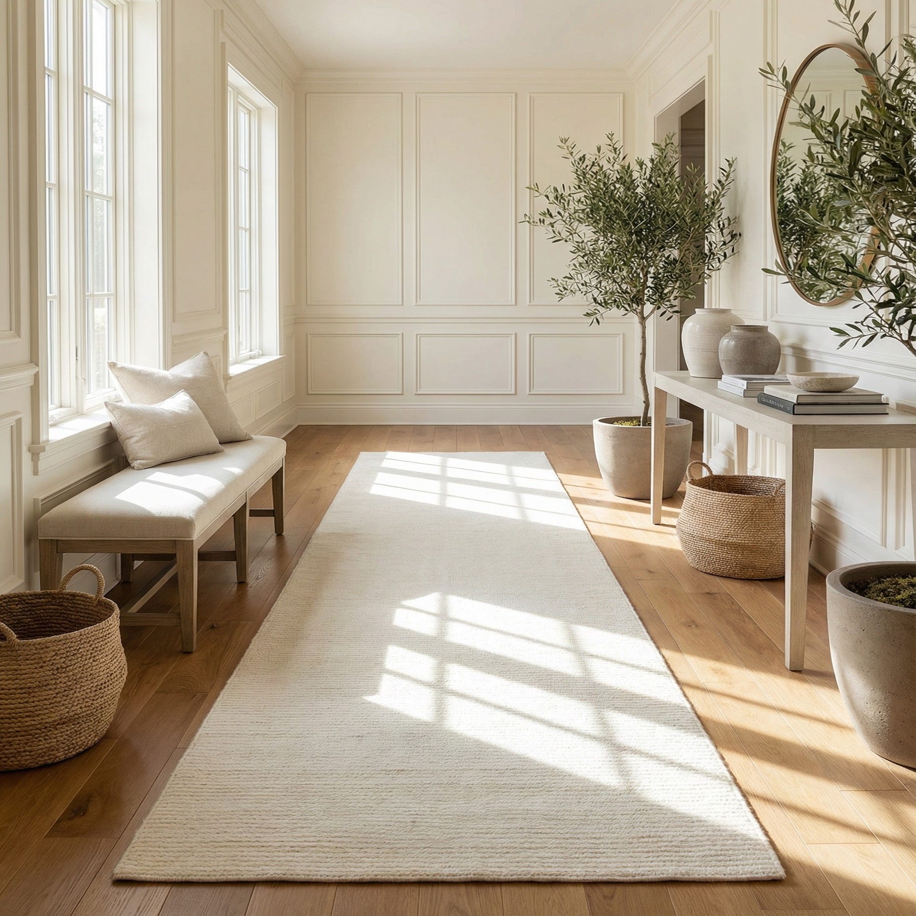 A 13 ft Darya runner rug in ivory and cream, handmade from wool and cotton, perfect for a hallway.