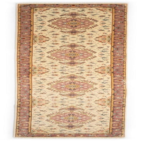 Primary color is Cream. Colors in this rug include: Cream, Cream, Purple, Blue, Brown, Grey, Dark Blue.