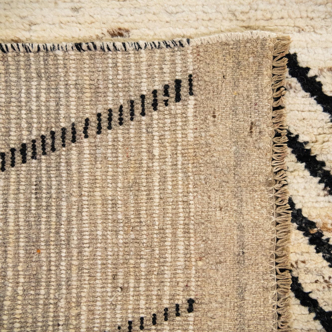 Primary color is Cream. Colors in this rug include: Cream, Black, Brown, Beige, Ivory.