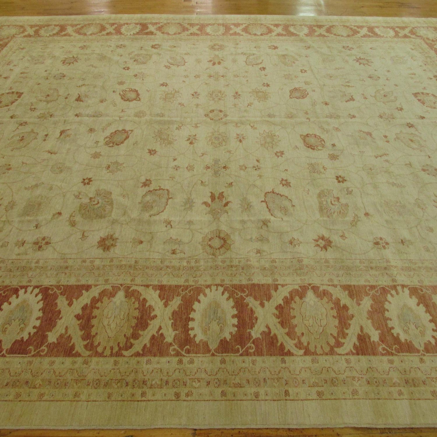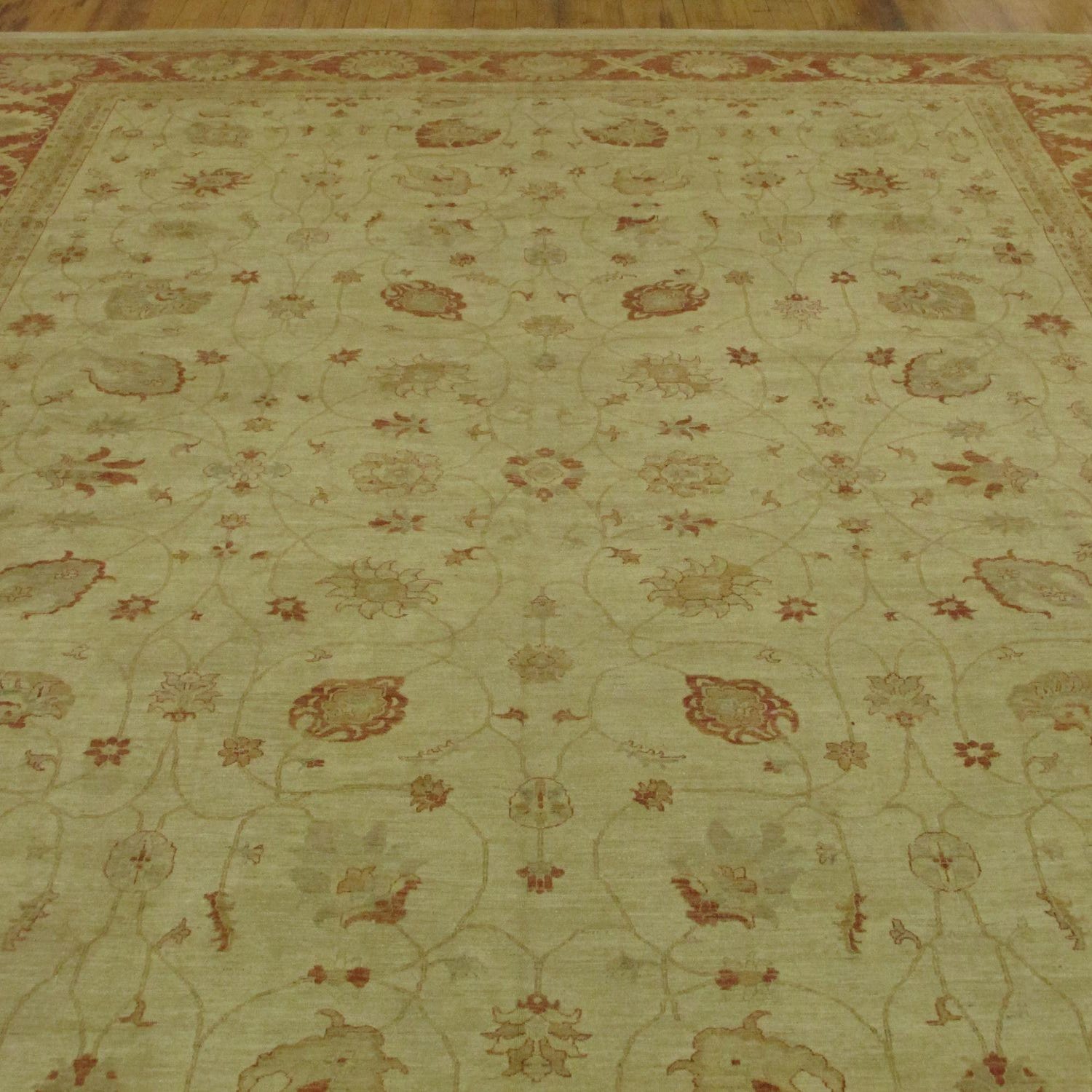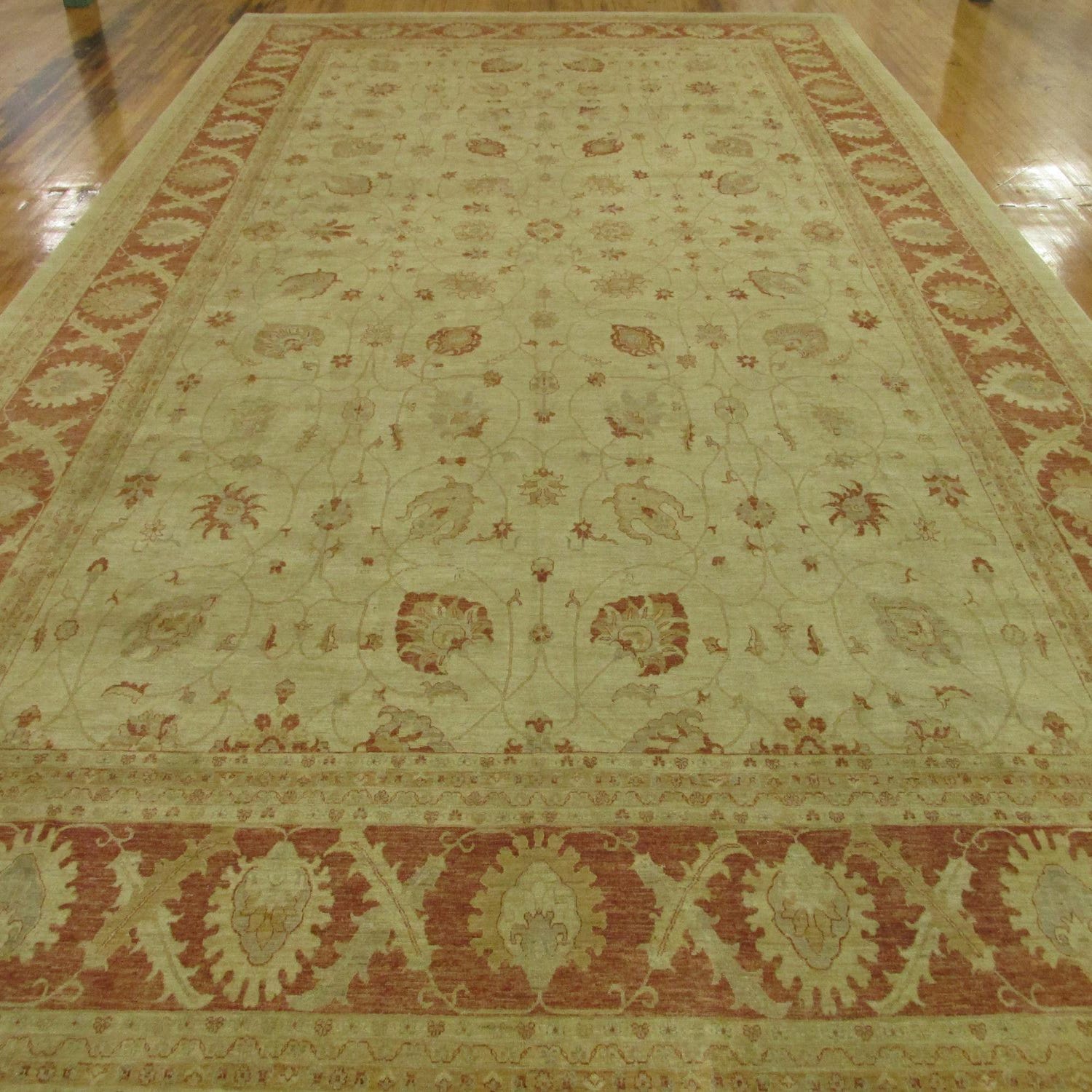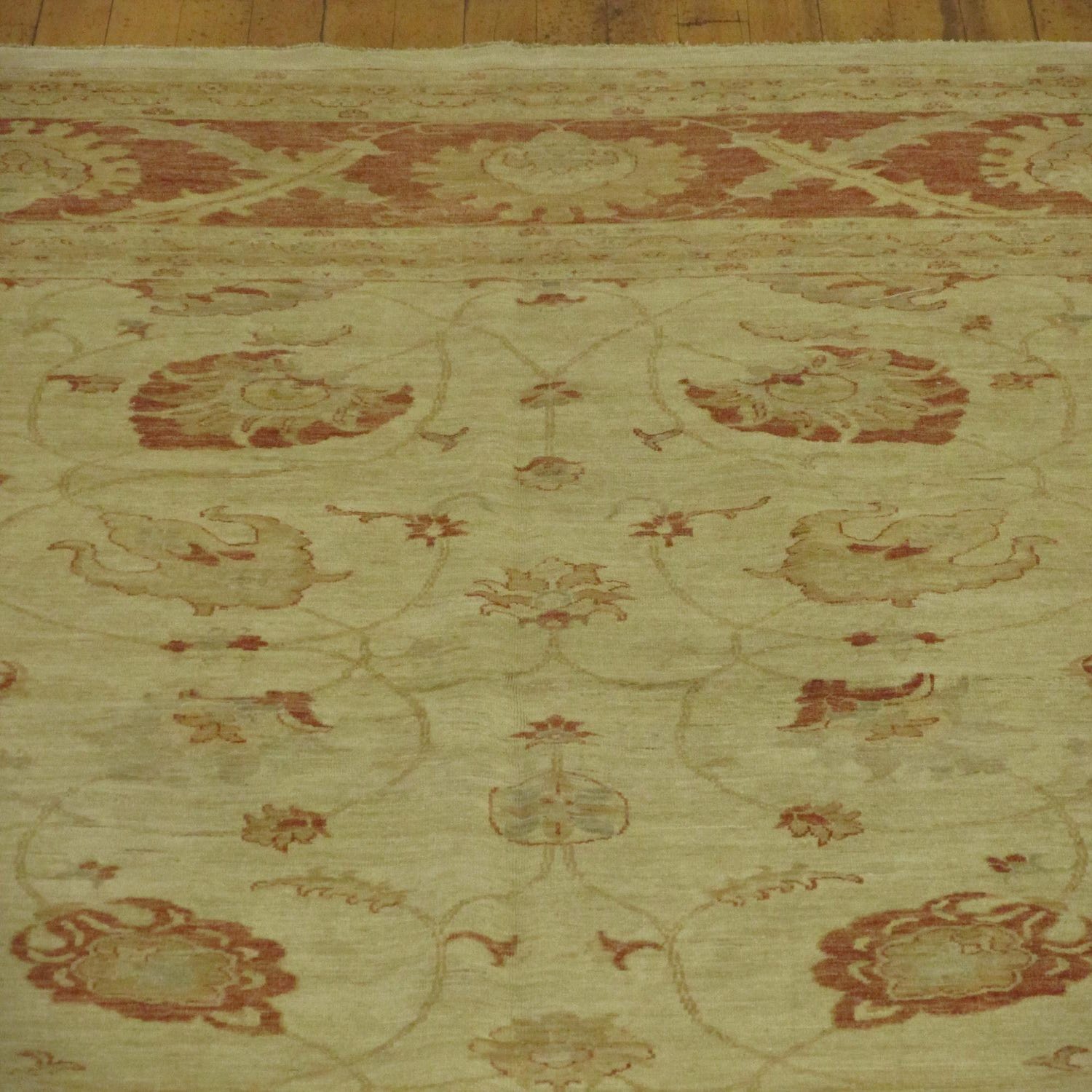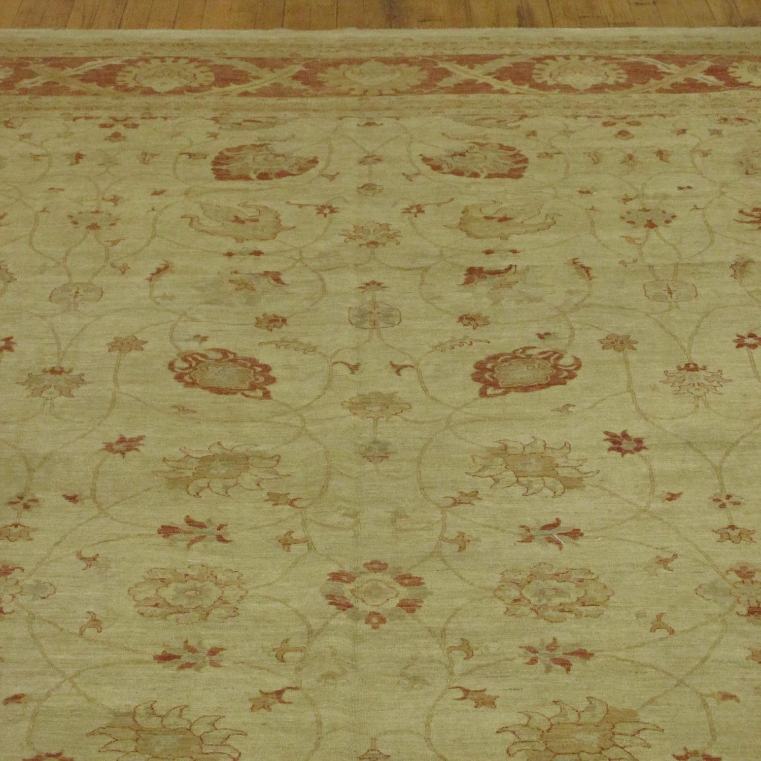 A large 13x18 rectangular ivory Peshawar Ziegler rug with a traditional botanical and floral pattern in muted reds and creams, featuring a tribal border.