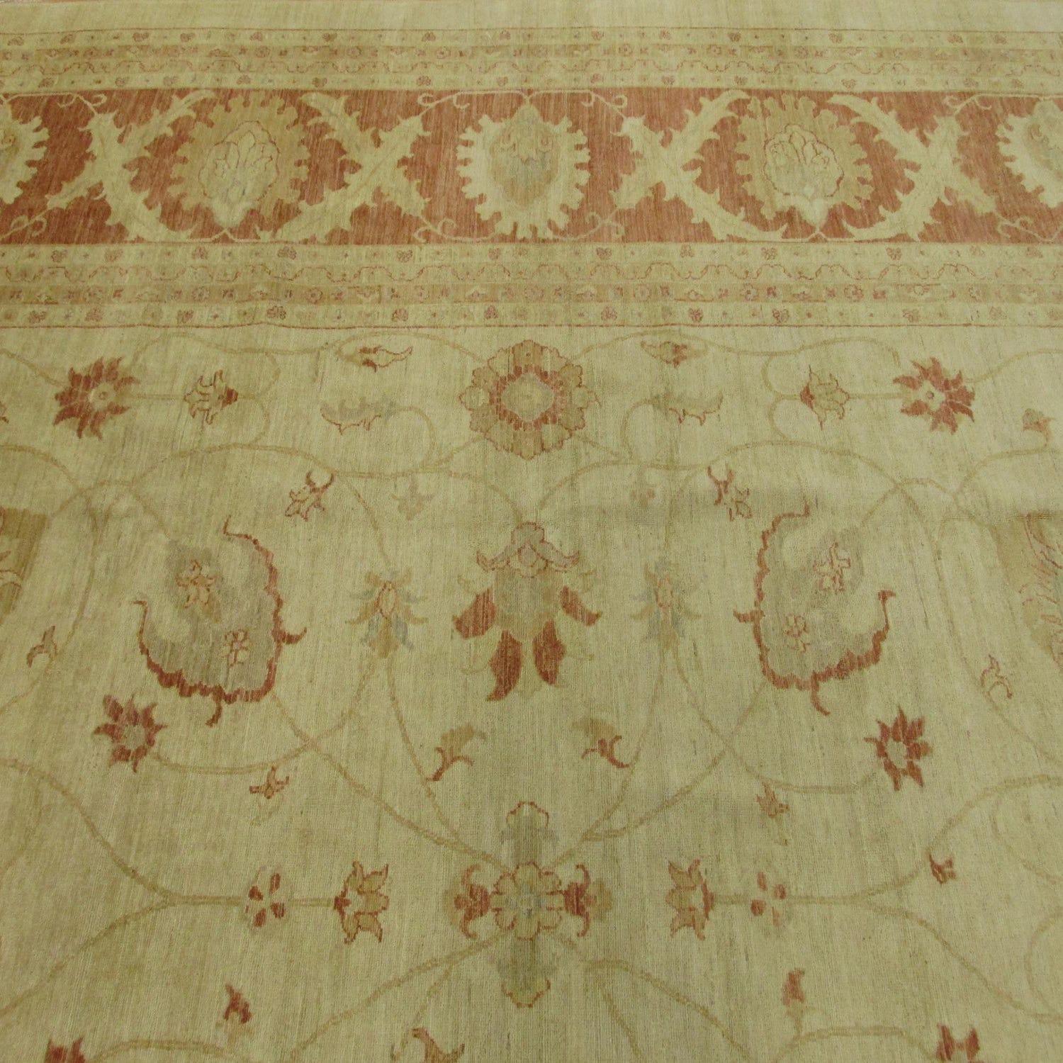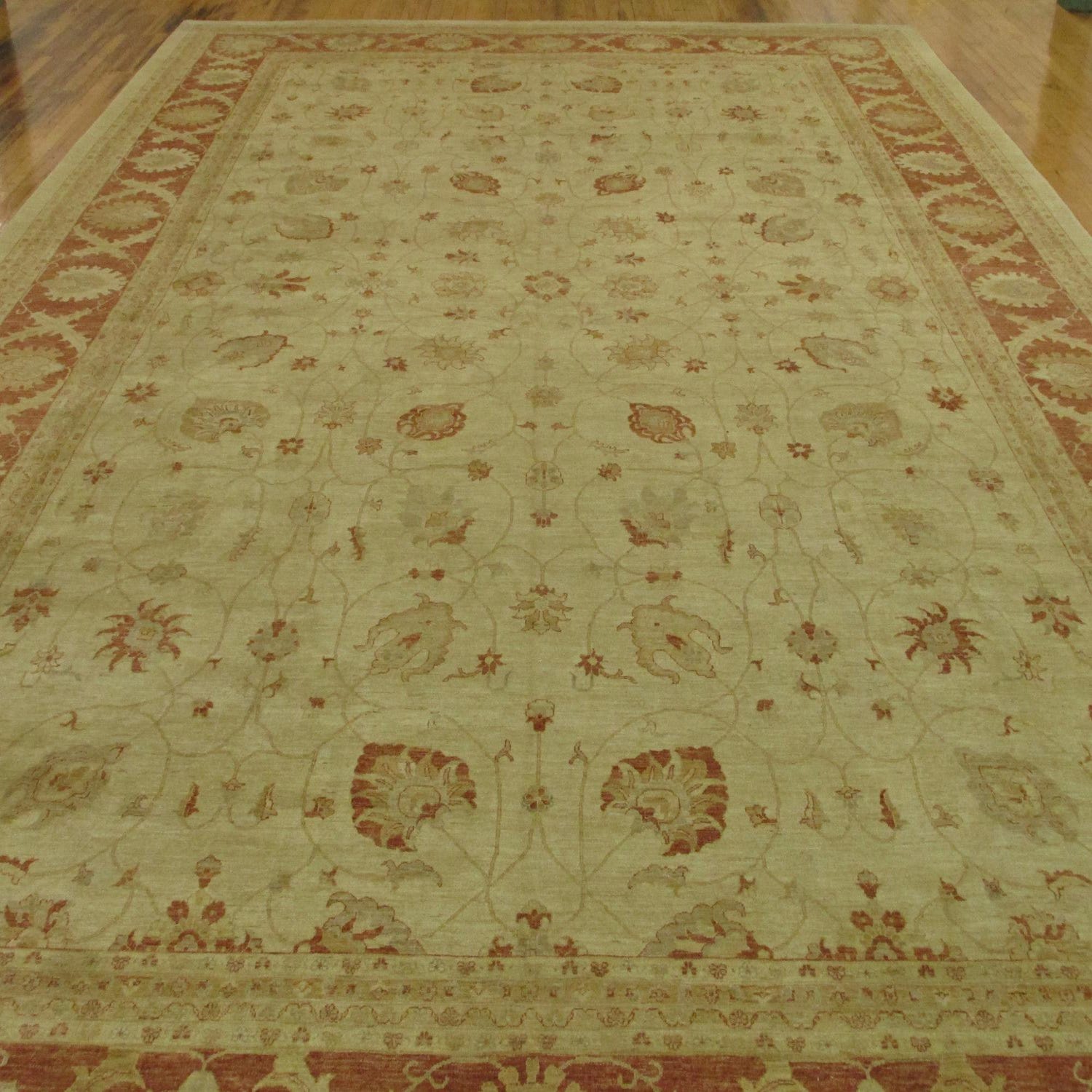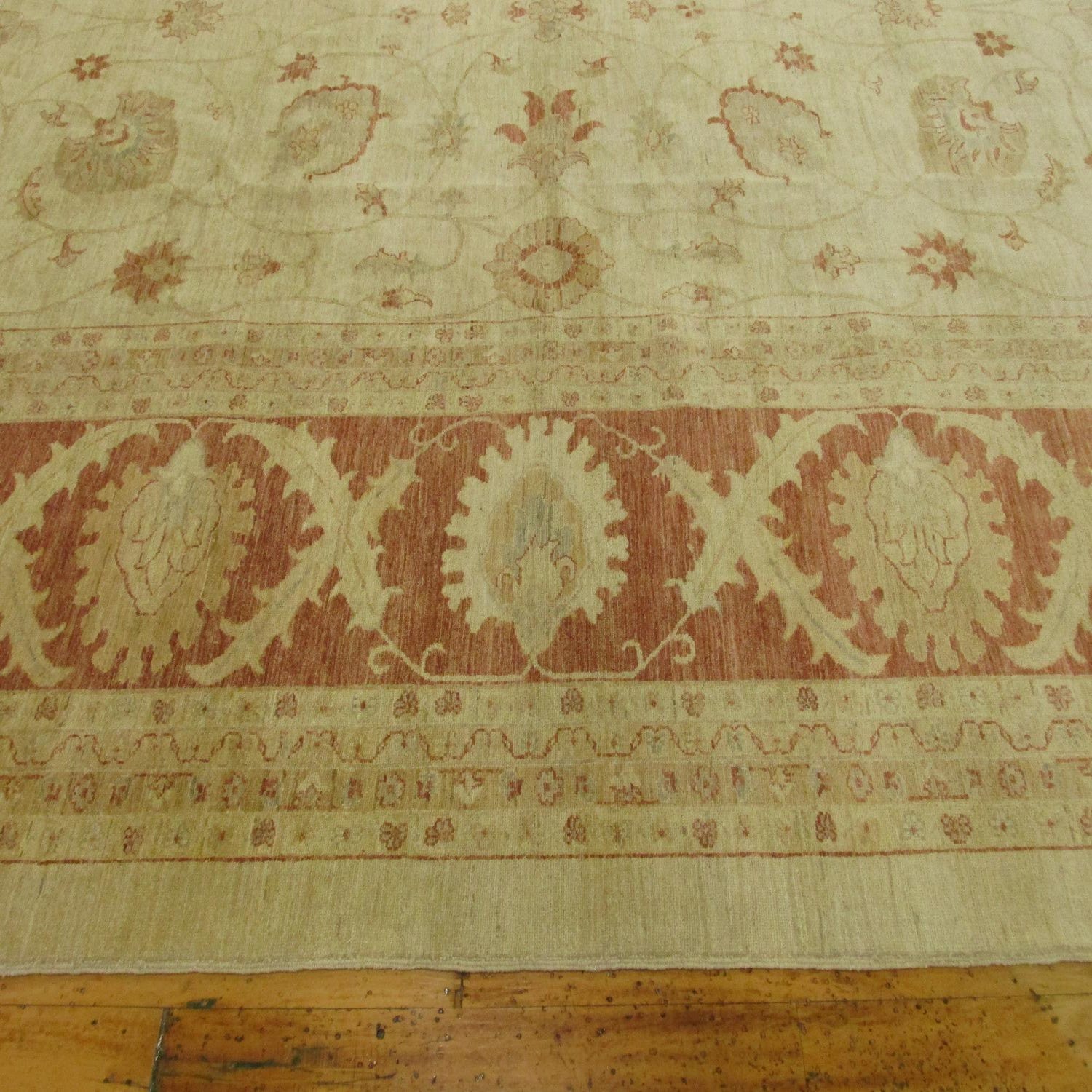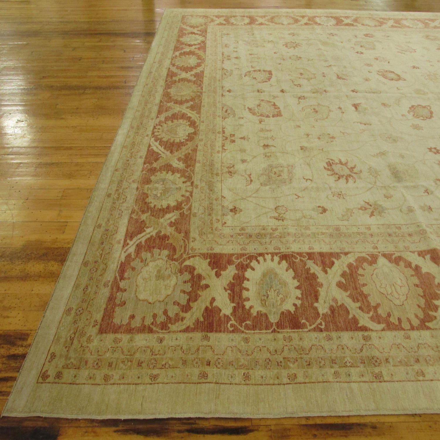 A large 13x18 rectangular ivory Peshawar Ziegler rug with a traditional botanical and floral pattern in muted reds and creams, featuring a tribal border.