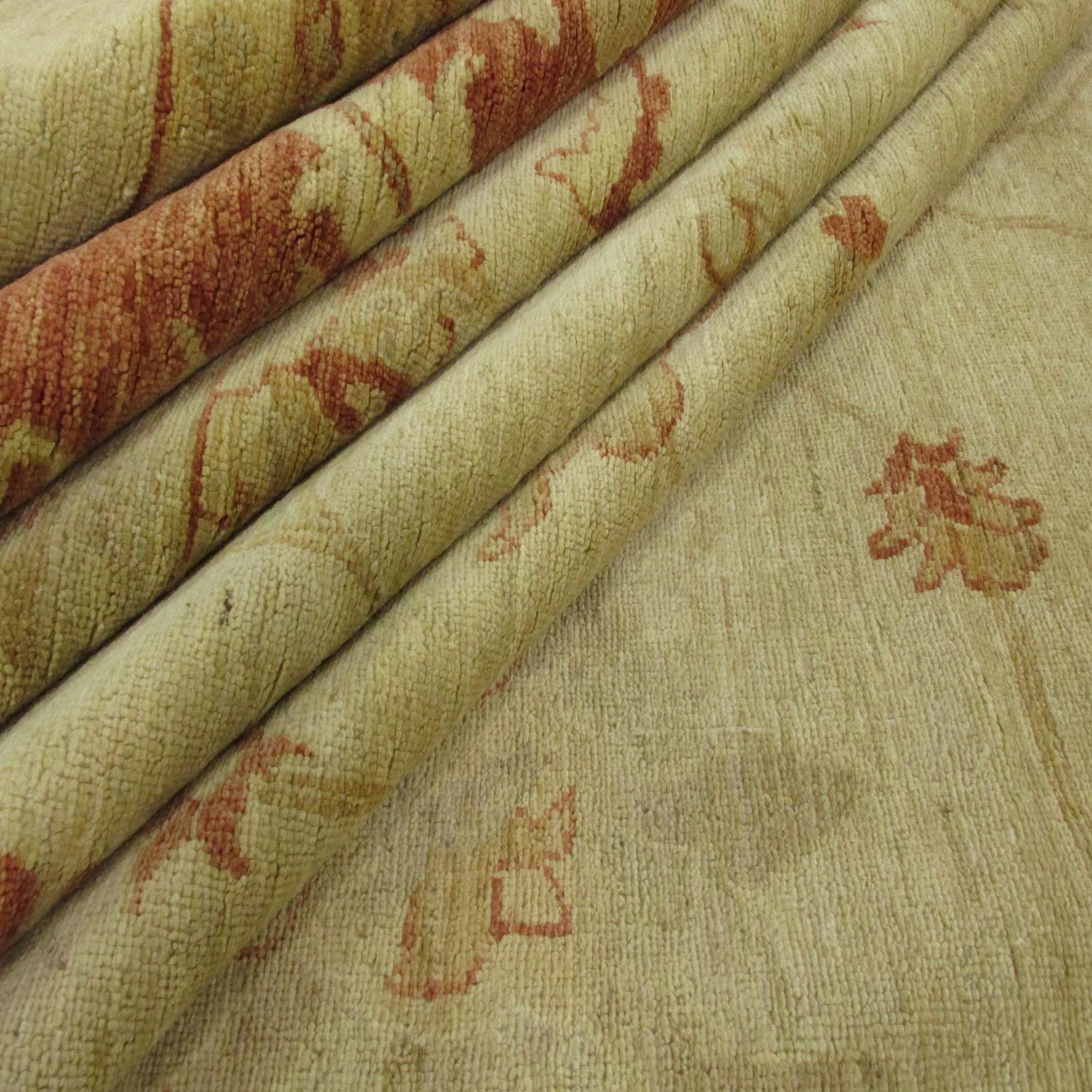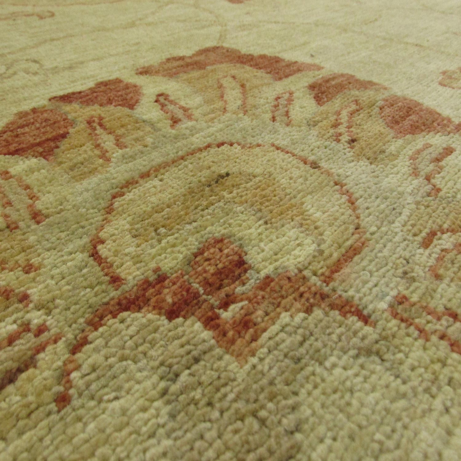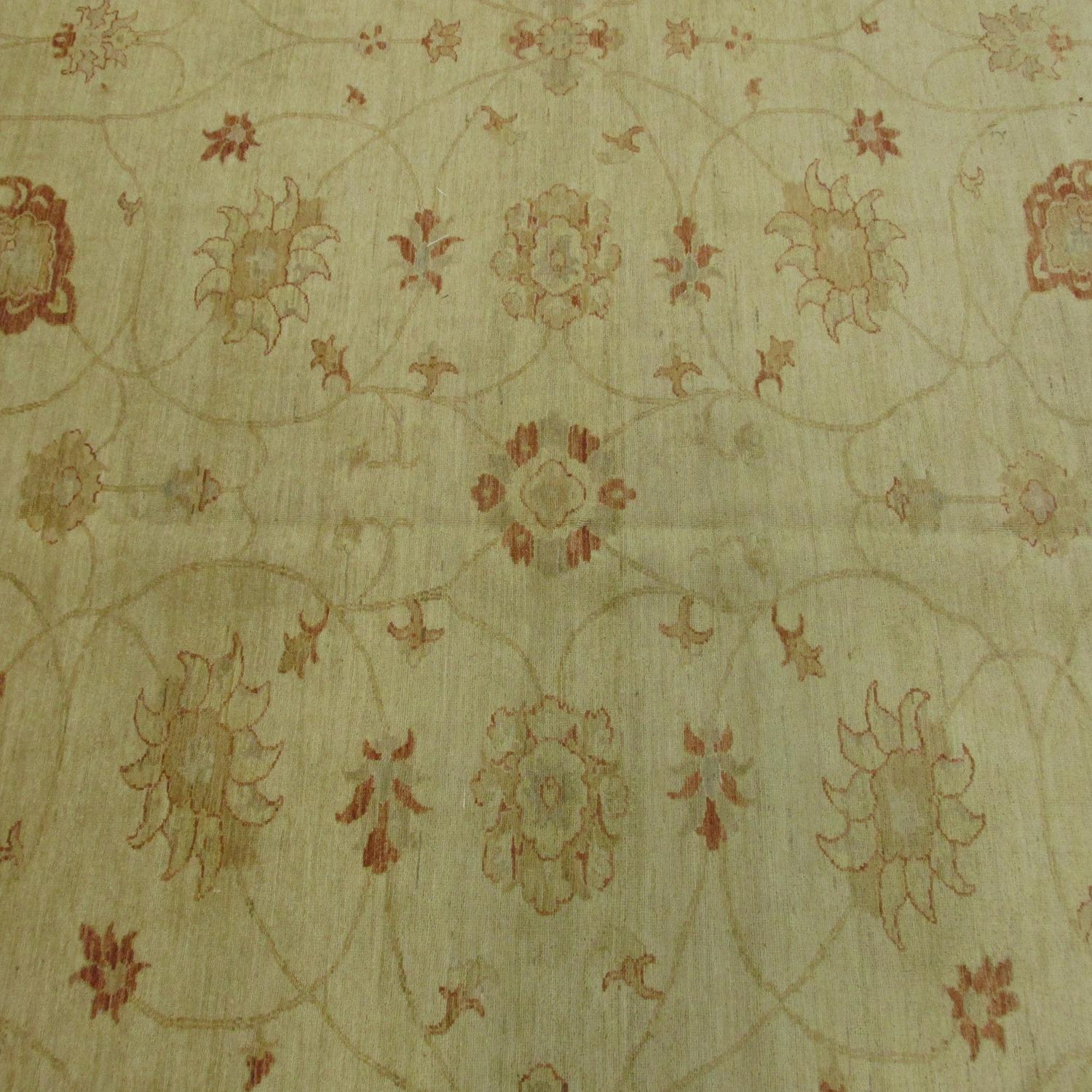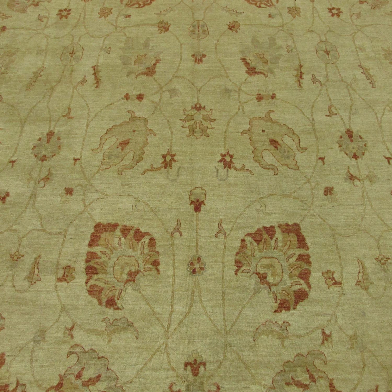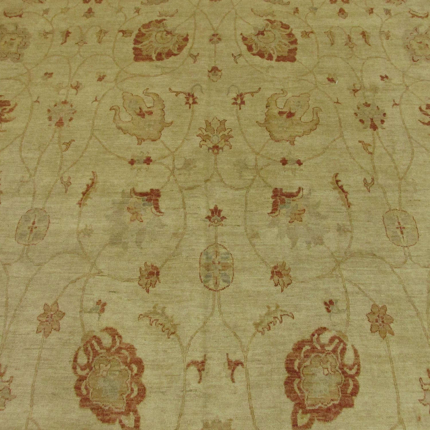 A large 13x18 rectangular ivory Peshawar Ziegler rug with a traditional botanical and floral pattern in muted reds and creams, featuring a tribal border.
