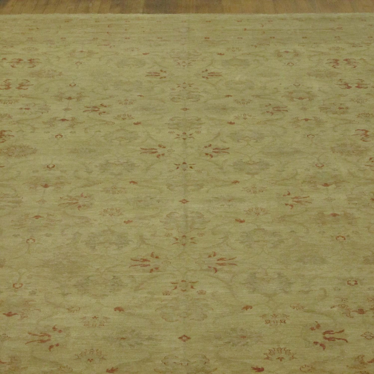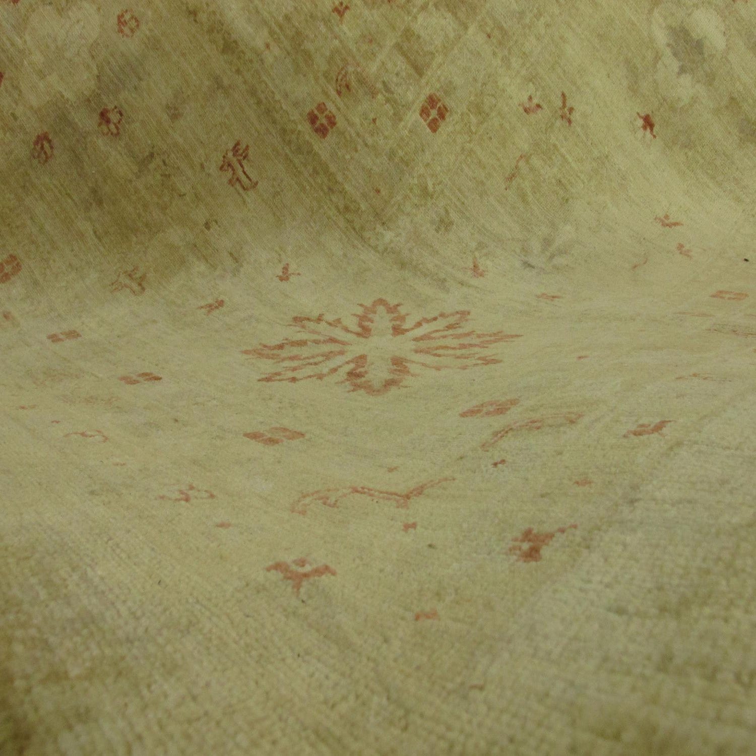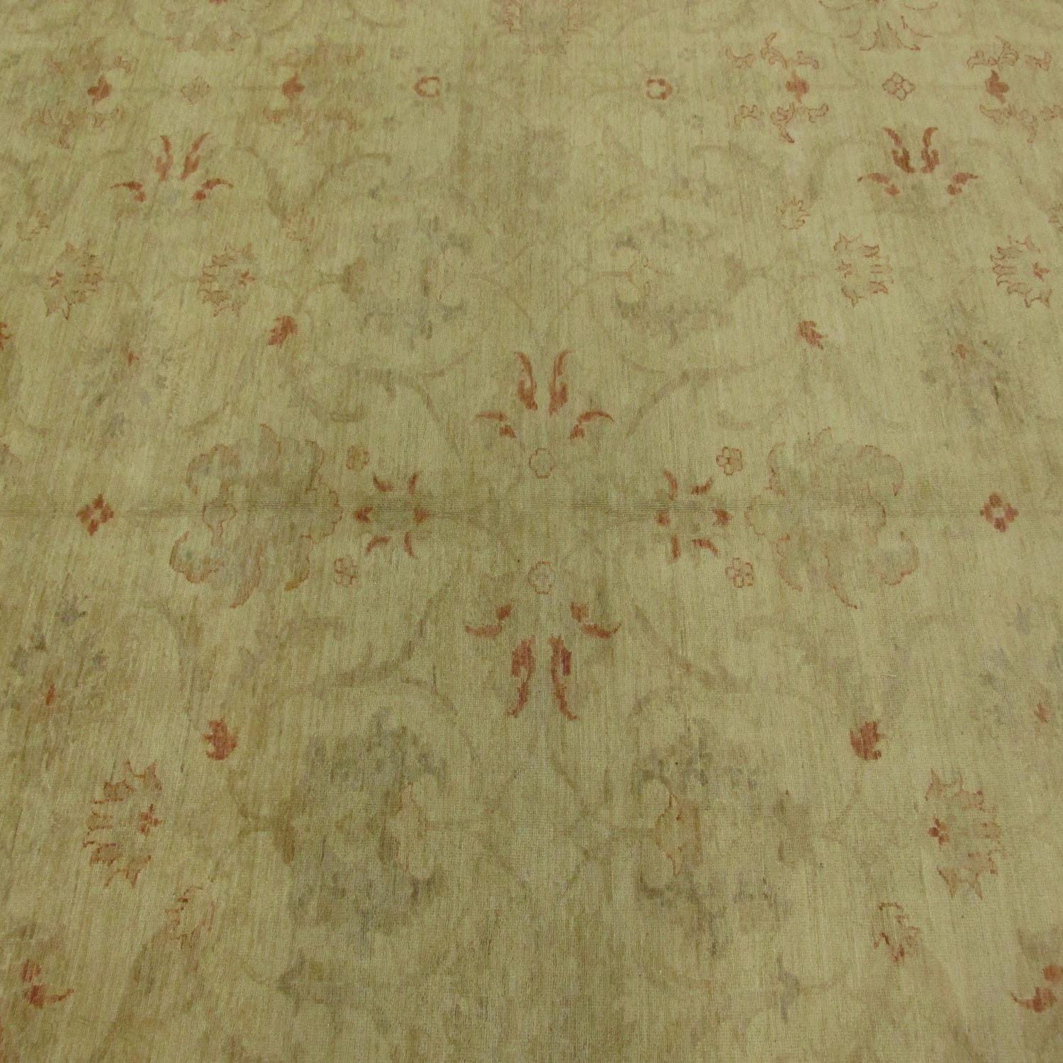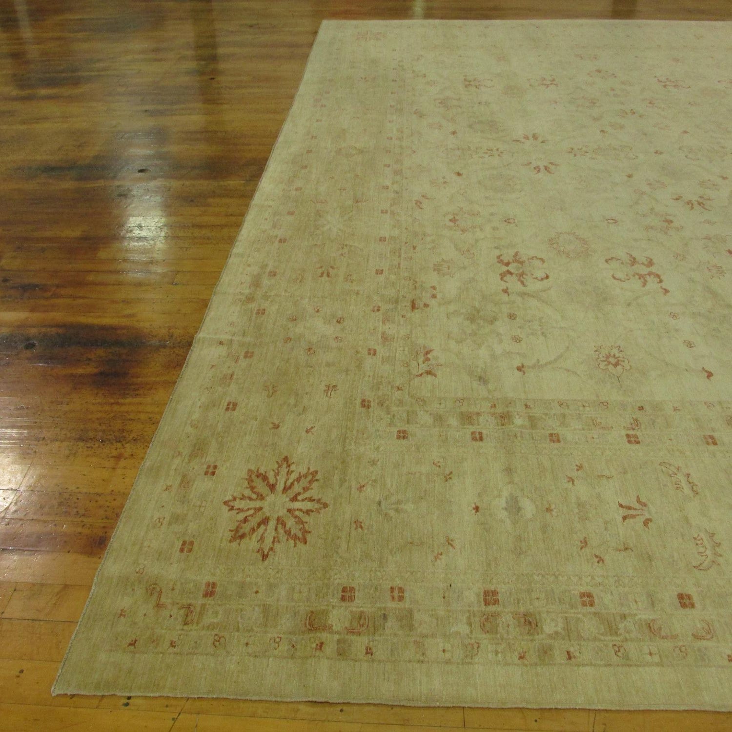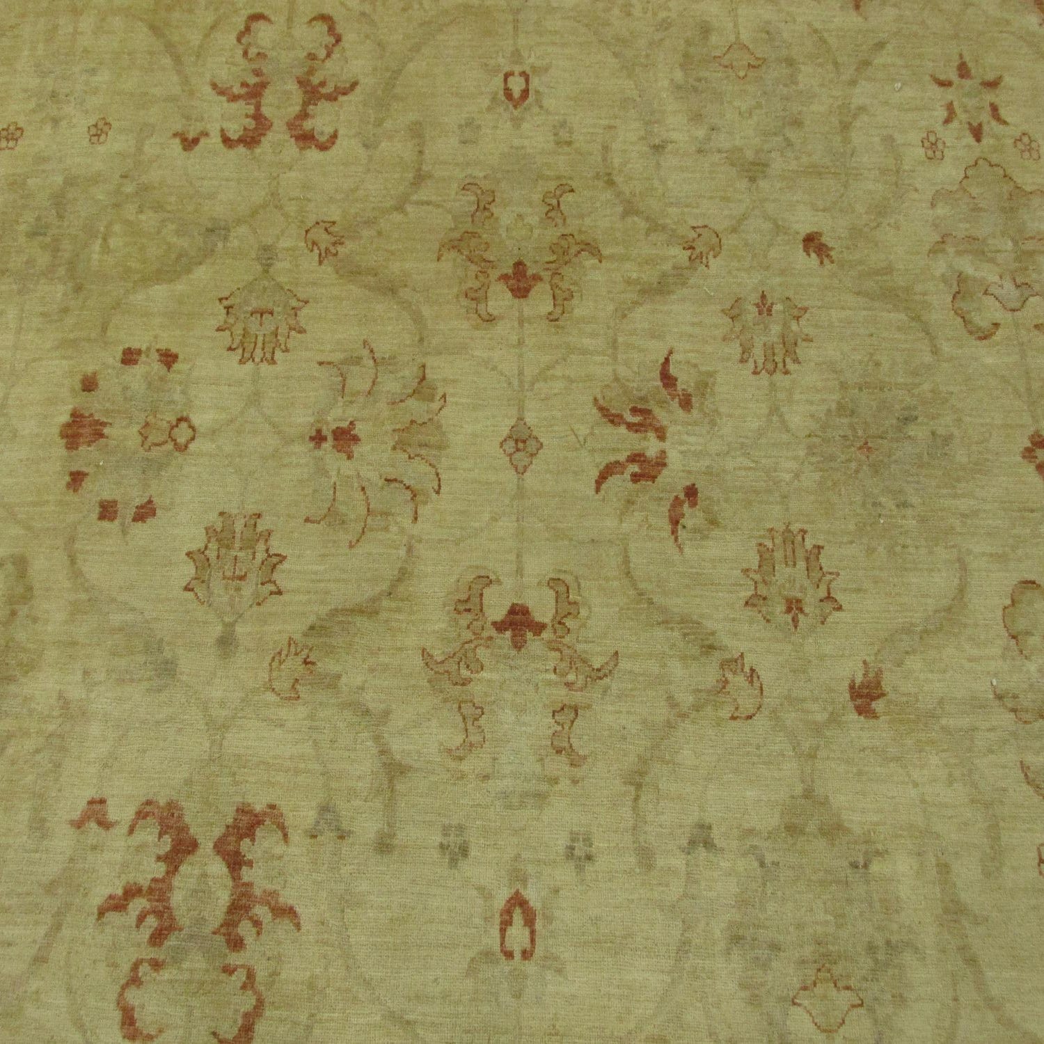 This Peshawar Ziegler rug, sized at 13x18 feet, is skillfully hand-knotted from 100% hand-spun wool, offering a durable and tactile surface. The rug features a cream background, complemented by a soft palette of red and light brown motifs, finely woven to create a subtle and intricate pattern reminiscent of traditional designs. The heritage-inspired motifs bring a sense of timeless elegance to this piece.