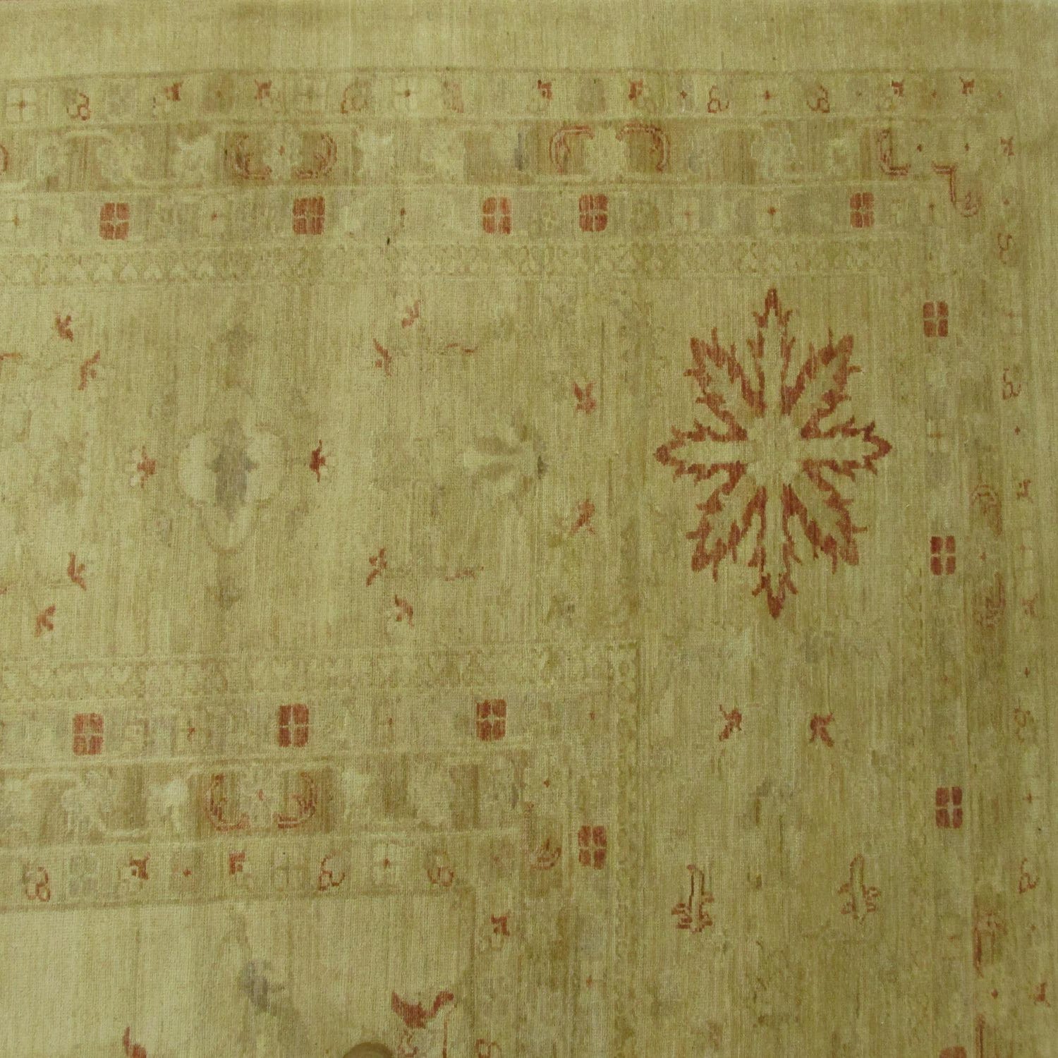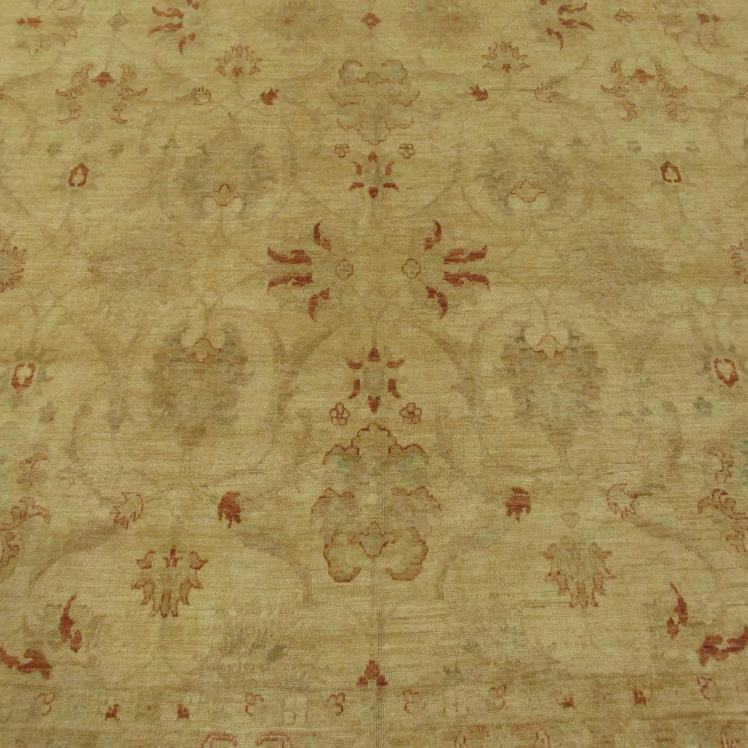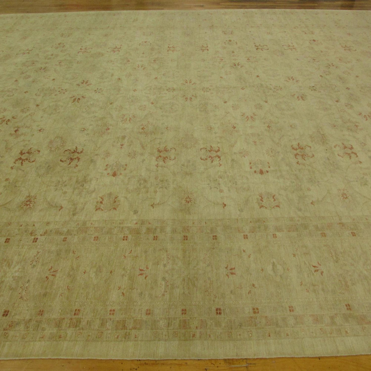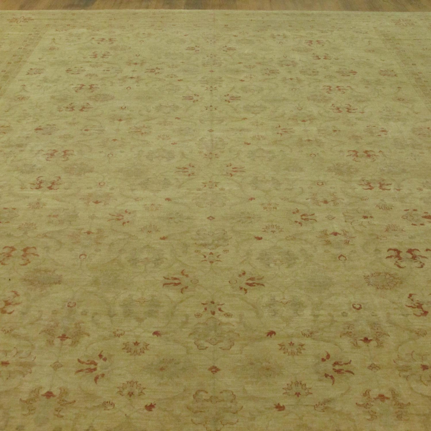 This Peshawar Ziegler rug, sized at 13x18 feet, is skillfully hand-knotted from 100% hand-spun wool, offering a durable and tactile surface. The rug features a cream background, complemented by a soft palette of red and light brown motifs, finely woven to create a subtle and intricate pattern reminiscent of traditional designs. The heritage-inspired motifs bring a sense of timeless elegance to this piece.