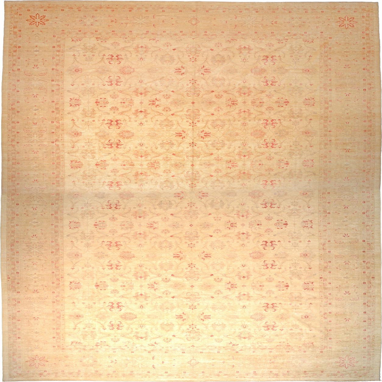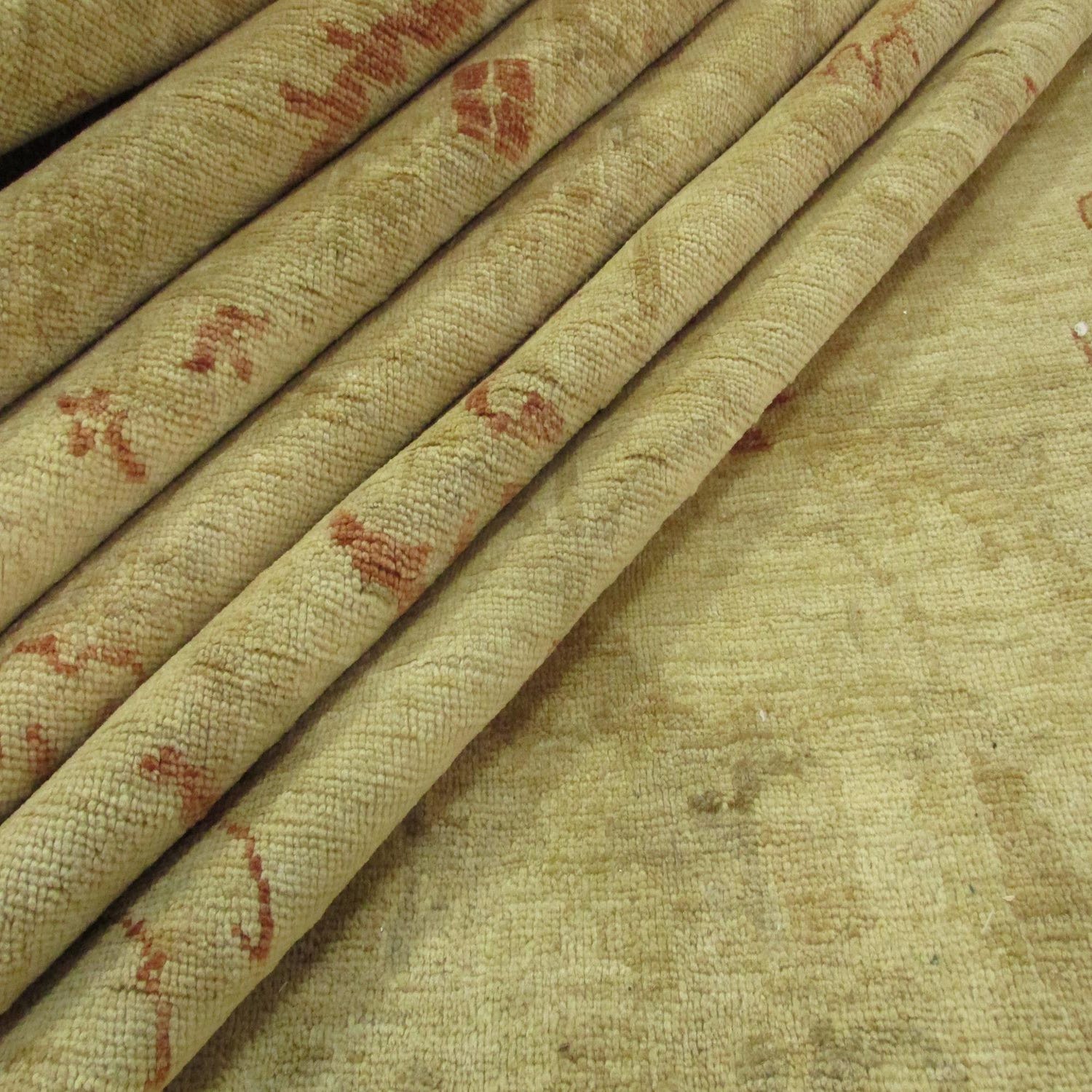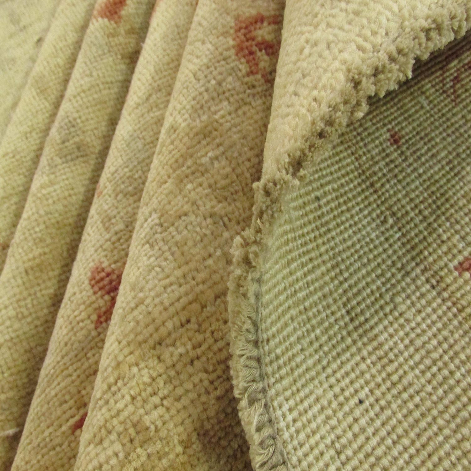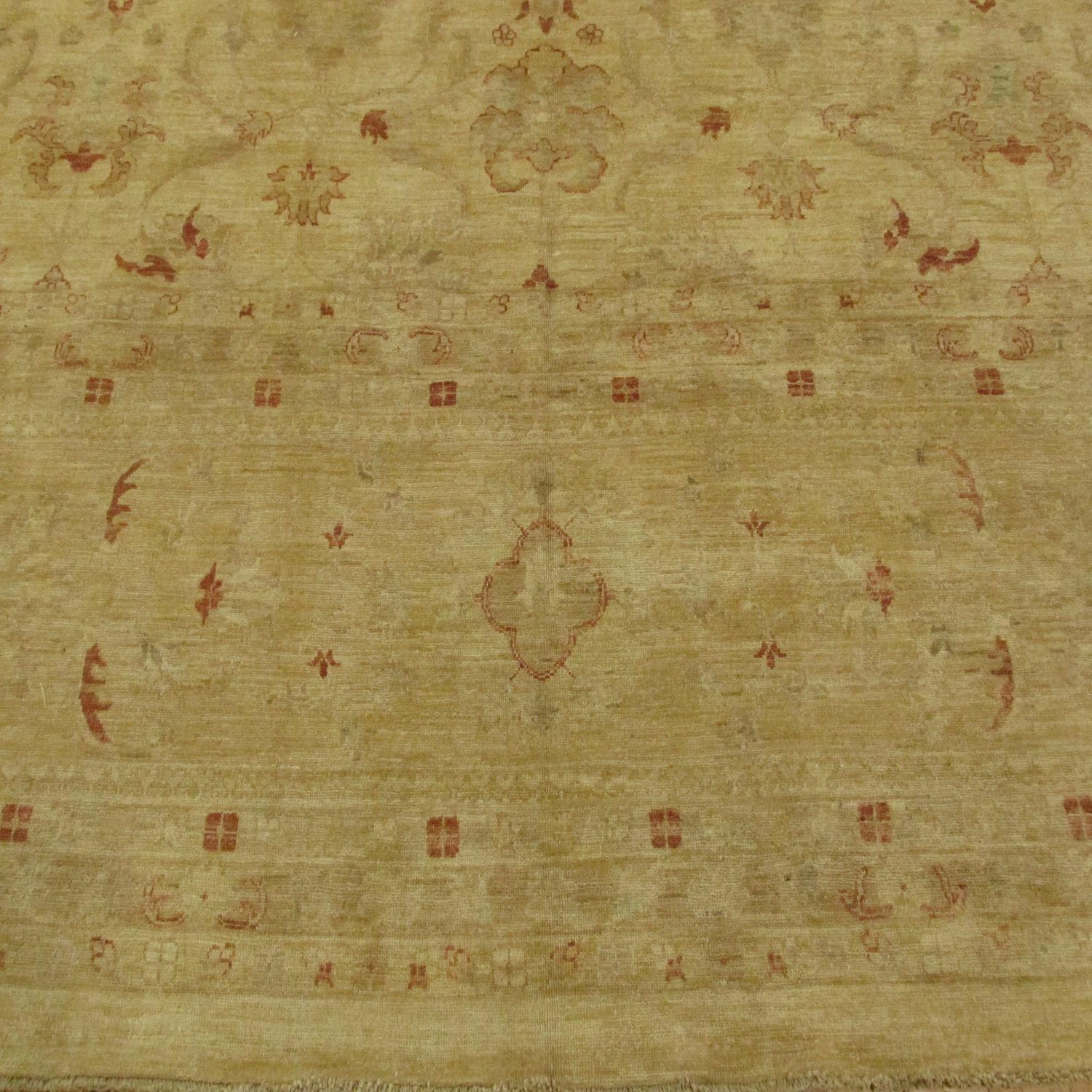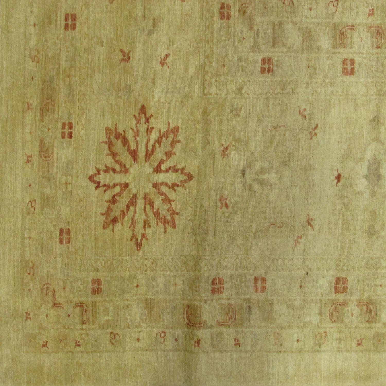 This Peshawar Ziegler rug, sized at 13x18 feet, is skillfully hand-knotted from 100% hand-spun wool, offering a durable and tactile surface. The rug features a cream background, complemented by a soft palette of red and light brown motifs, finely woven to create a subtle and intricate pattern reminiscent of traditional designs. The heritage-inspired motifs bring a sense of timeless elegance to this piece.