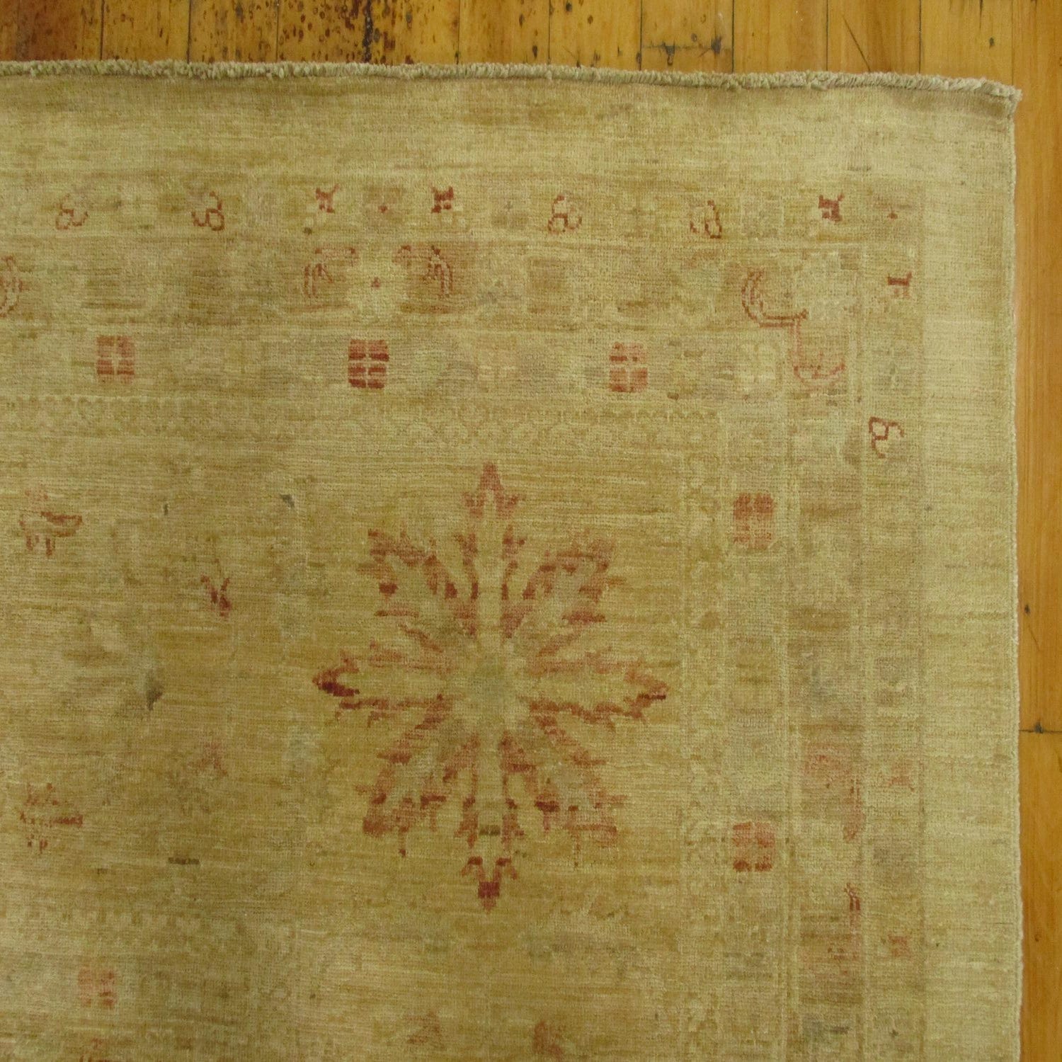 The rug's color scheme allows for versatile styling; it can seamlessly integrate into interiors with a neutral color palette for a coherent look or contrast with darker flooring for a striking effect. This piece can elegantly complement traditional decors with its classic patterning, yet its simplistic color blend allows it to adapt to more modern settings that emphasize minimalist aesthetics. Crafted for those who appreciate the fusion of artisanal techniques with enduring design, this Peshawar Ziegler rug is a tasteful addition to any refined interior.