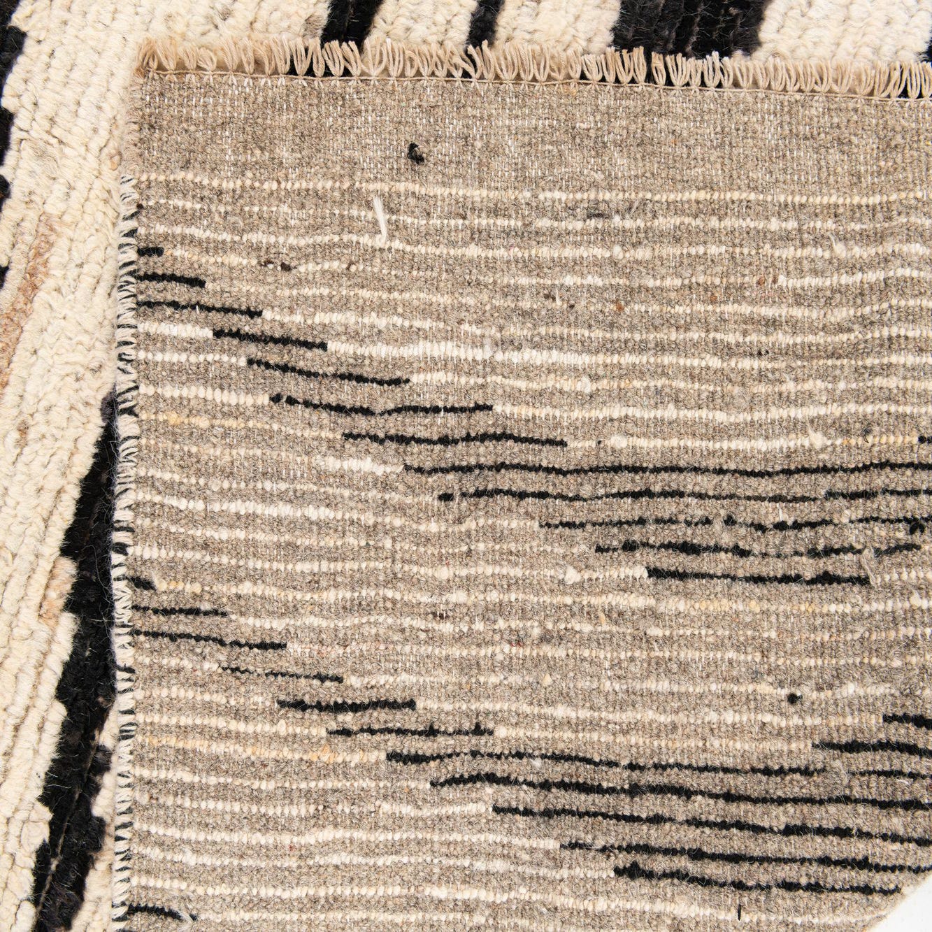 Bold black waves ripple across a cream field in a graphic, hand-drawn stripe that balances modern minimalism with artisanal character. Hand-knotted from 100% wool, the runner has a soft, tactile pile with subtle tonal variation and gentle slub from the natural fibers, giving the surface a warm, layered feel underfoot. The irregular edges of the pattern keep the look relaxed rather than rigid, so the overall effect reads as both contemporary and handcrafted.