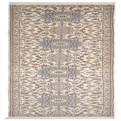 Primary color is Cream. Colors in this rug include: Cream, Cream, Blue, Brown, Beige, Dark Blue, Black.