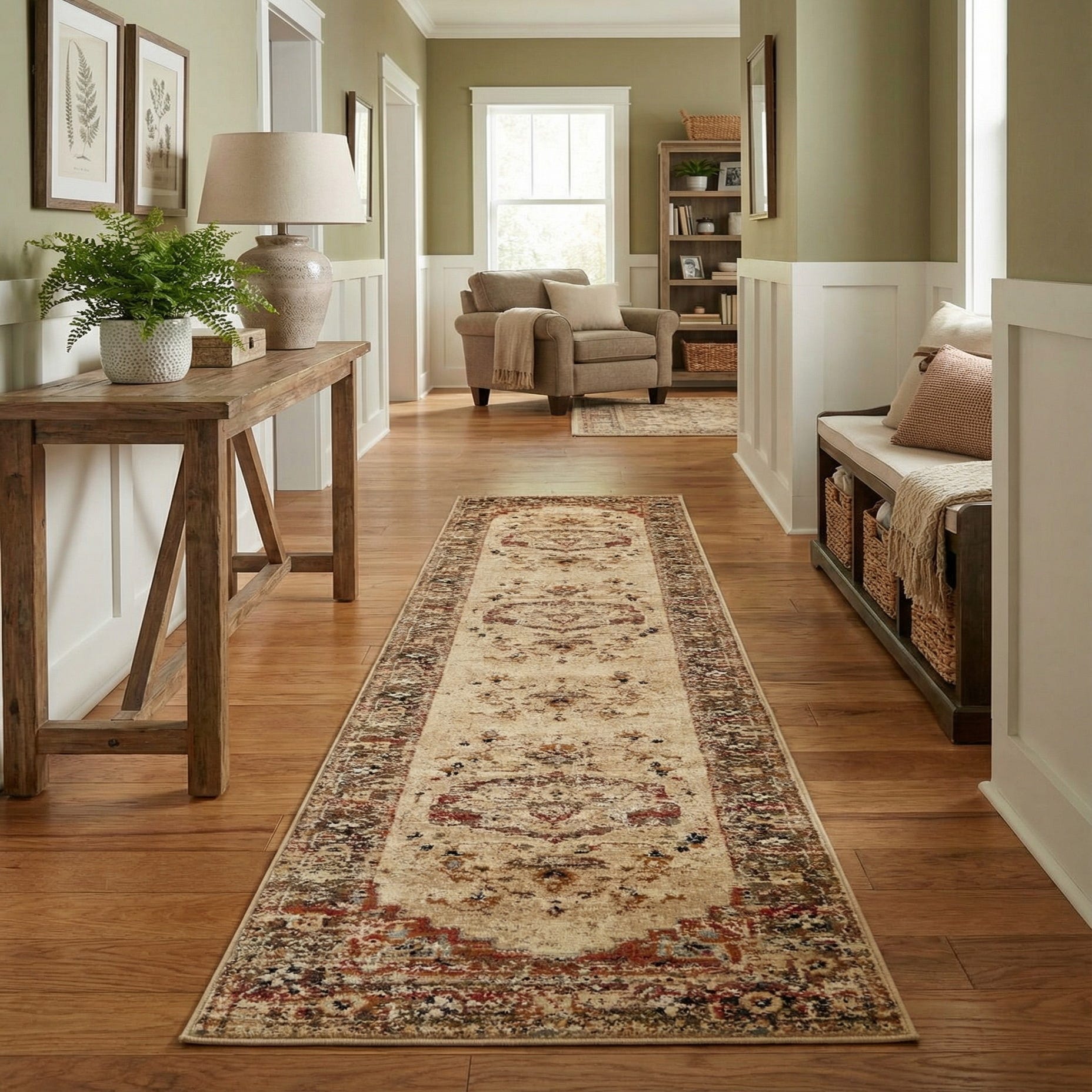 Warm in color and versatile in style, this runner works well in traditional and transitional interiors as well as farmhouse or vintage-inspired rooms. Place it in a long entry or hallway to lead the eye, layer it beside a bed for added warmth, or use it to define a narrow kitchen or galley. It pairs especially nicely with warm wood floors, neutral upholstery, antique brass or matte-black accents, and leather or wooden benches for a lived-in, collected look.