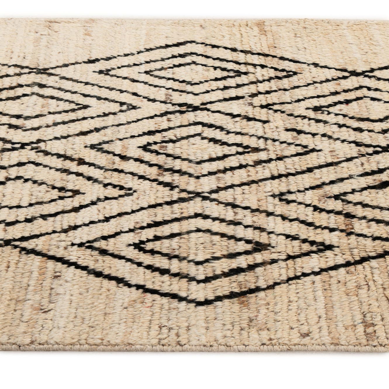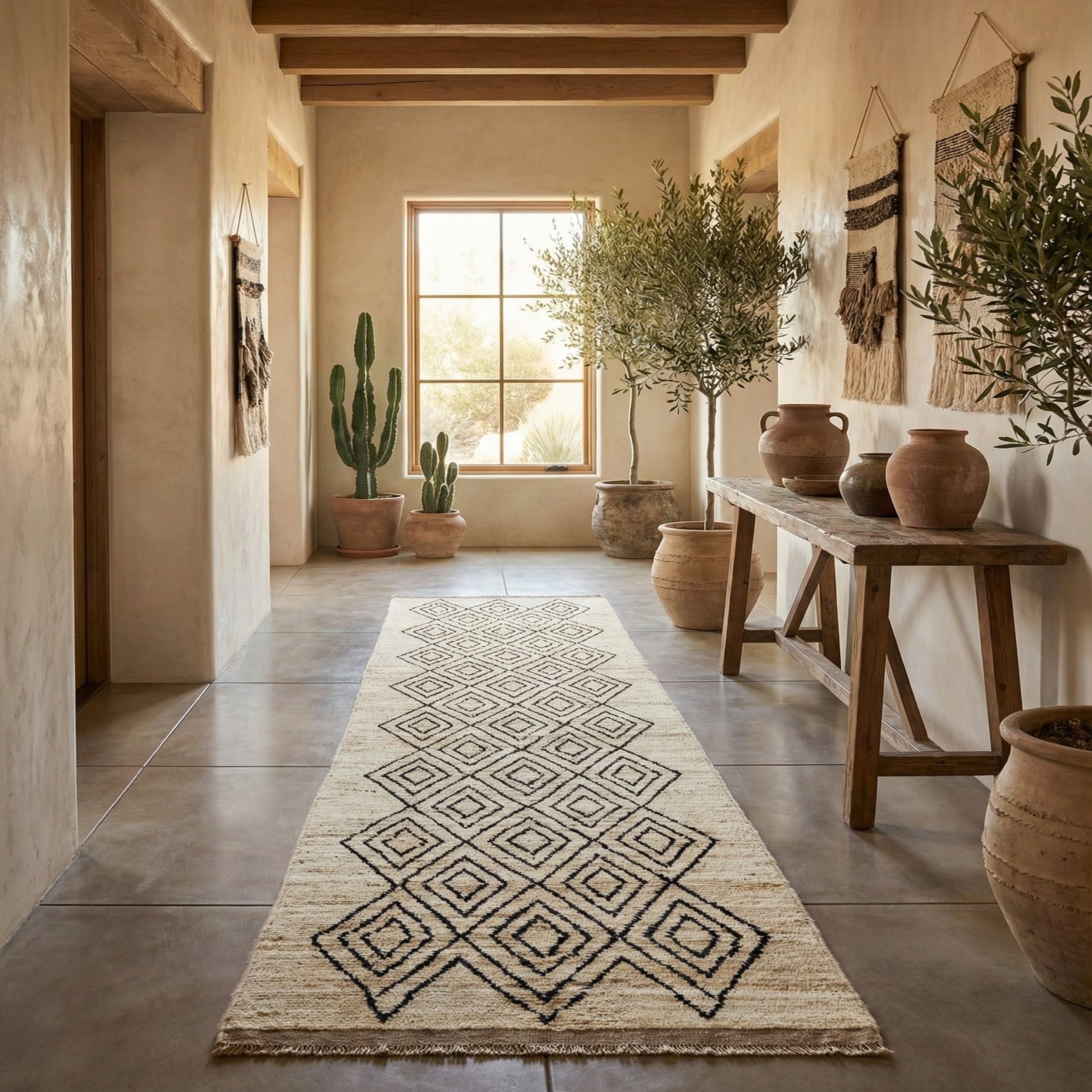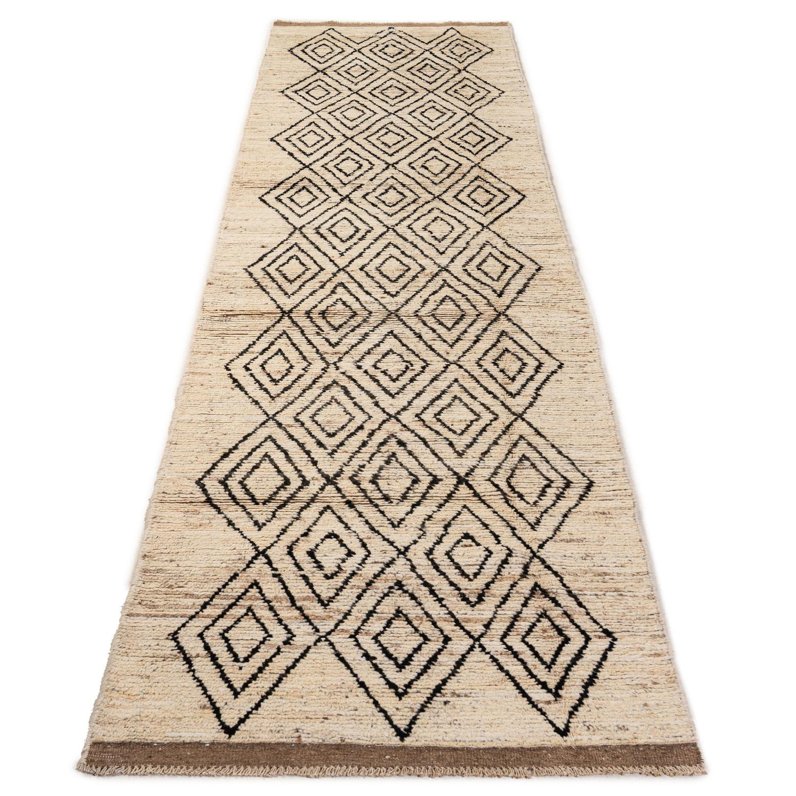 A 16 ft ivory runner rug with a repeating black tribal diamond pattern, ideal for a hallway.