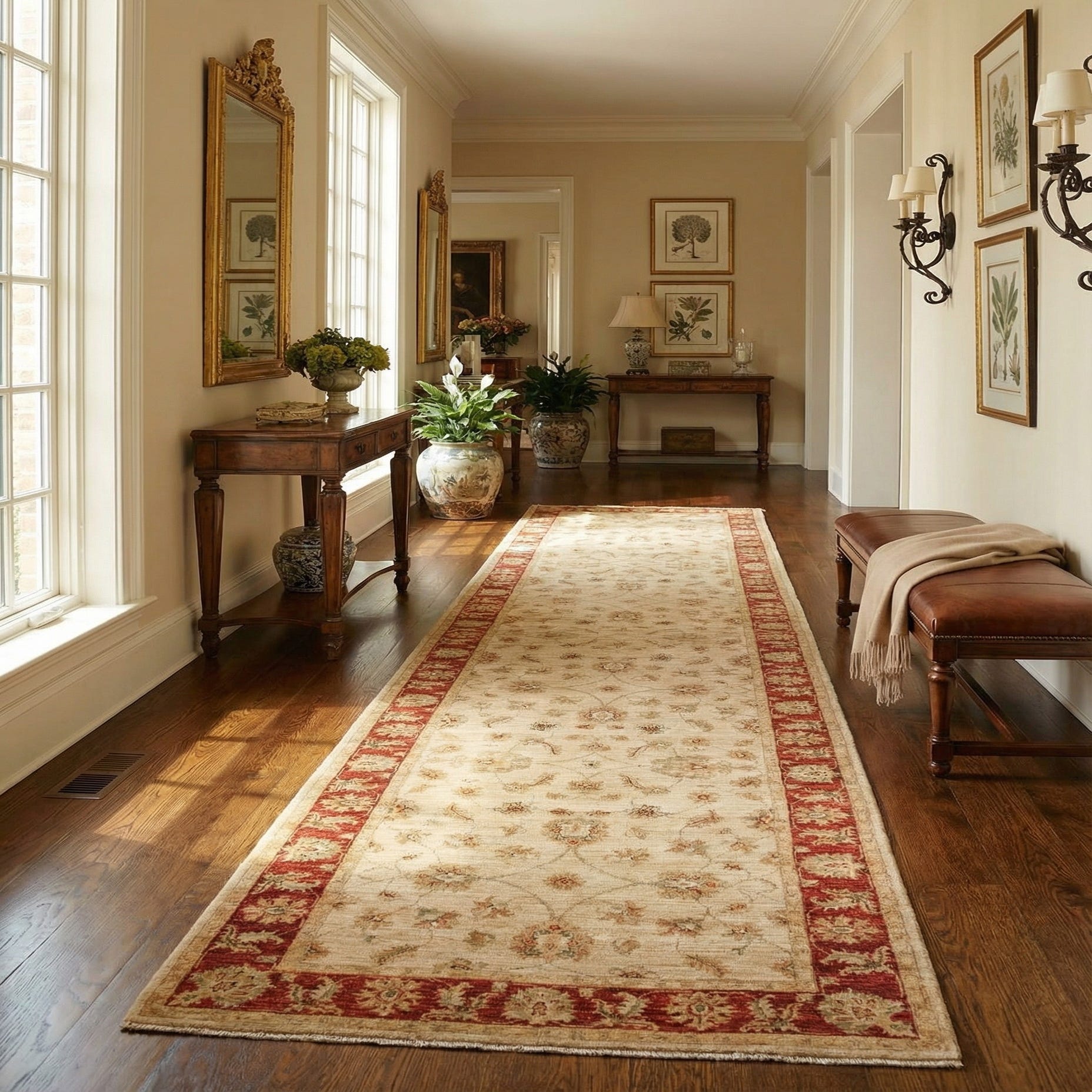 A 17 ft ivory runner rug with a traditional botanical pattern and a bold red border, perfect for hallways.