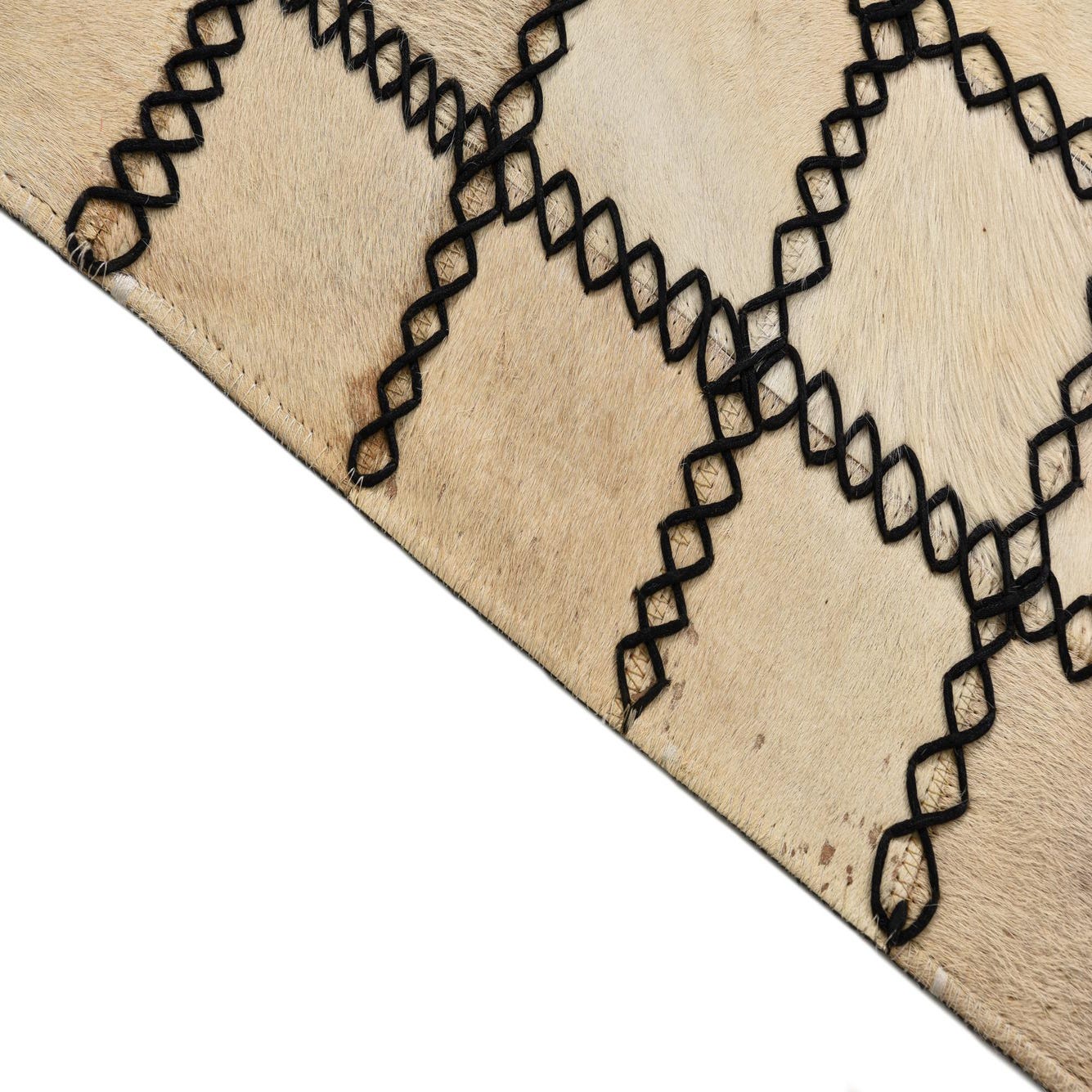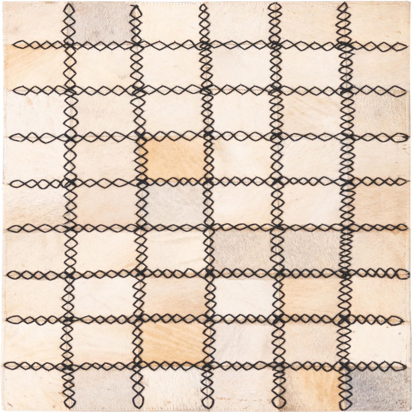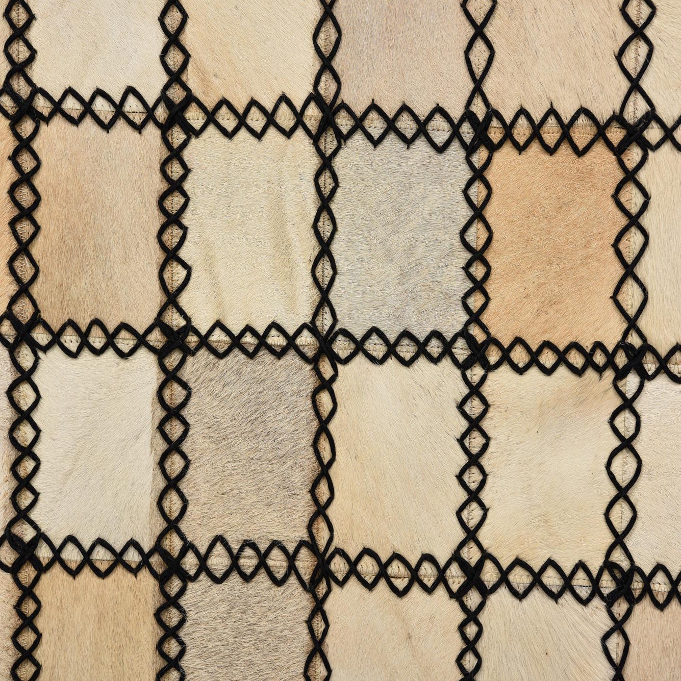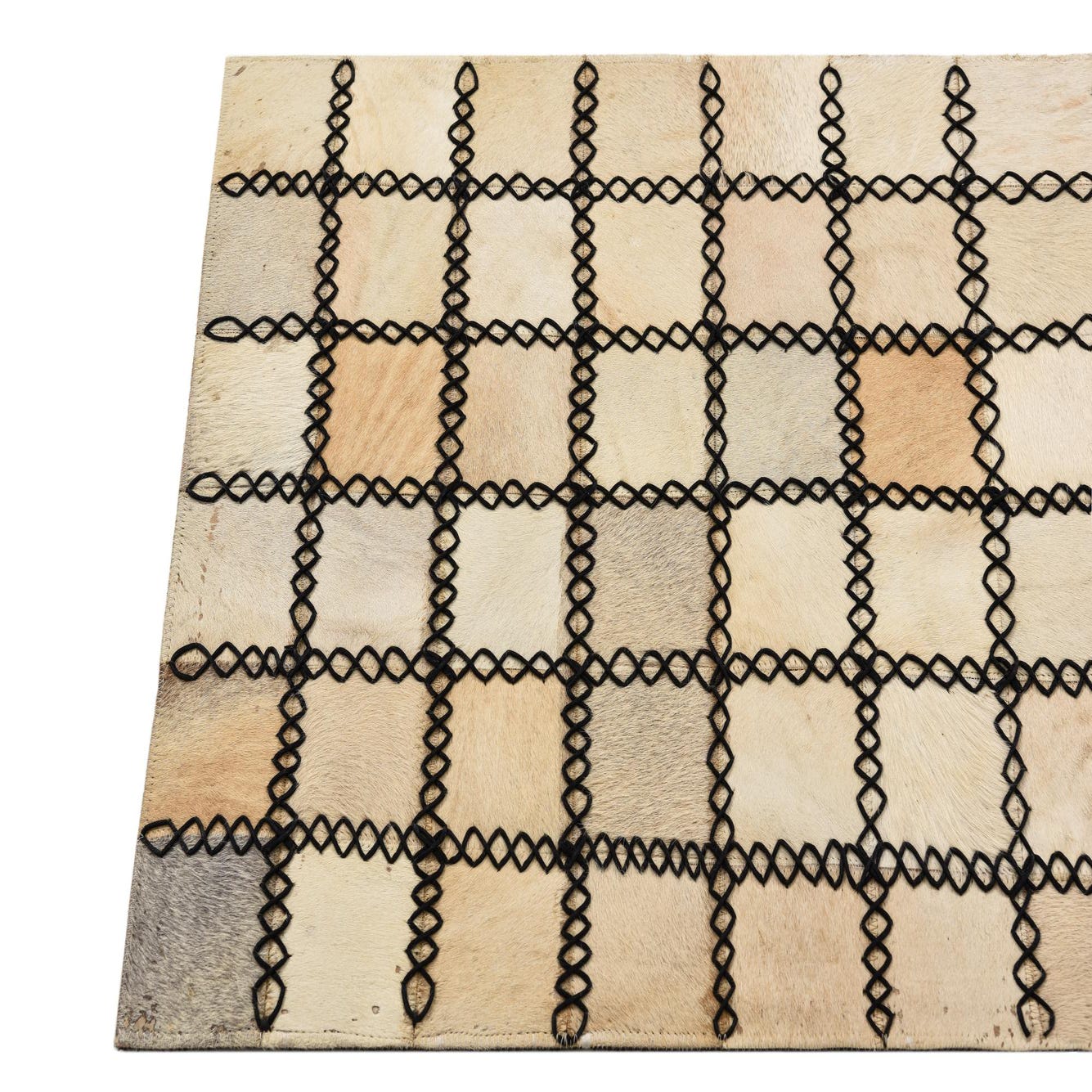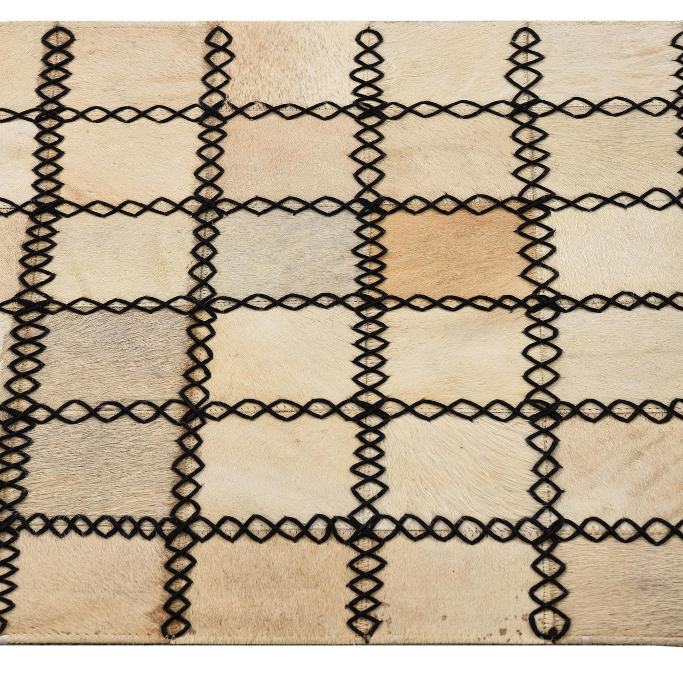 A 2x3 rectangular Cowhide rug featuring a modern grid pattern with ivory and cream patches stitched together by black leather.