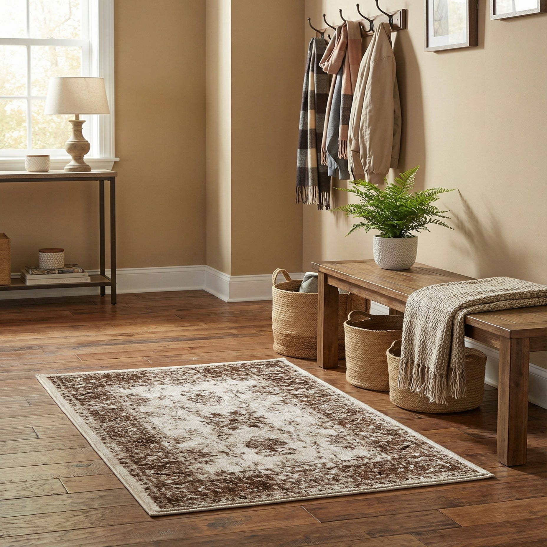 A softly distressed, vintage-inspired pattern gives this rug a lived-in, classic look. A faded medallion and surrounding floral motifs float across a cream field, while a richer brown border and scattered light-brown and beige accents add depth and contrast. The design channels traditional ornamentation with a muted, timeworn finish that pairs well with both modern and more traditional furnishings.