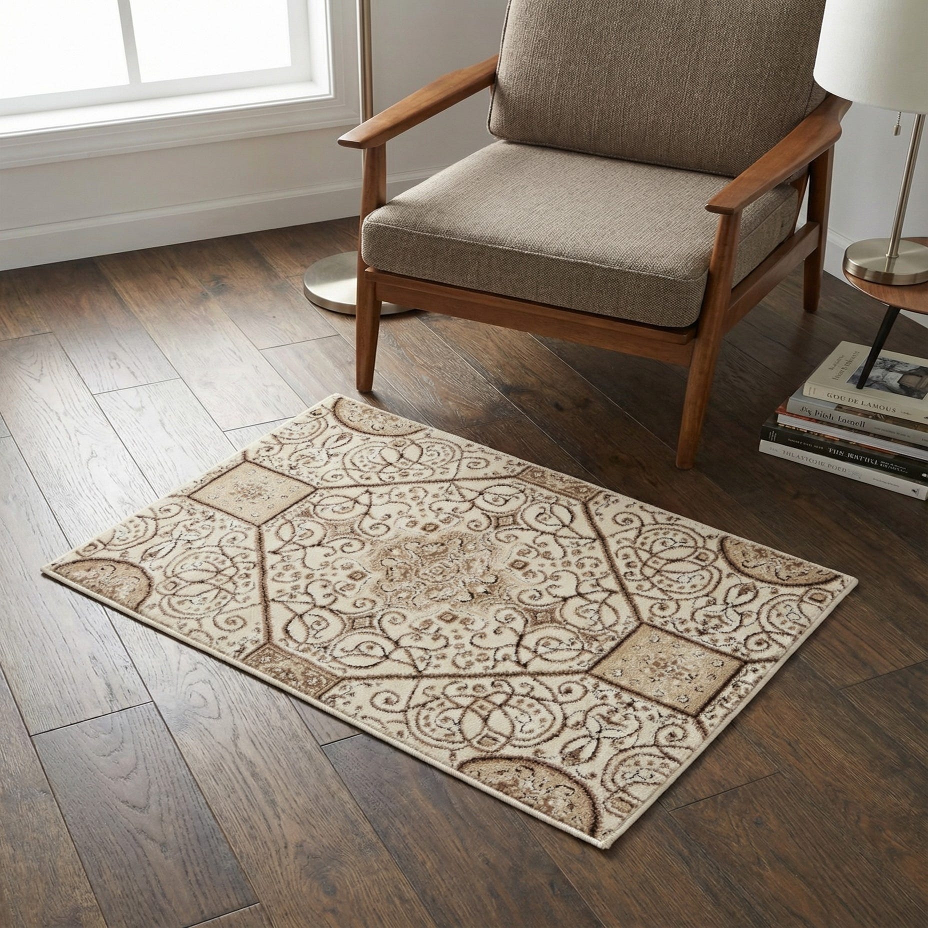 Primary color is Cream. Colors in this rug include: Cream, Brown, Light Brown.