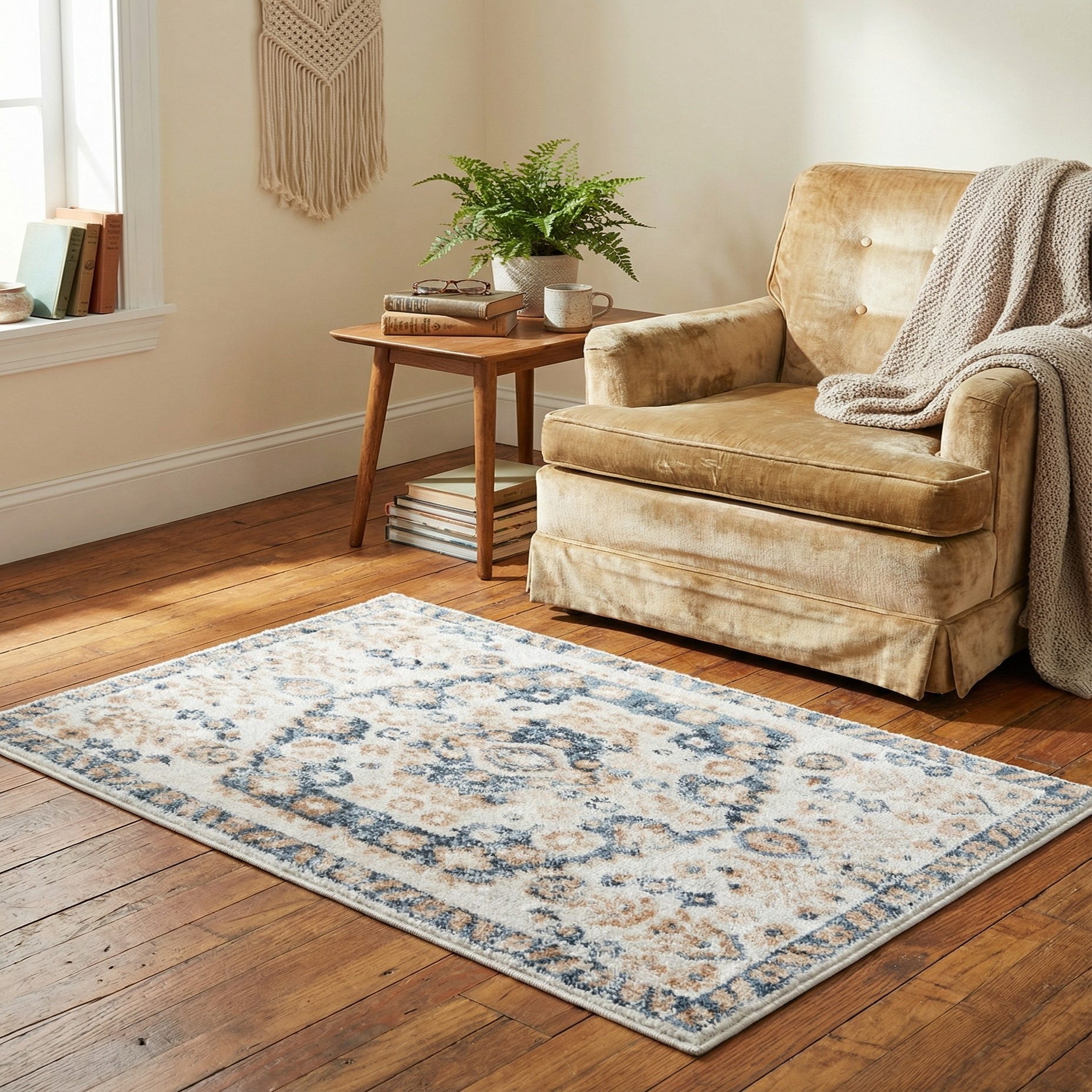 The rug's texture adds a tactile dimension to its visual appeal. Despite its rich patterning, the rug is designed to be stain-resistant and shed-free, ensuring both practicality and longevity.