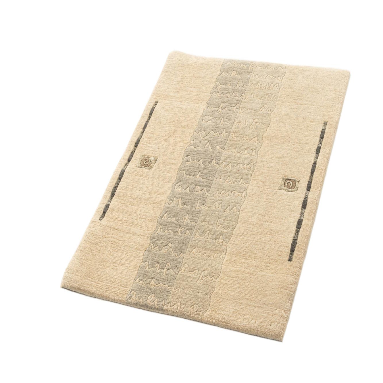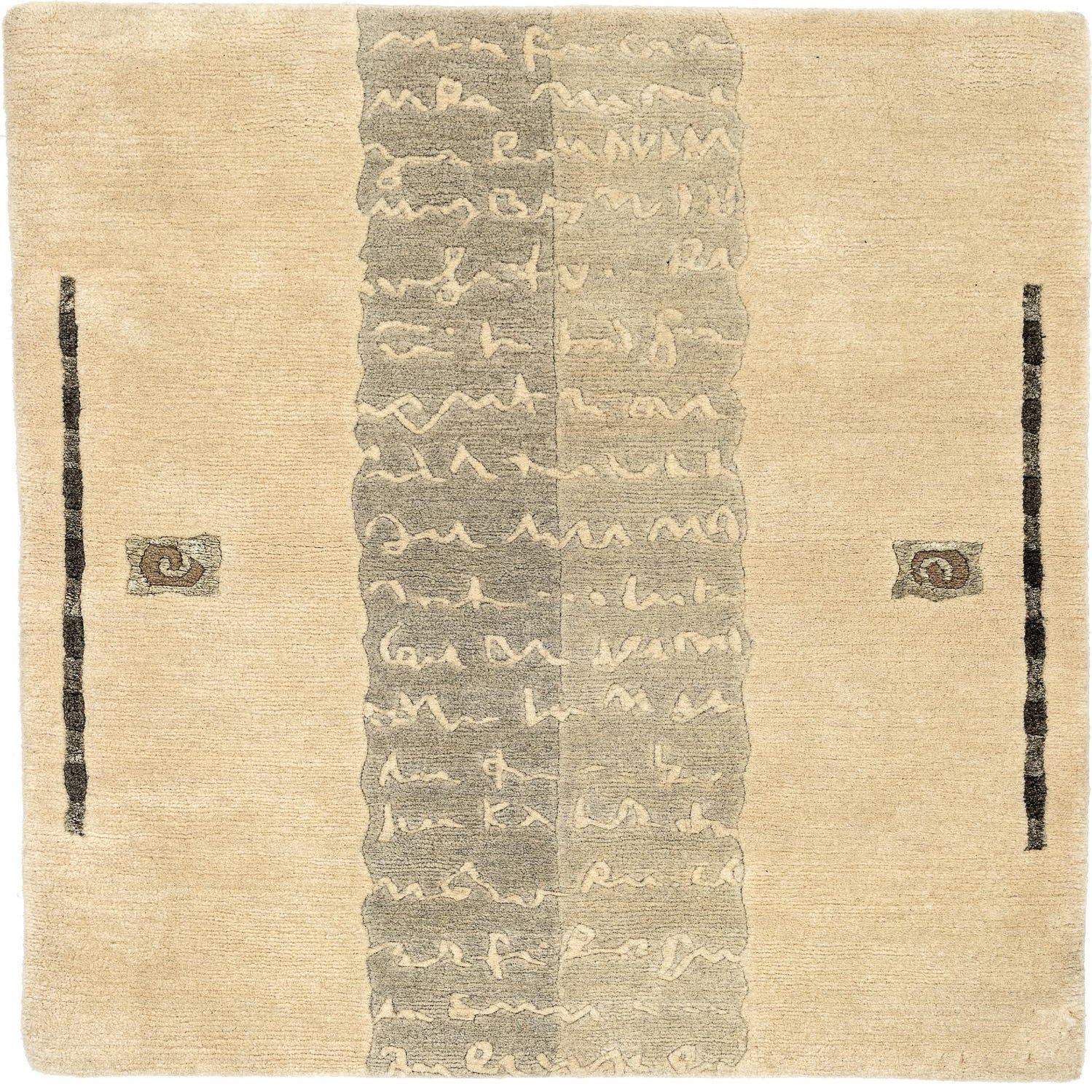 A 2x3 rectangular ivory wool rug featuring a central gray abstract 'script' pattern and dark brown vertical lines on the sides.