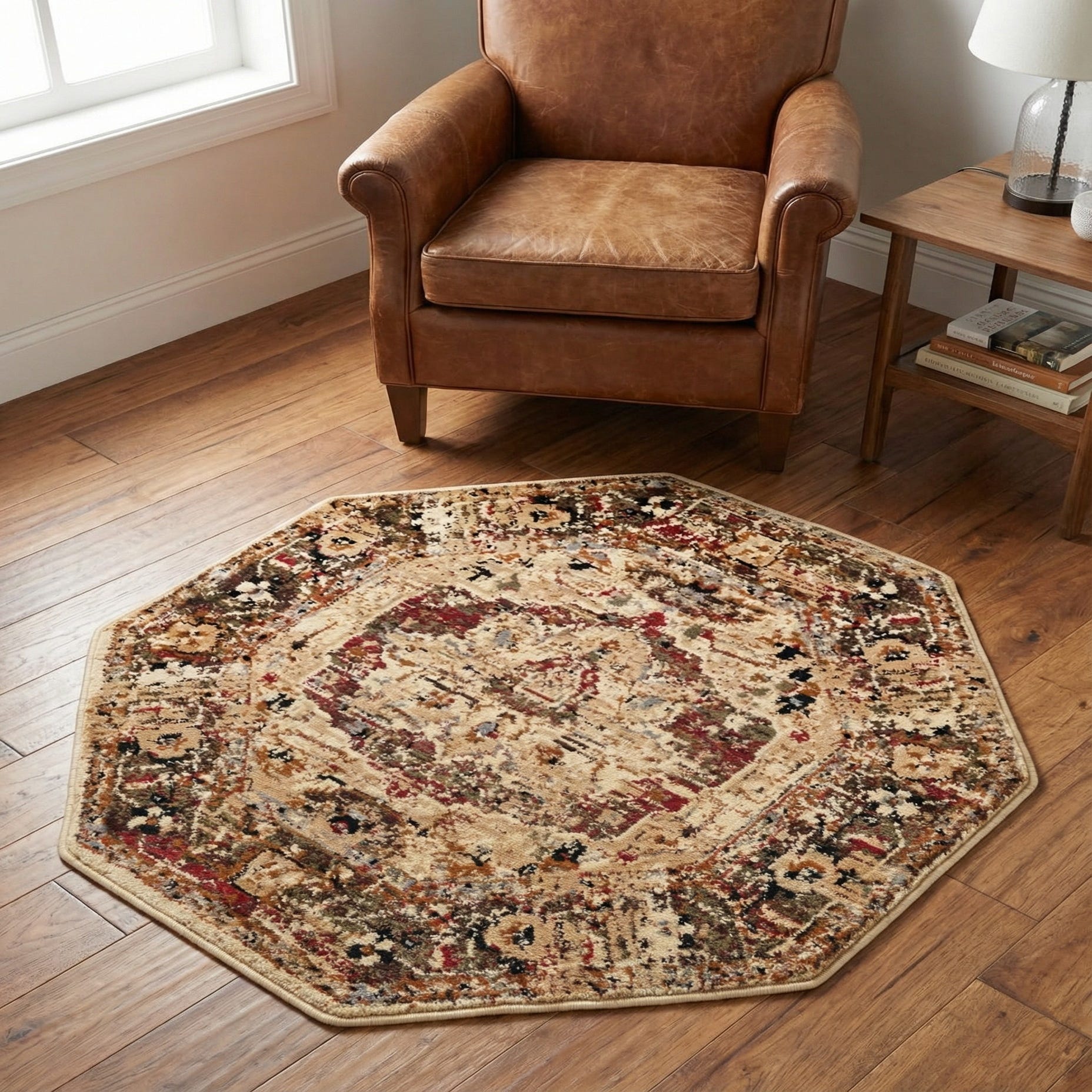 The octagonal shape makes this piece a strong choice for compact, purposeful placements: centered under a small round dining table, anchoring a cozy seating vignette, or positioned in an entryway where the shape becomes a focal point. Its warm color mix pairs well with natural woods, leather seating, and neutral upholstery, and it also complements eclectic layers and antique-inspired furnishings for a lived-in, collected atmosphere.