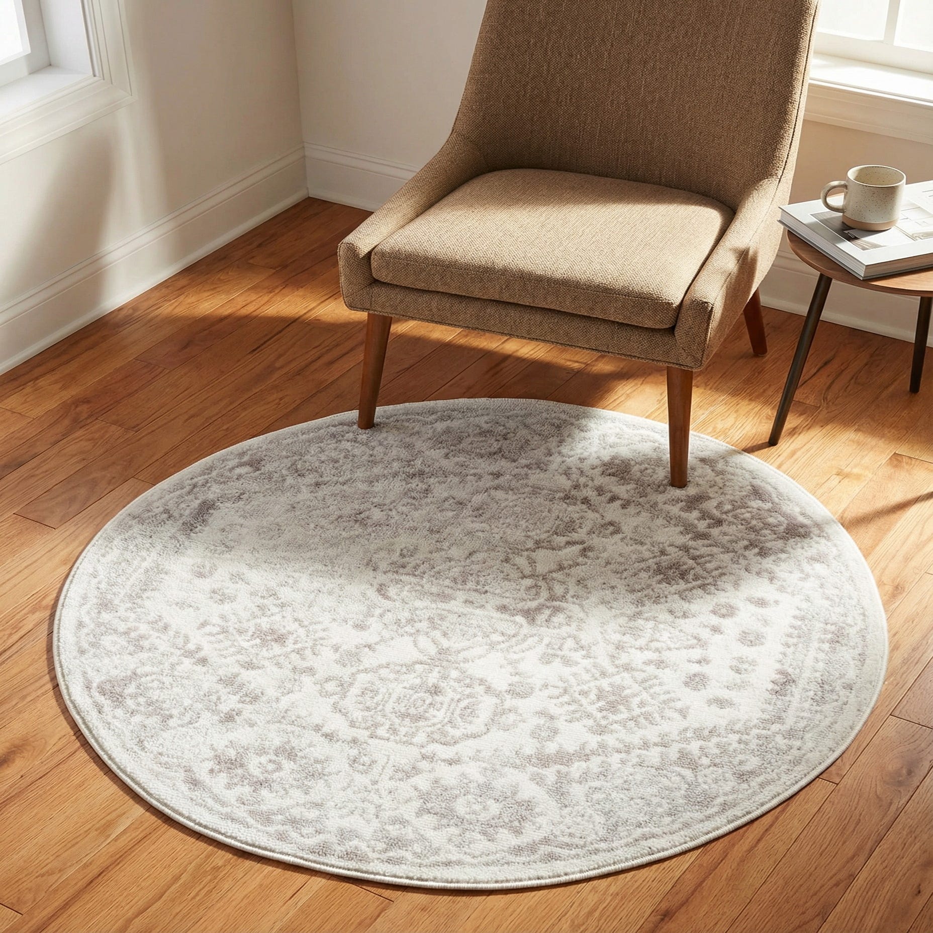 This round shape works well in small, focused areas — think a cozy reading nook, a powder room, or centered beneath a round bistro table. The neutral cream and gray palette pairs easily with light wood tones, linen upholstery, or a soft gray sofa, and it complements modern, farmhouse, or pared-back traditional interiors where you want pattern without overwhelming the space.