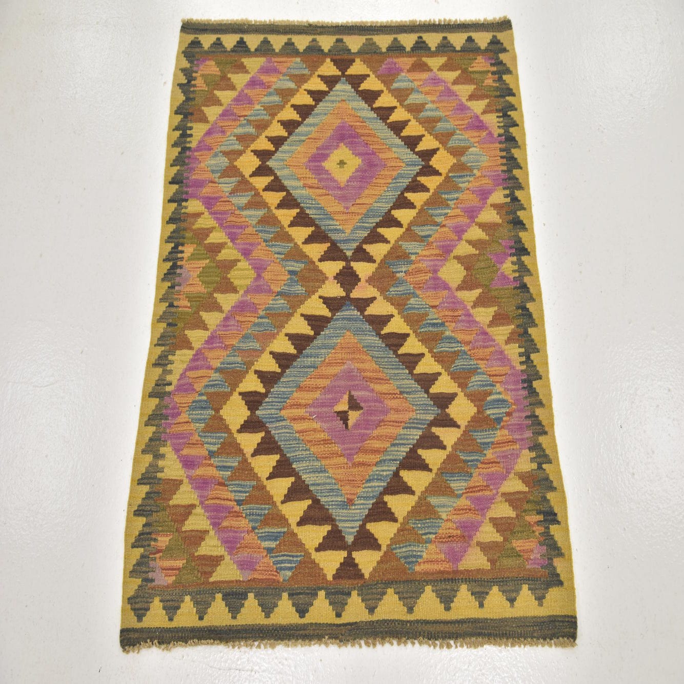 A 3' 0 x 3' 6 square Kilim Maymana wool rug featuring a vibrant Southwestern tribal medallion pattern in ivories, creams, gold, purple, and blue.