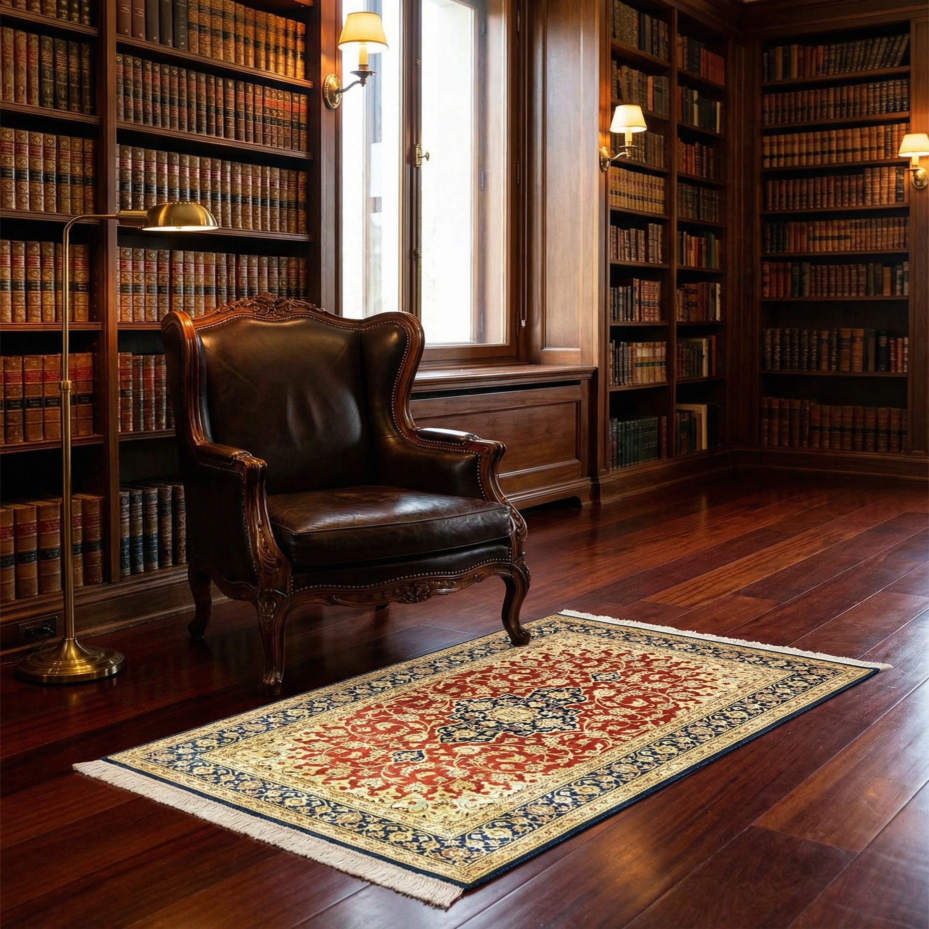 This piece would complement traditional and classical decor, providing a luxurious focal point in a formal living room, dining area, or study. The ornate pattern could also serve as a sophisticated contrast in a more contemporary setting where its classic beauty would add warmth and character. The Ghom Silk rug's rich palette and luxurious texture can seamlessly integrate into a curated space where attention to detail and quality are paramount.