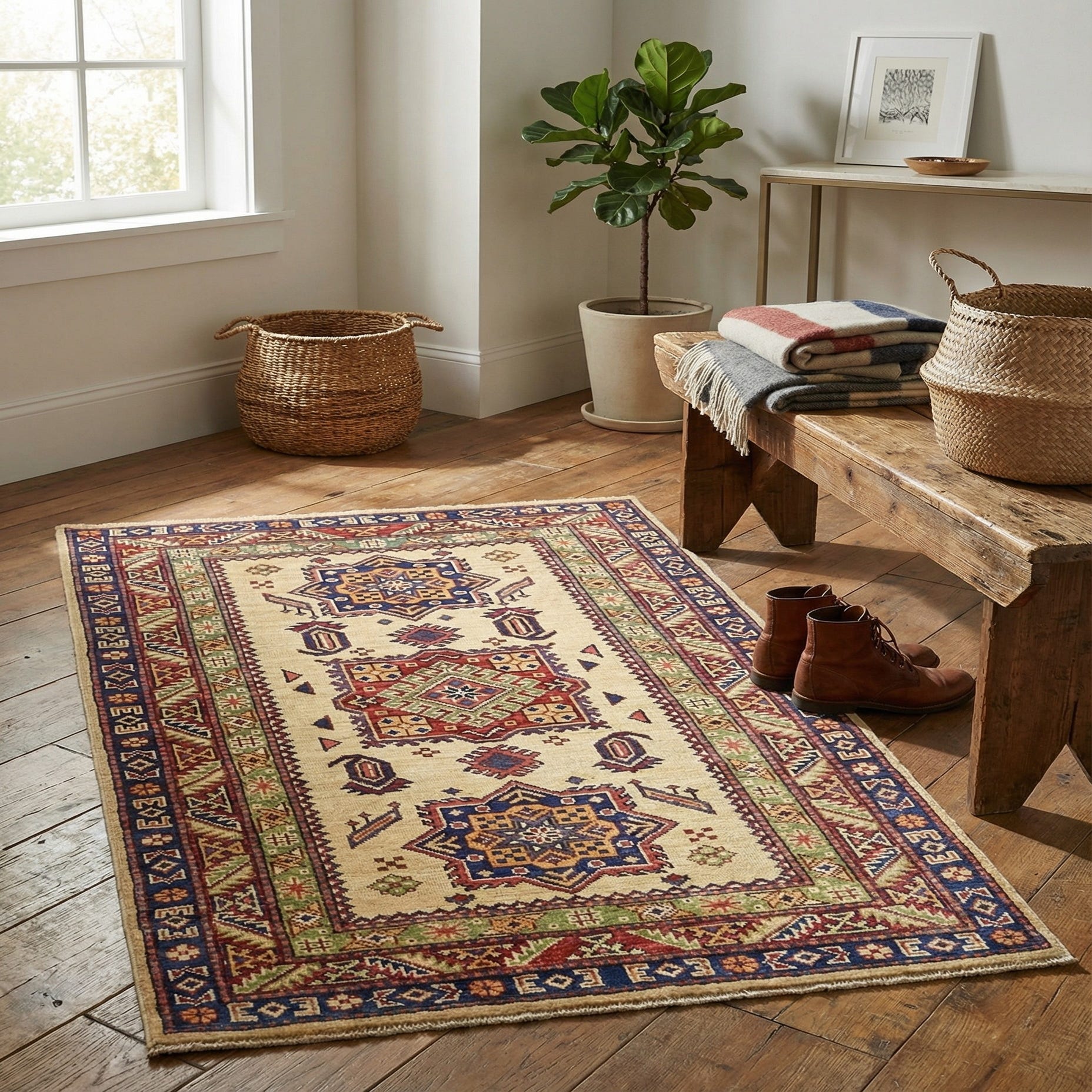 A 3x4 rectangular ivory rug with a traditional tribal medallion pattern in red, blue, green, and gold.