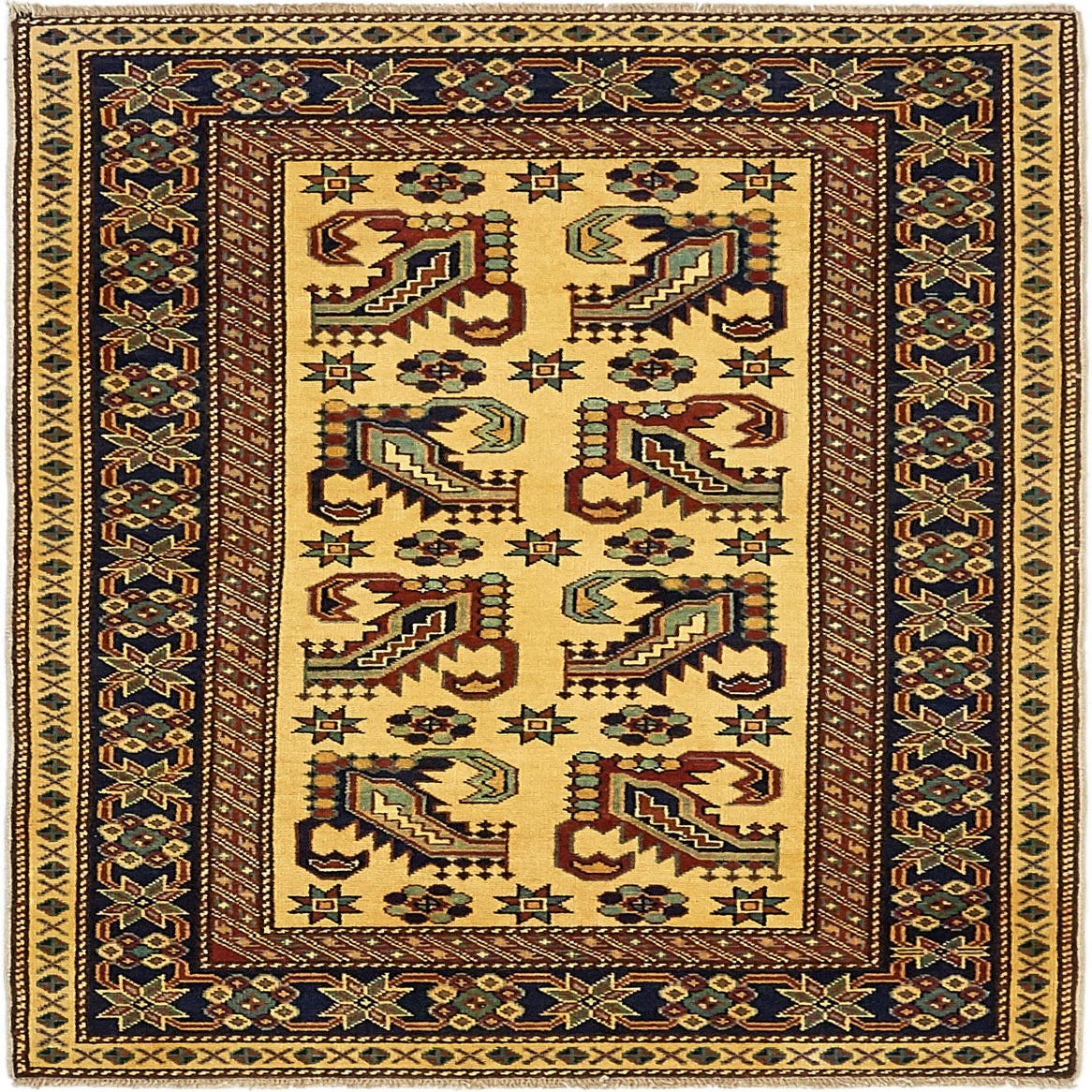 A 3x4 rectangular ivory rug with a traditional tribal pattern and a dark blue border, handmade from wool.