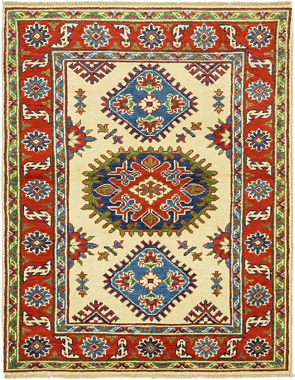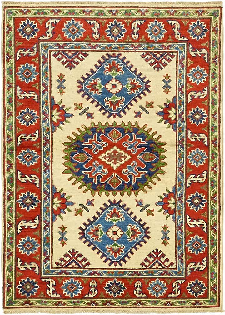 This Kazak collection rug, measuring 3x4, is a testament to the enduring craftsmanship of hand-knotted rugs. Constructed from 100% hand-spun wool, this rug showcases a cream background that beautifully accentuates its intricate pattern. The design features a symmetrical display of geometric motifs that draw inspiration from traditional Kazak patterns, incorporating a vibrant palette of red, navy blue, blue, olive, and touches of green.