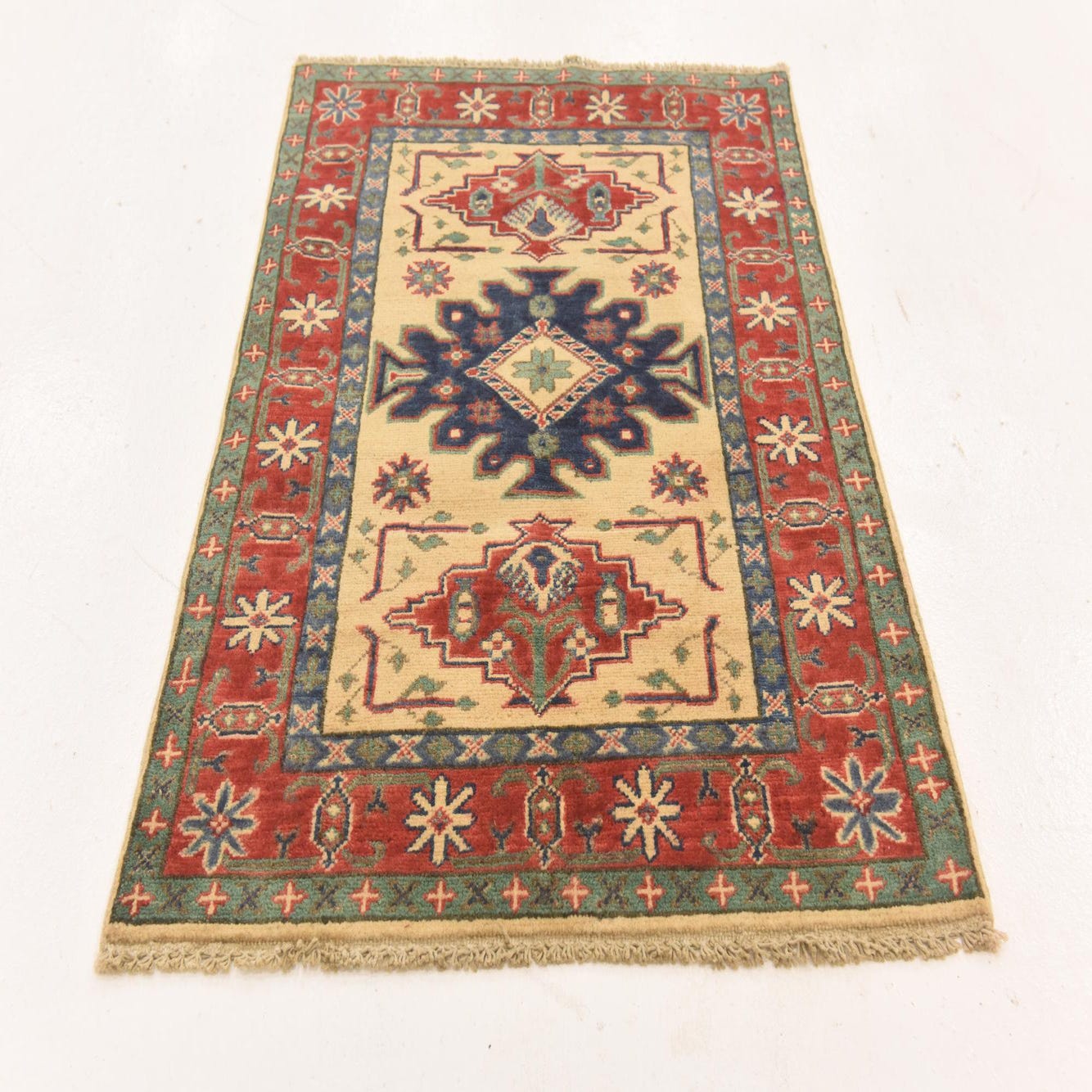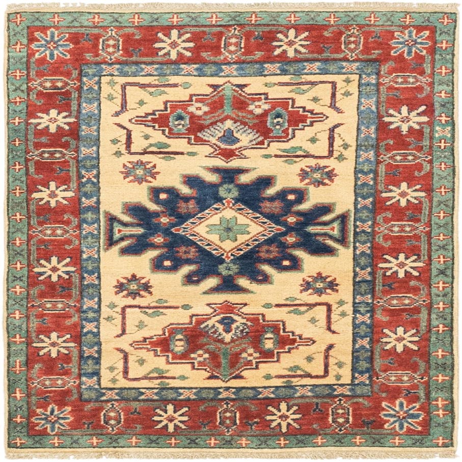 A 3x4 rectangular Rugs.com Kazak rug with a cream field, red border, and tribal medallion patterns in navy, red, and green.
