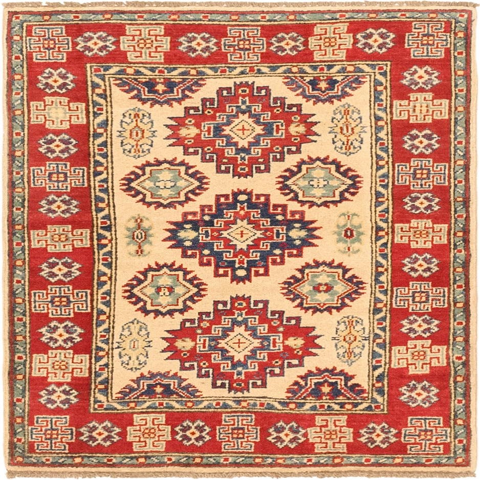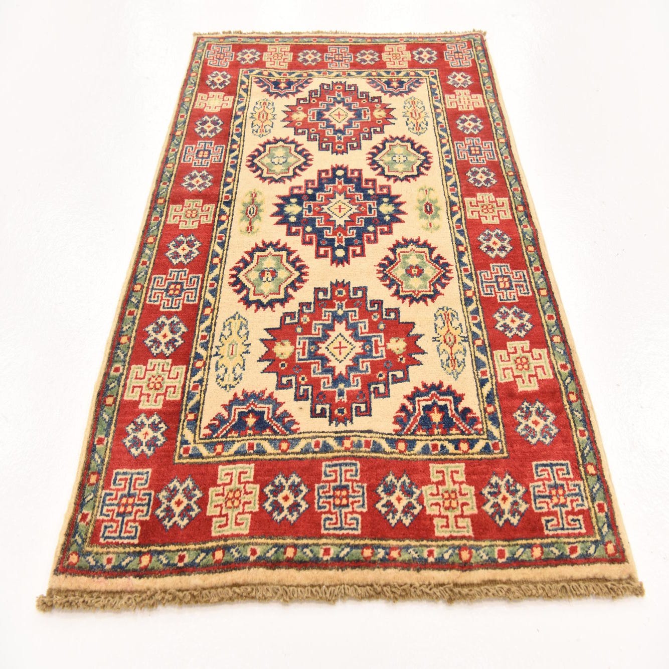 A 3x4 rectangular Rugs.com Kazak rug with a cream field, red border, and tribal medallion patterns.