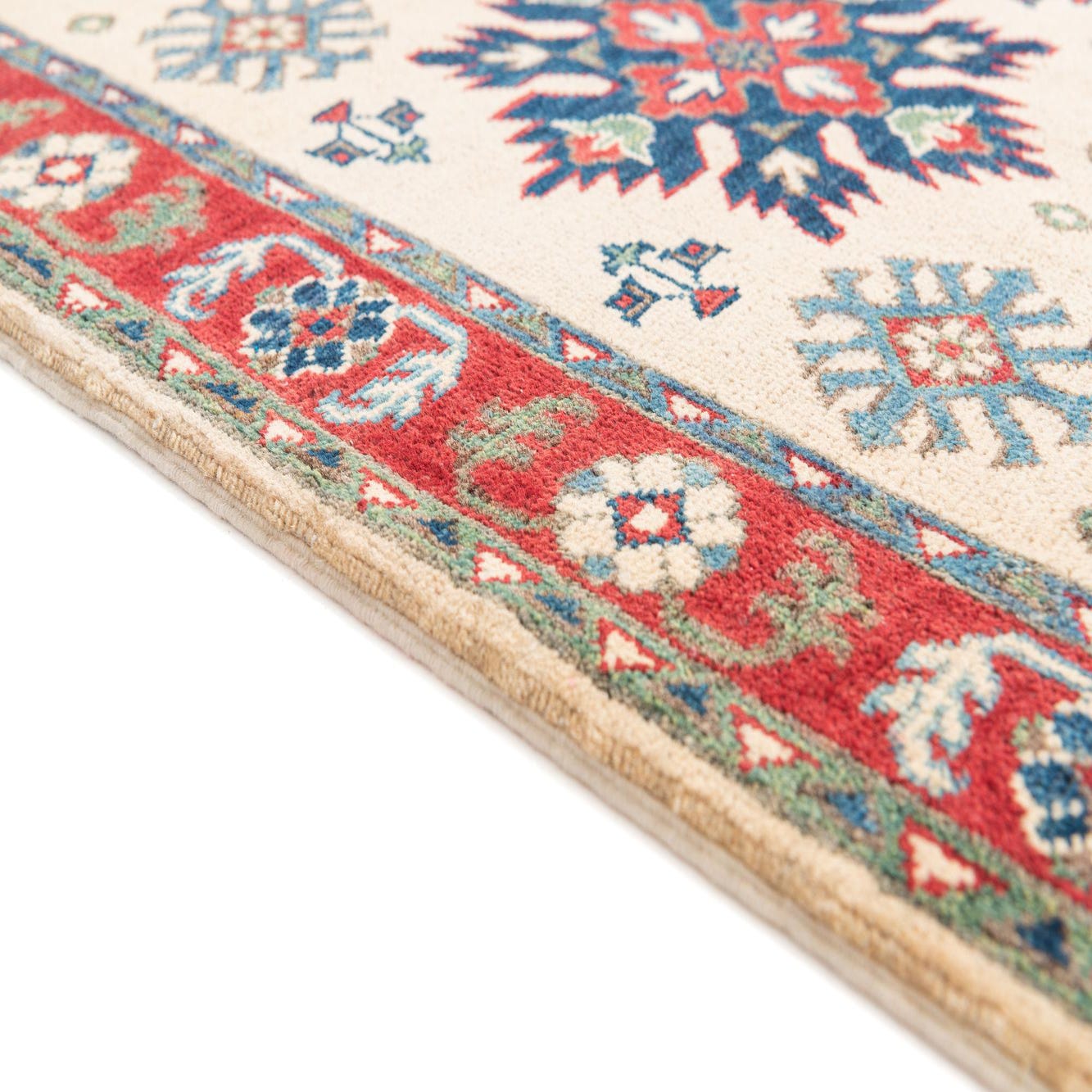 The Kazak Collection rug is a handcrafted piece measuring 3x4, woven from 100% hand-spun wool which contributes to its durable and plush texture. This rug presents a rich, geometric pattern with a traditional aesthetic featuring a cream background accented by an alluring array of colors, including blue, brown, navy blue, red, and green. The design incorporates symmetrical motifs that give it a sense of balance and harmony.