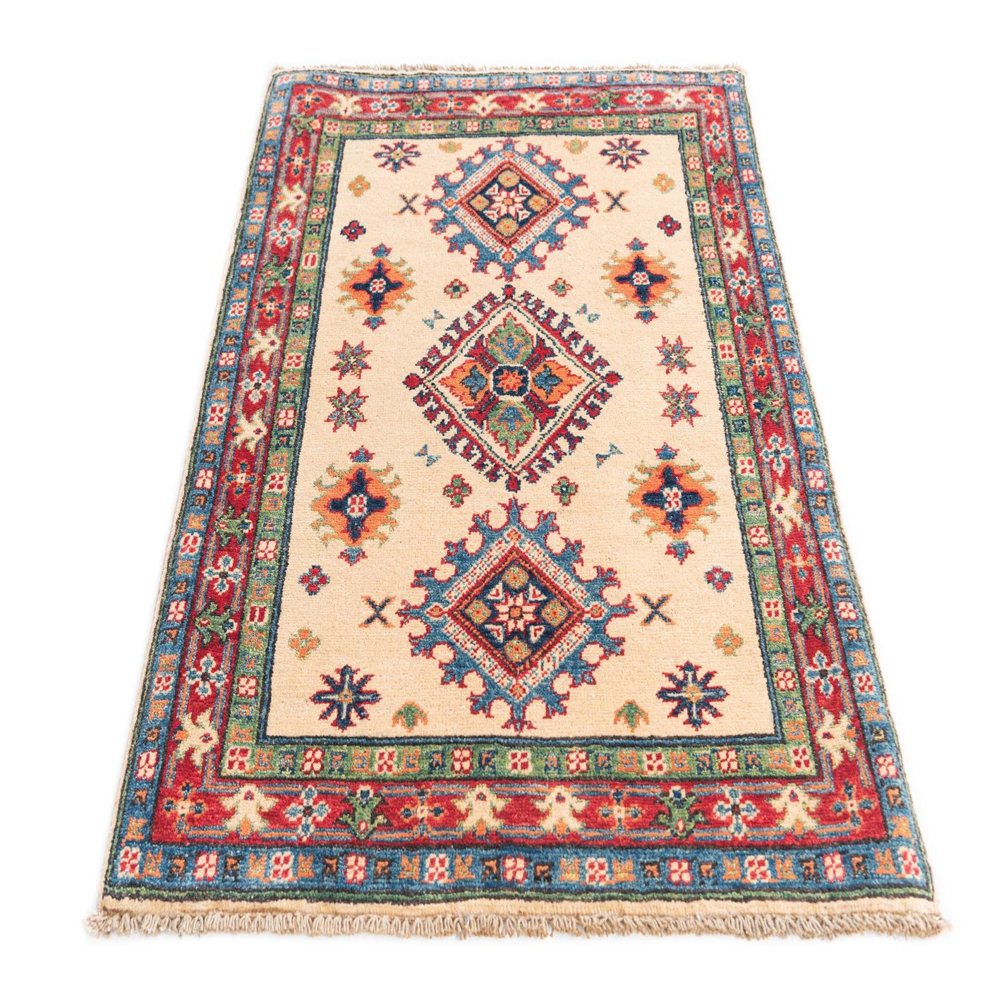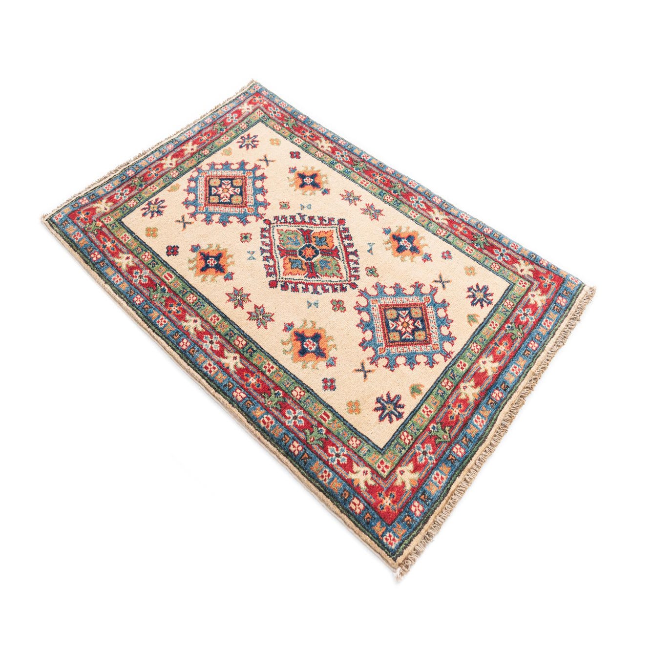 A 3x4 rectangular Rugs.com Kazak rug with an ivory field, featuring traditional Southwestern and Oriental patterns in red, blue, green, and orange.