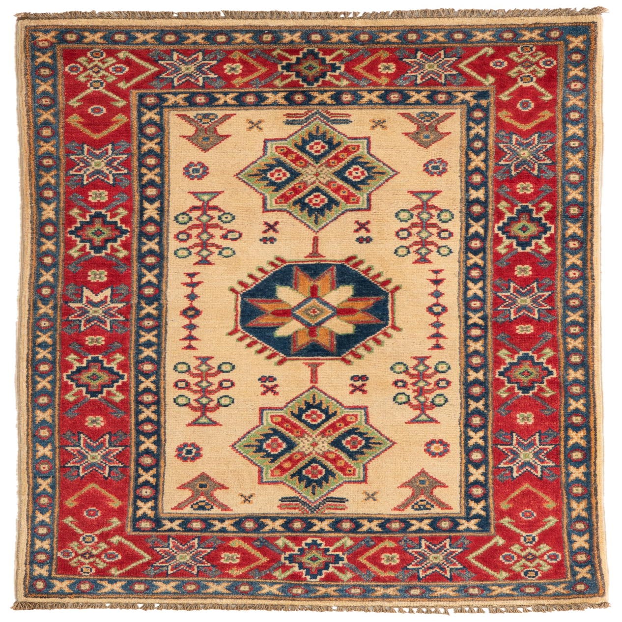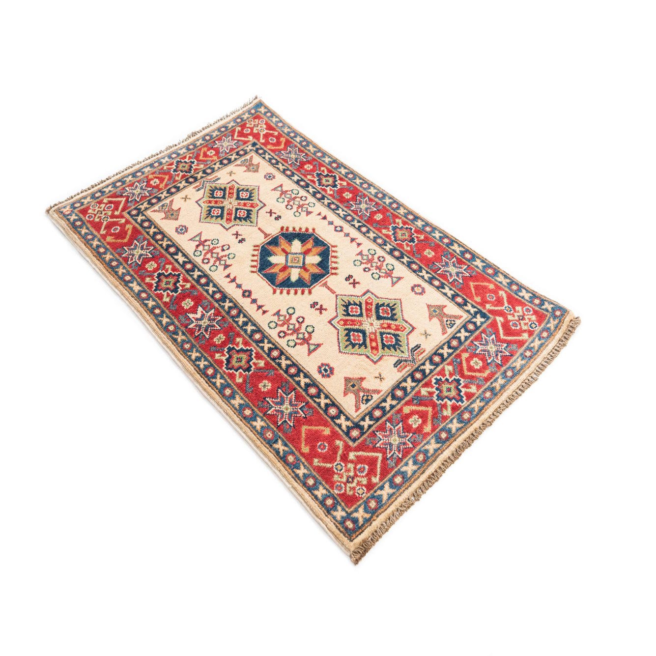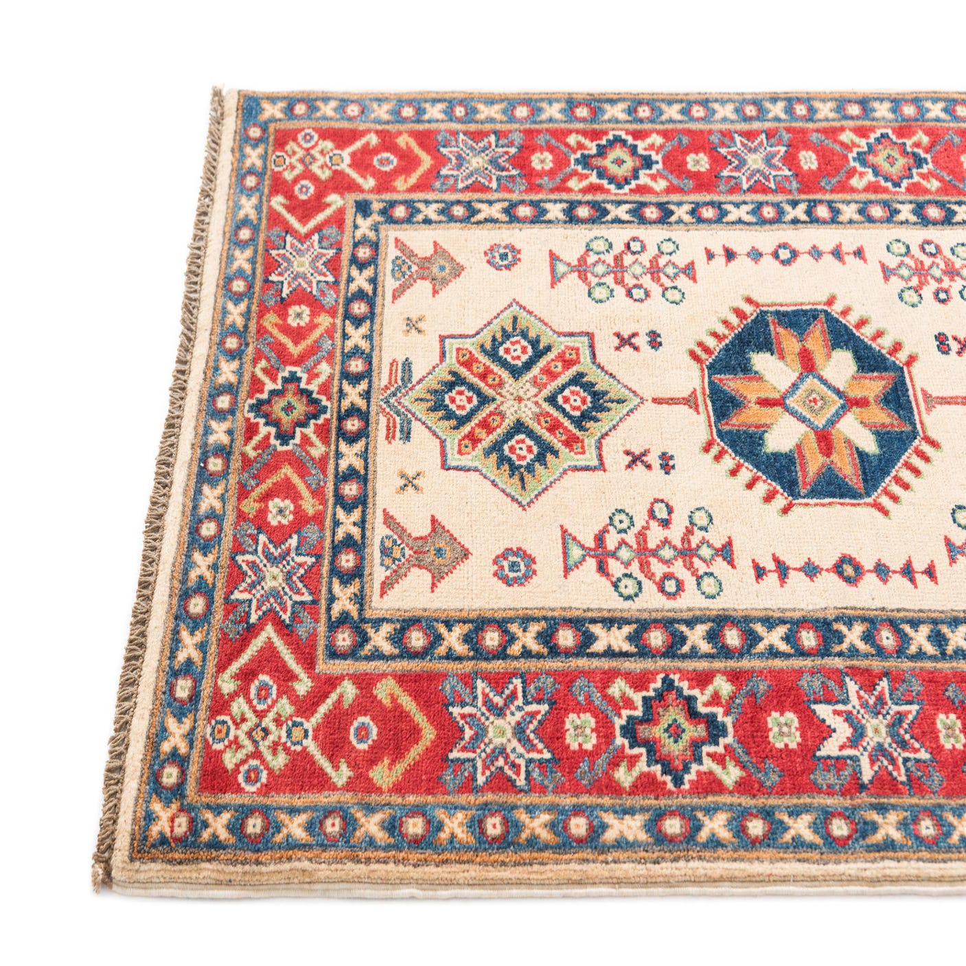This Kazak collection rug is a hand-knotted piece measuring 3x4, crafted from 100% hand-spun wool for a robust and textured feel. It features a striking geometric pattern enriched with hues of cream, blue, brown, green, navy blue, and red, against a warm cream background that allows each color to pop. Traditional motifs adorn the field and borders, with intricacies that showcase the artisan's skill.