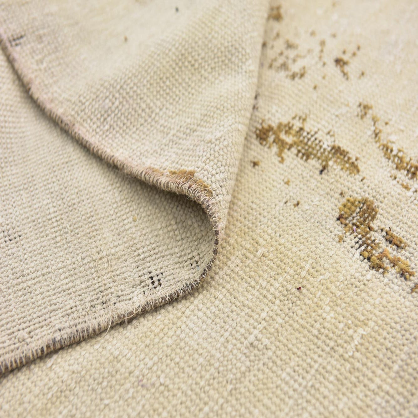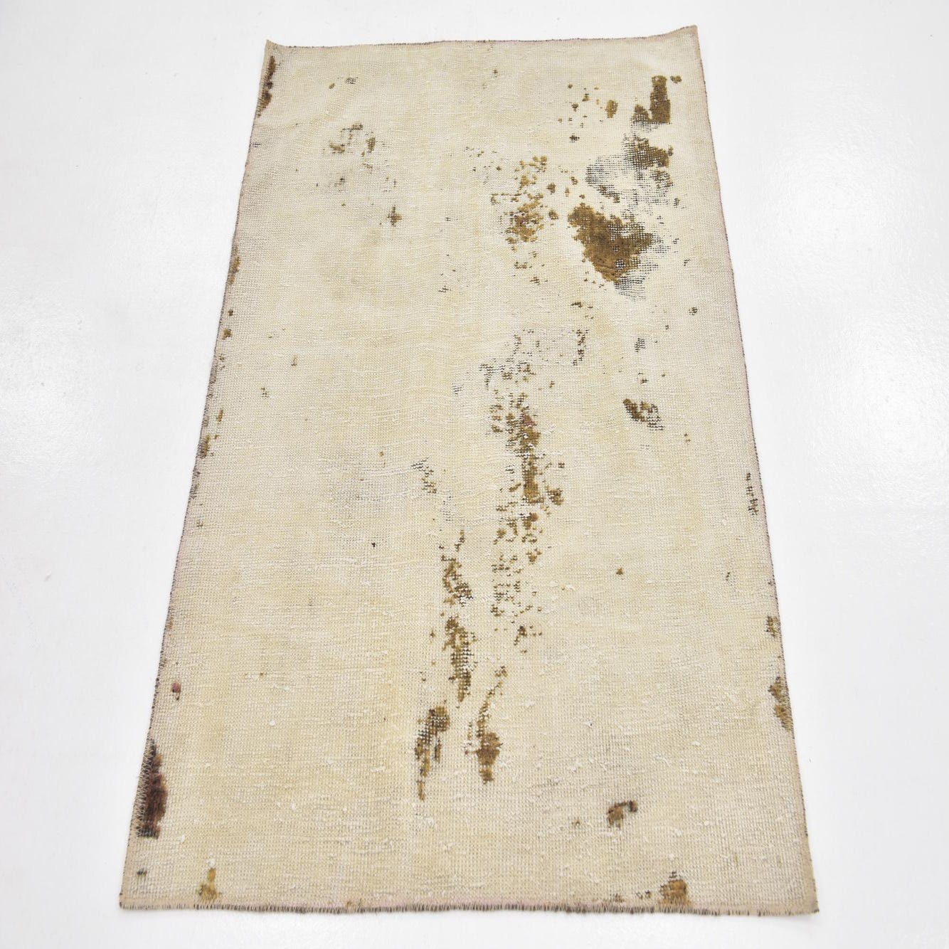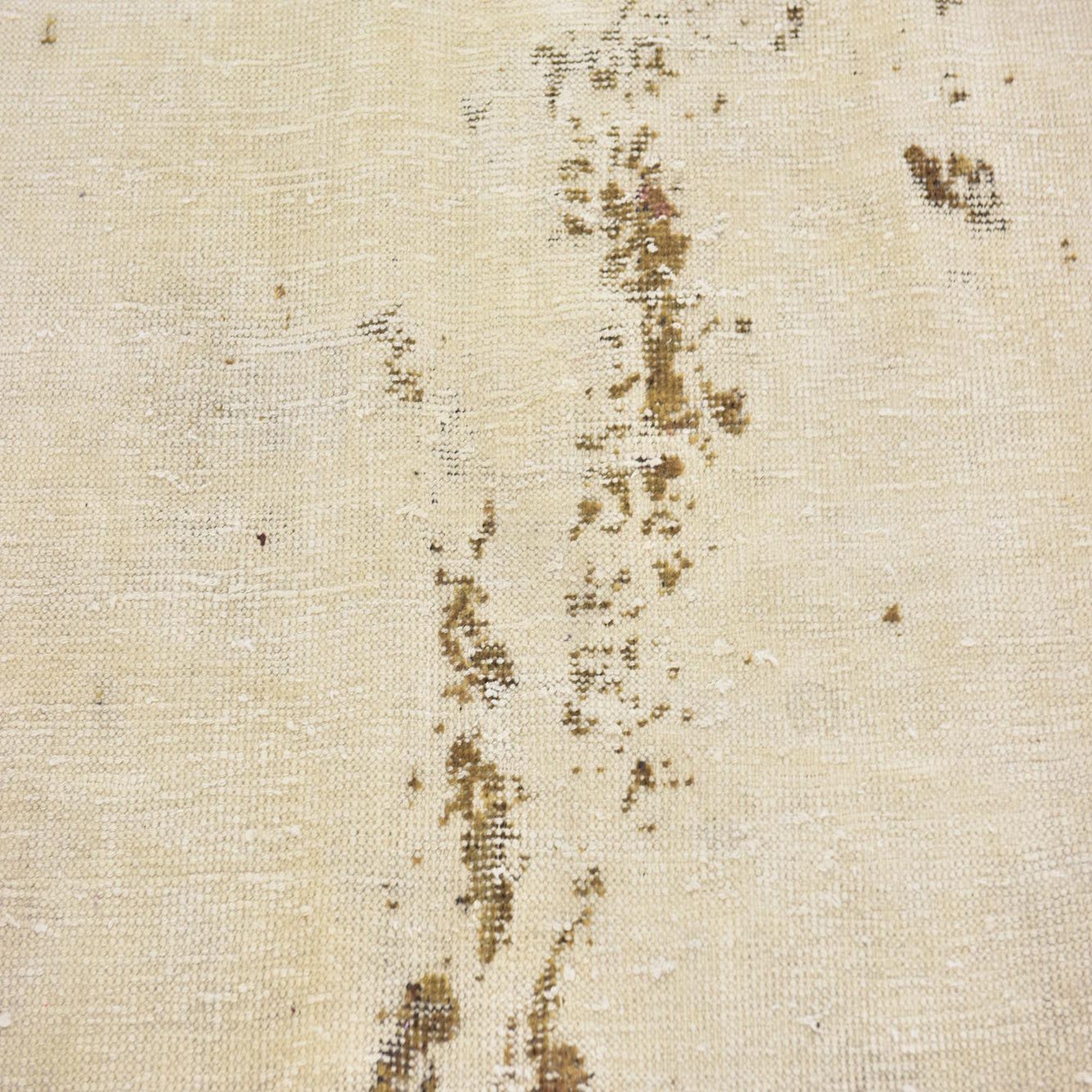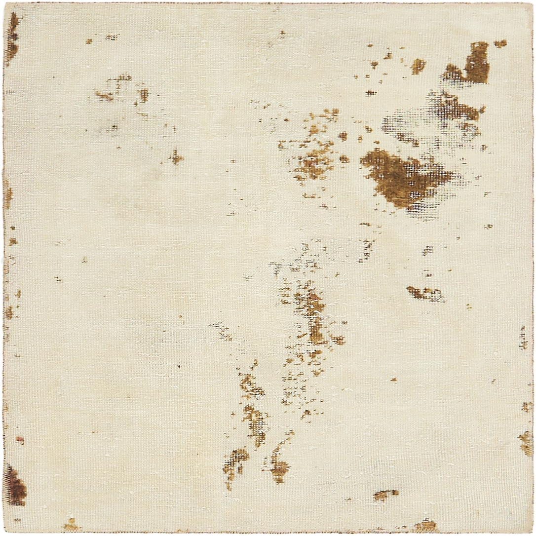 A 3x4 rectangular ivory wool rug with a distressed vintage Persian pattern, featuring subtle brown accents.