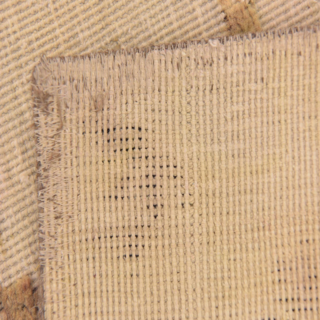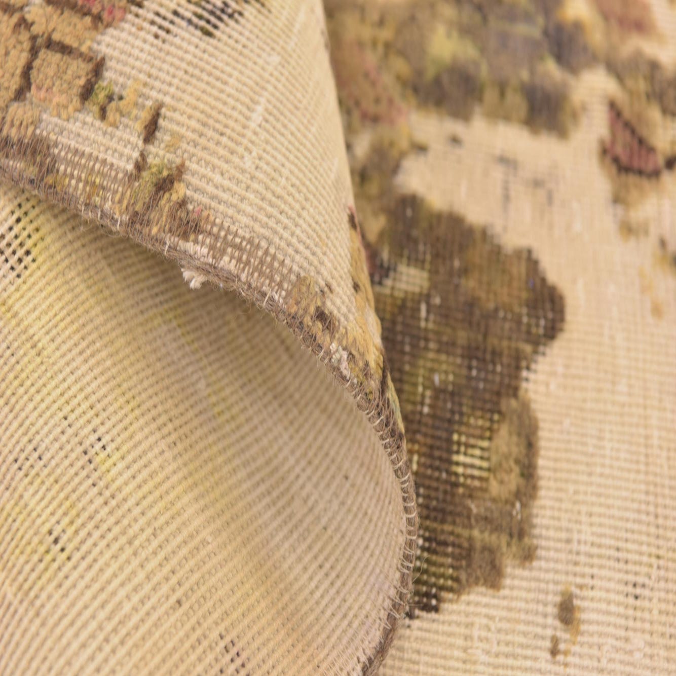The Ultra Vintage collection offers a 3x4 hand-knotted rug crafted from 100% wool, presenting a durable and textured feel underfoot. This rug showcases an organic pattern with an intriguing distribution of color that includes cream, beige, brown, and olive, set against a cream background. The design is reminiscent of a weathered and distressed look, which adds character and a sense of history to the piece.