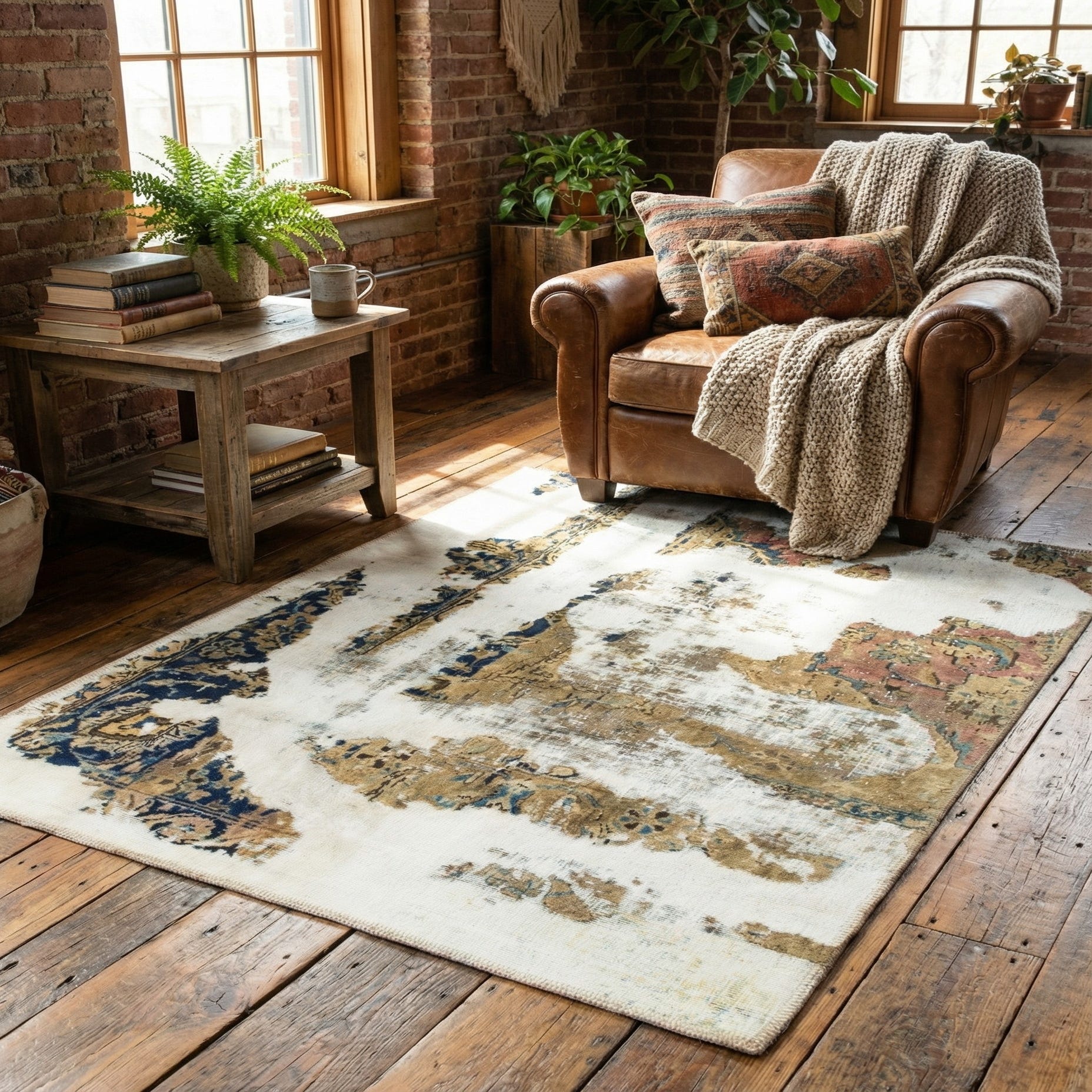 The pattern of the rug is thoughtfully designed with a blend of traditional motifs and a weathered appearance, contributing to a sense of historical depth and contemporary elegance. This combination results in a unique aesthetic that can bridge classic and modern decor styles.
