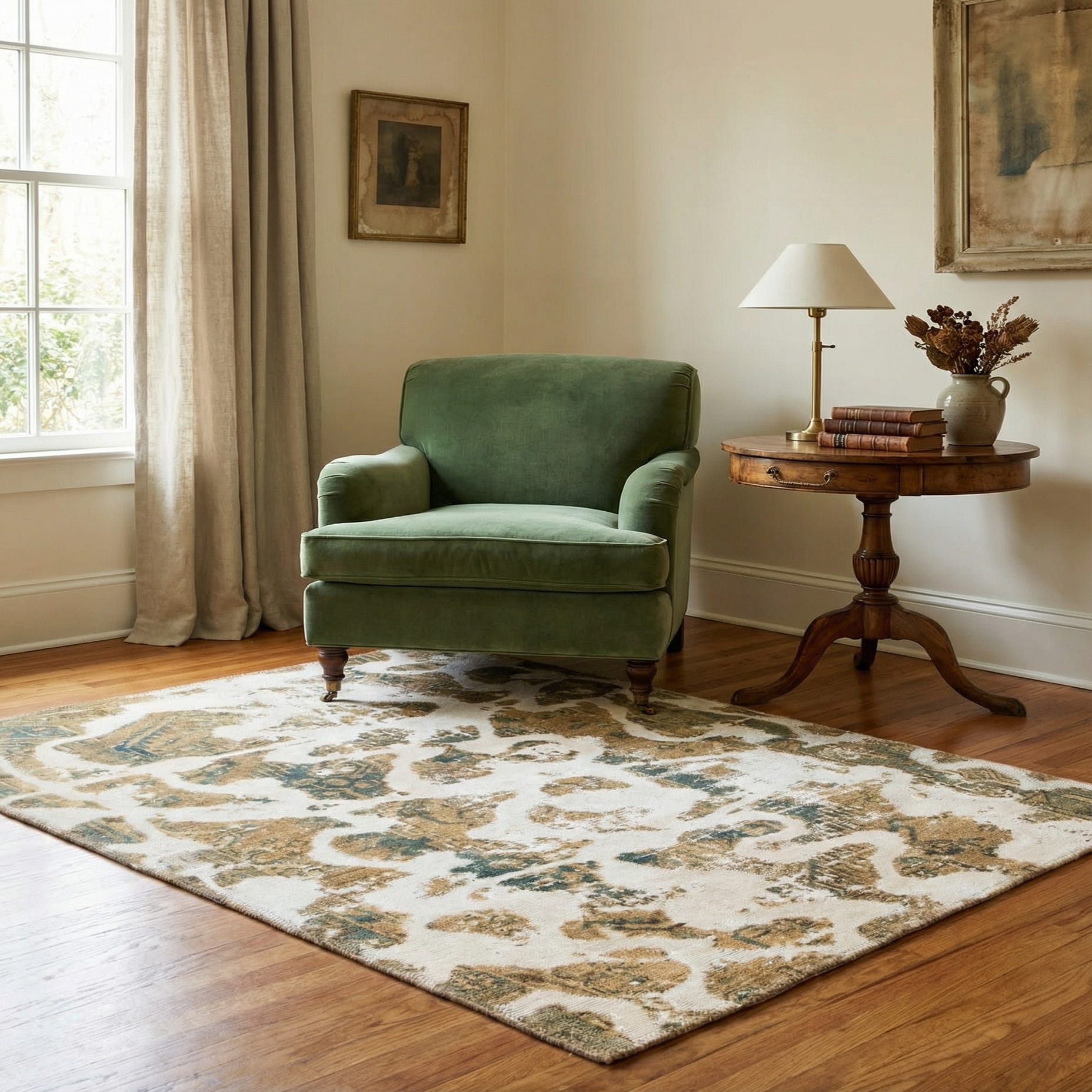 This rug works well as an anchor in a cozy living room, layered beneath a small coffee table or placed at the foot of a bed to bring subtle pattern and warmth to the space. It pairs naturally with warm wood furniture, leather seating, linen upholstery and aged brass accents, and fits both relaxed modern and transitional interiors—also a good choice for an entry or reading nook where you want a vintage-inspired look without heavy color.