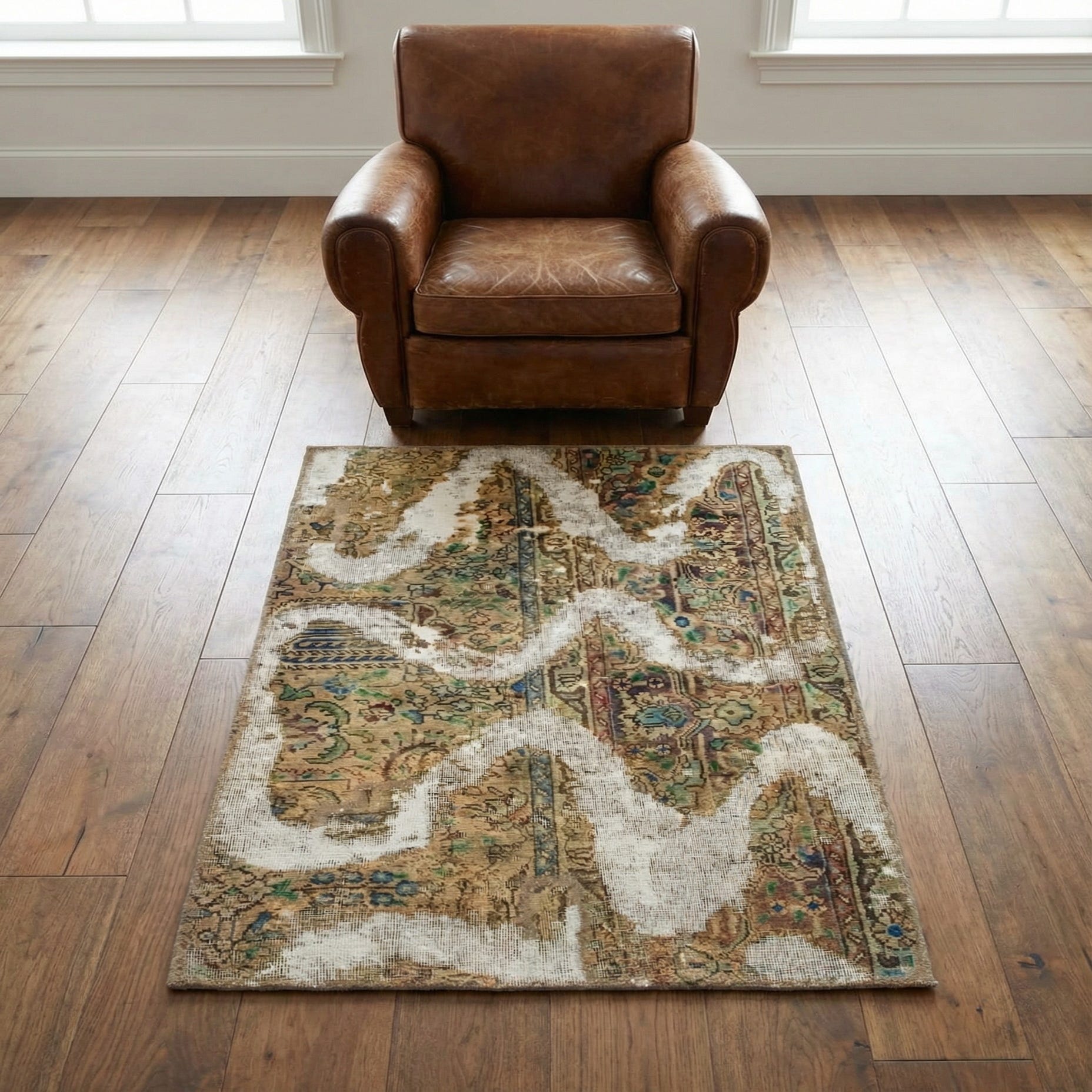A worn-traditional field of floral and vine motifs sits on a cream ground, worked in warm browns, light brown and olive with touches of green, gray and rust red. The antique-inspired pattern is intentionally faded in places and overlaid with broad, organic cream washes that soften the design and create a layered, lived-in effect. The combination of classic medallion elements and painterly streaks gives the rug a balanced mix of old-world character and contemporary abstraction.