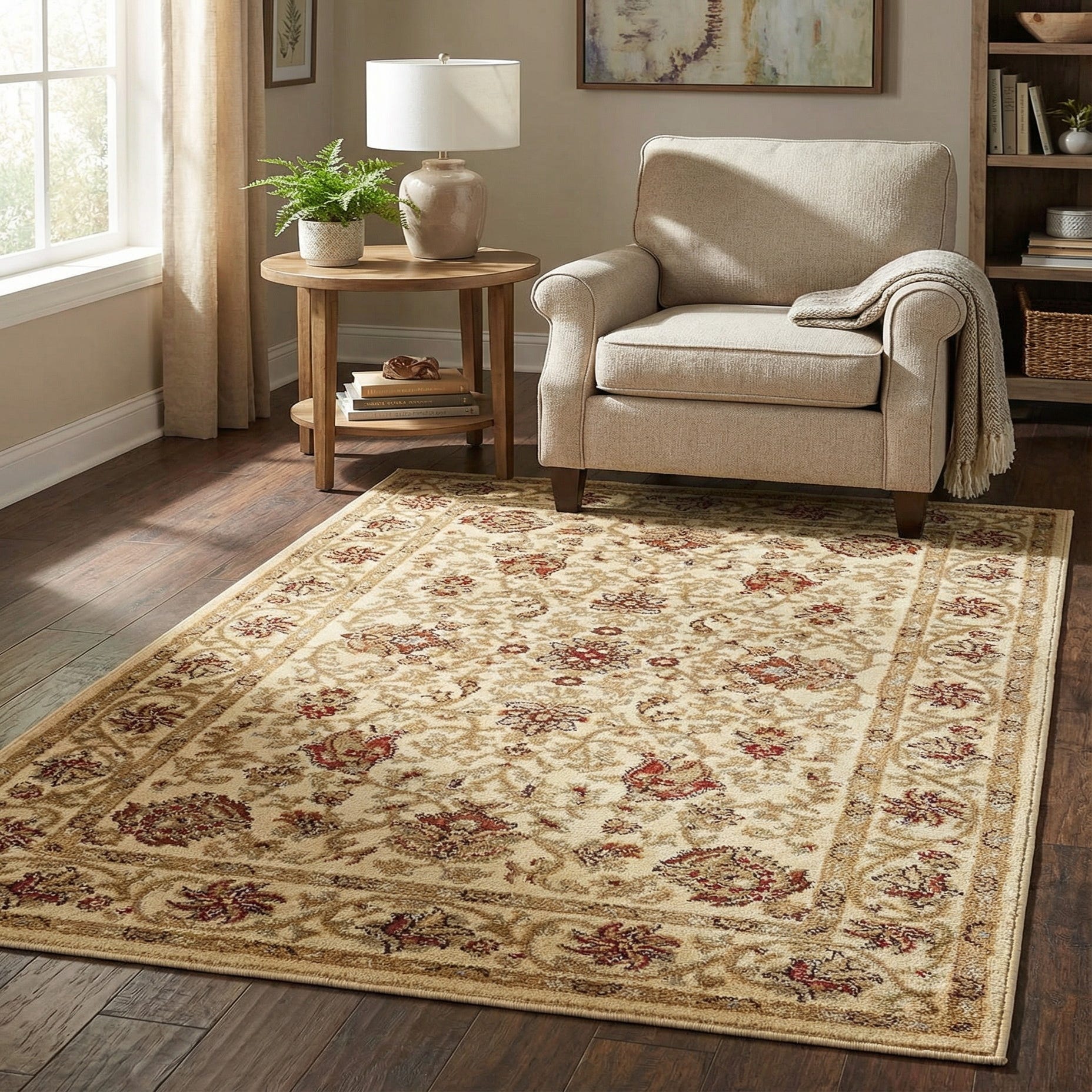 Machine-made from 100% polypropylene, the rug has a low-profile, tightly looped pile that feels smooth underfoot and holds its shape well. Its compact texture makes it a practical choice for entryways, small seating areas, or layered in front of a sofa or bed. Pair it with warm wood tones and neutral upholstery for a traditional setting, add teal or light-blue accent pillows and peach throws to pull color through the room, or use it to soften a modern transitional space where classic patterning adds visual interest without competing with contemporary furnishings.