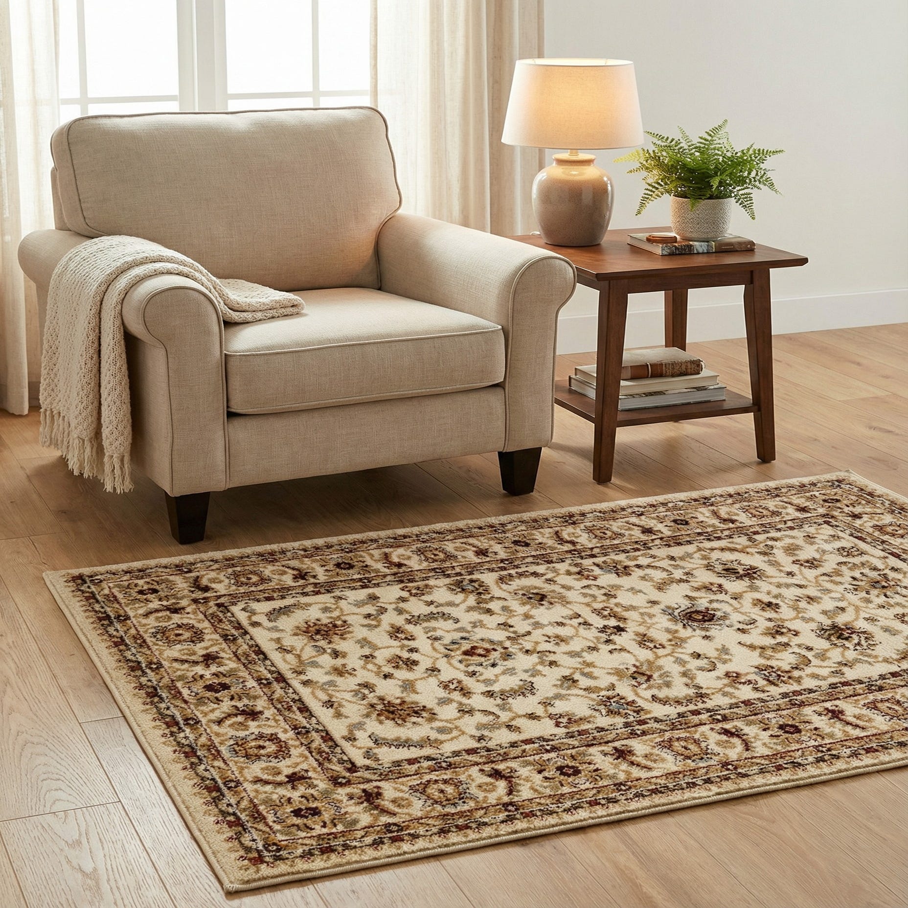 A soft cream field provides a calm backdrop for a classic floral-and-vine motif rendered in warm browns, rust-red accents, tan and muted greens with touches of light blue and red. The design centers on symmetrical palmettes and scrolling vines, framed by a narrow inner border and a wider outer guard border peppered with small floral rosettes. Machine-made from 100% polypropylene, the construction produces a low-to-medium pile with a lightly textured surface that keeps the pattern crisp while feeling pleasant underfoot.